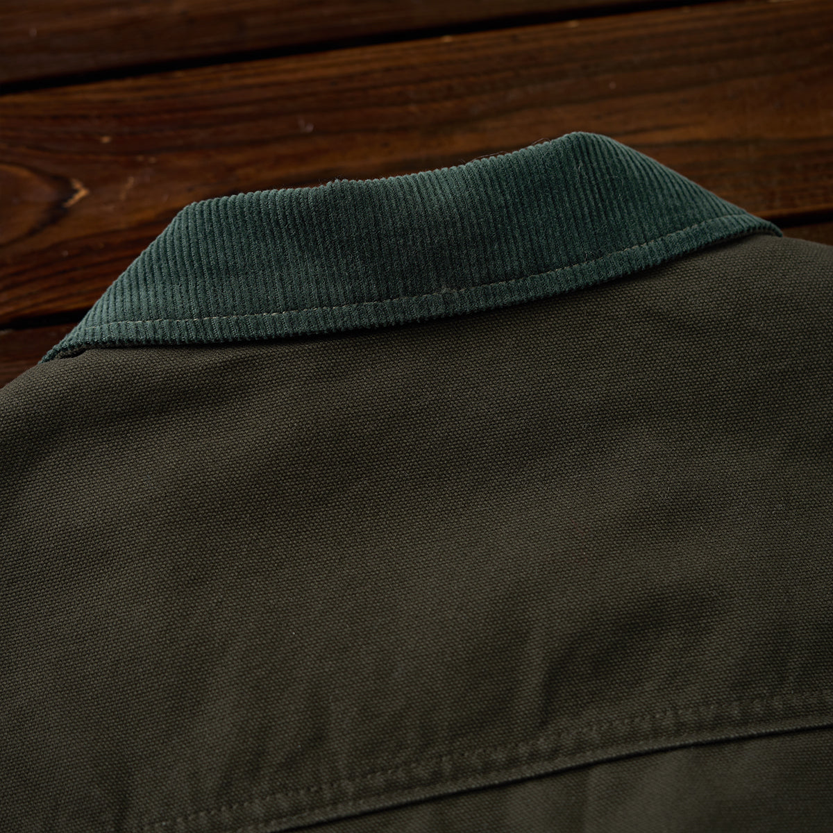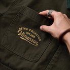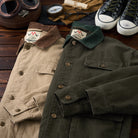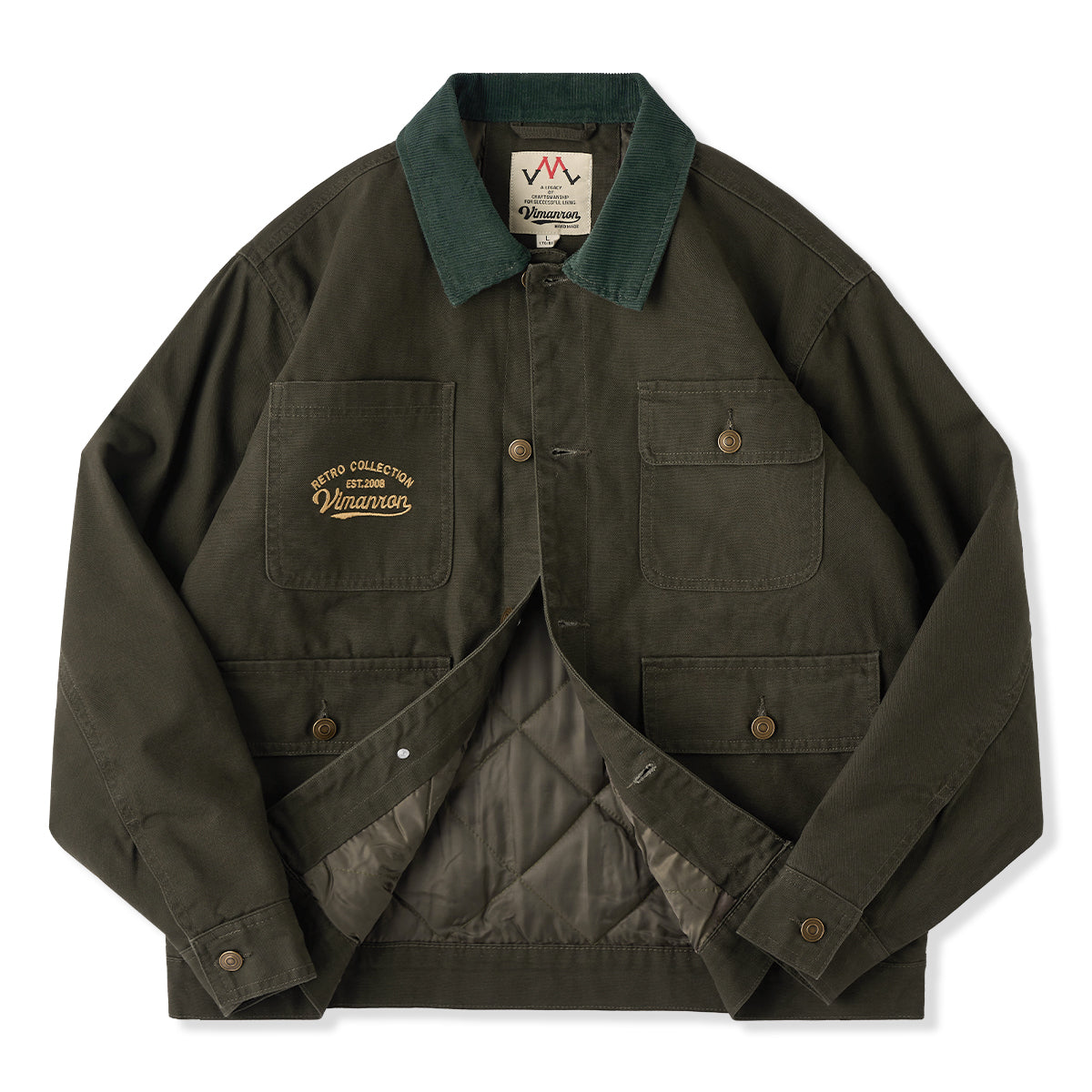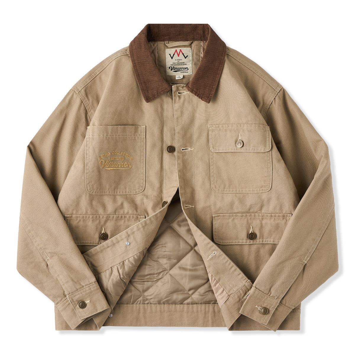 코듀로이 칼라 포인트에 4개의 포켓과 가슴 자수 디테일을 더해, 실용성과 빈티지 무드를 모두 담은 솜 안감 헌팅 자켓입니다.