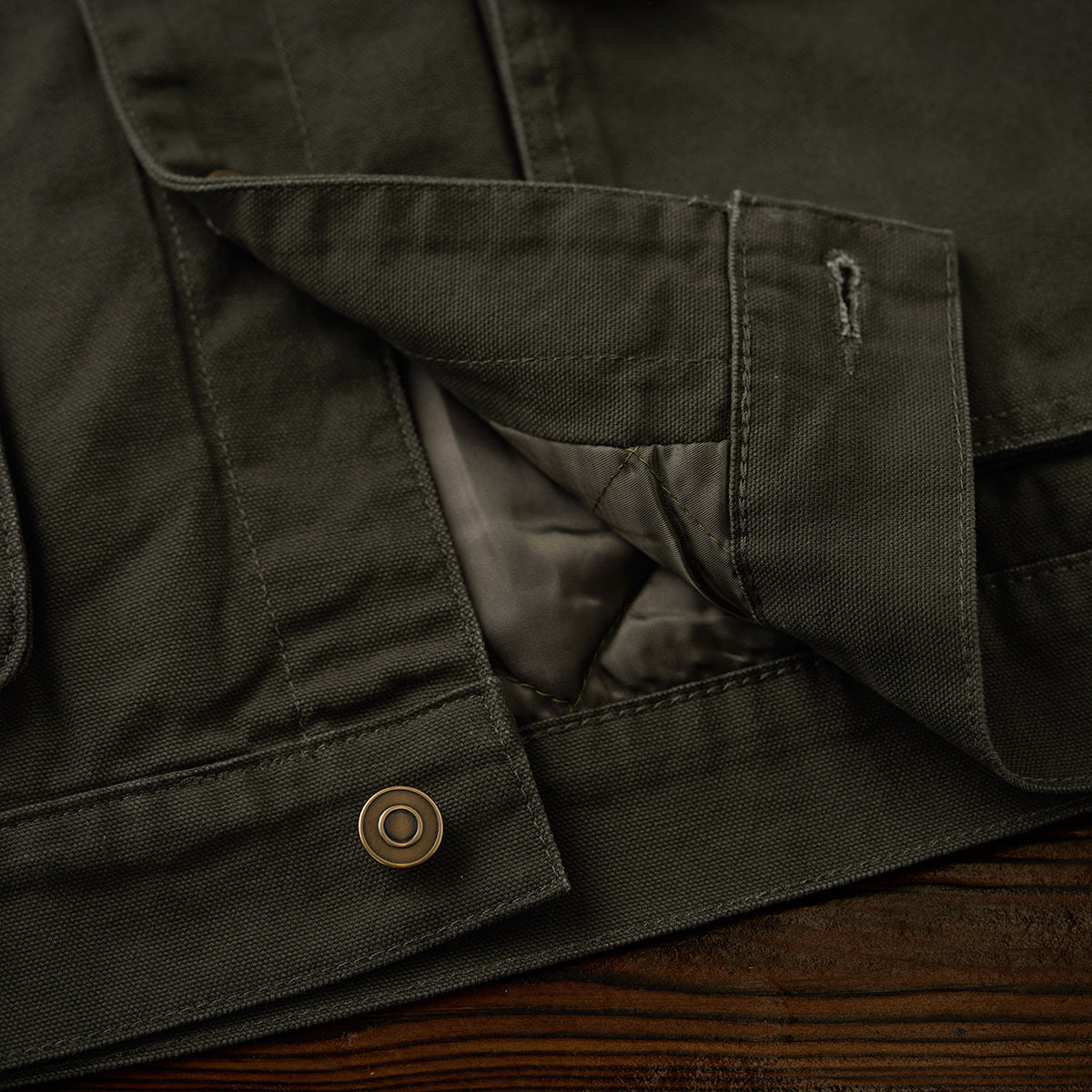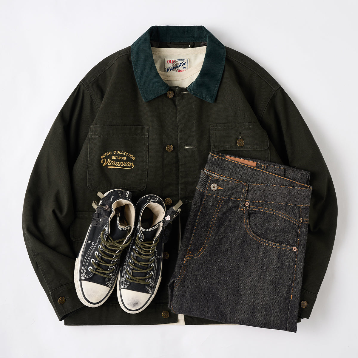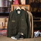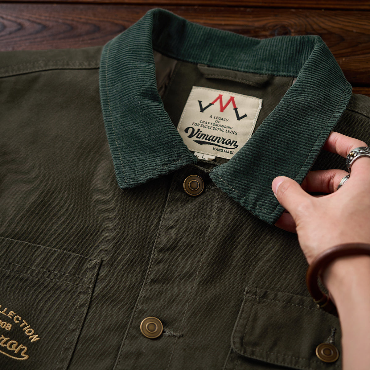 코듀로이 칼라 포인트에 4개의 포켓과 가슴 자수 디테일을 더해, 실용성과 빈티지 무드를 모두 담은 솜 안감 헌팅 자켓입니다.