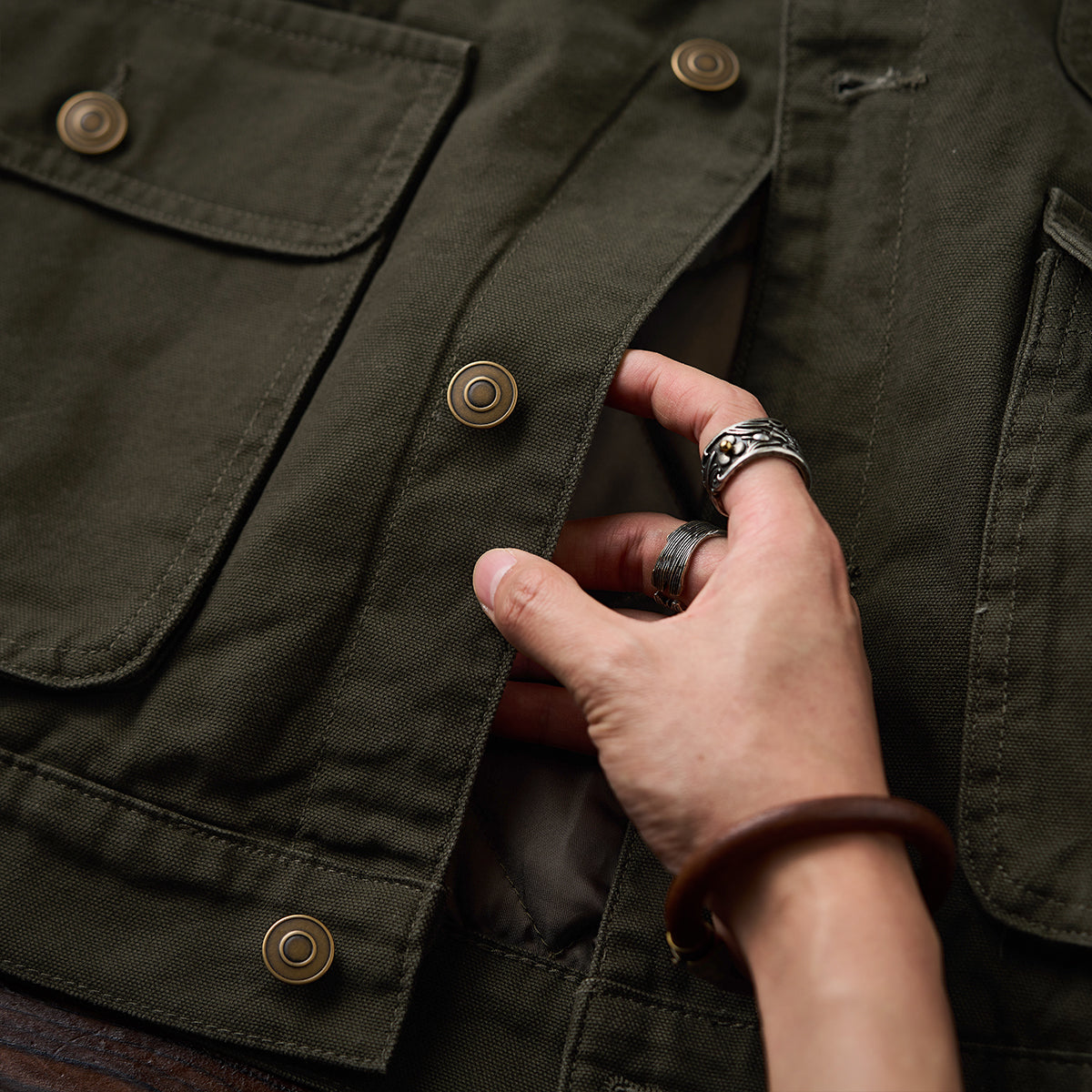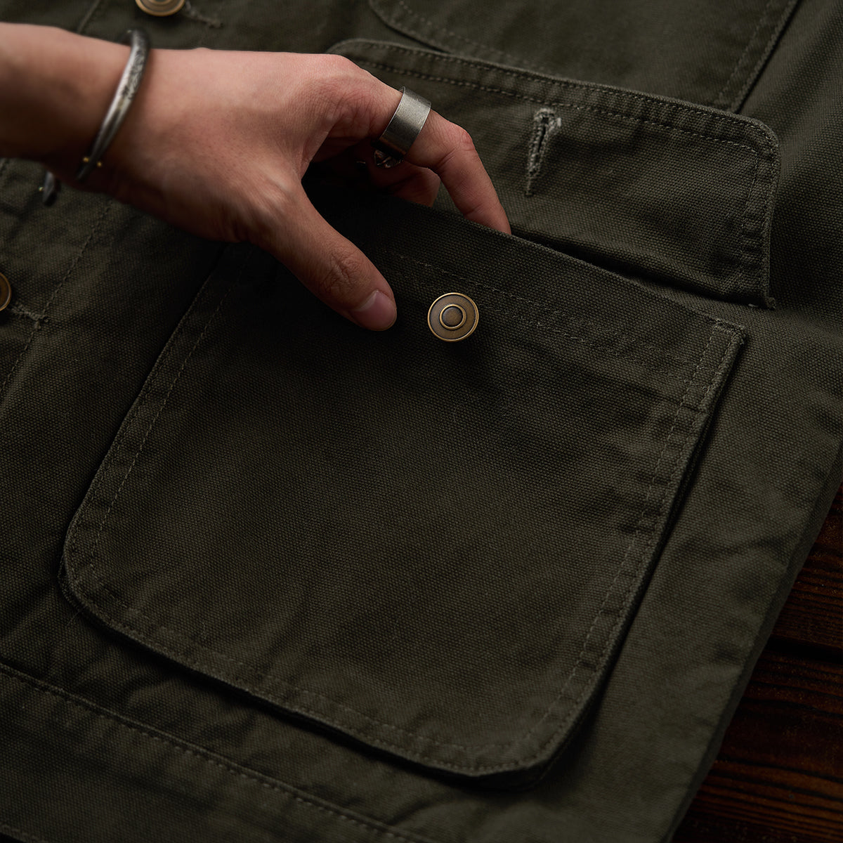 프론트 4포켓 구성으로 수납력을 높이고, 버튼 디테일로 소지품이 쉽게 빠지지 않도록 설계했습니다.