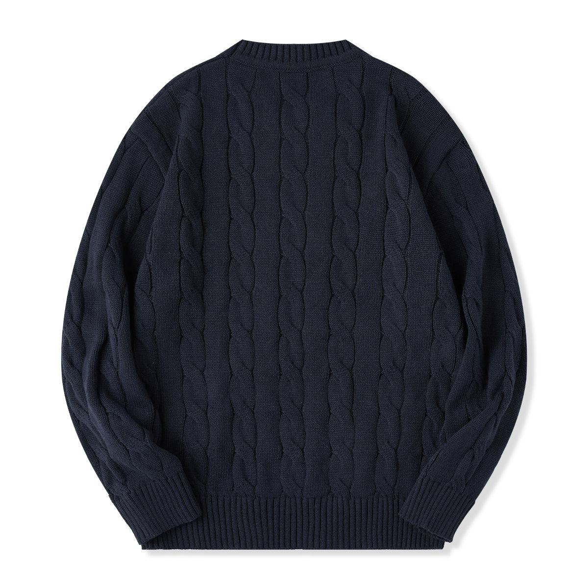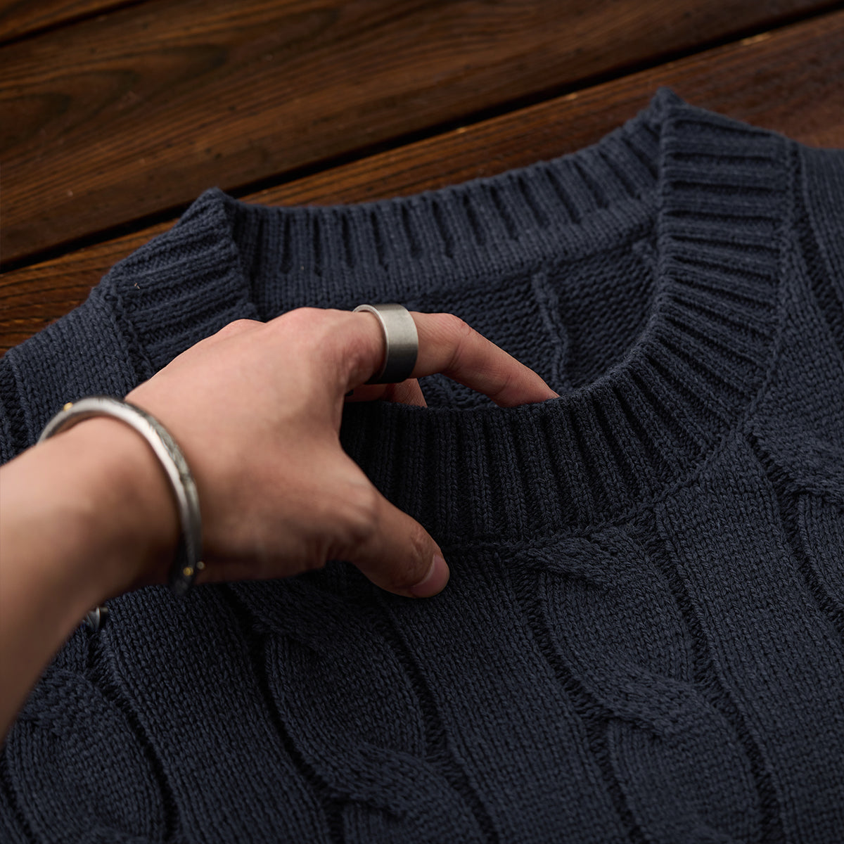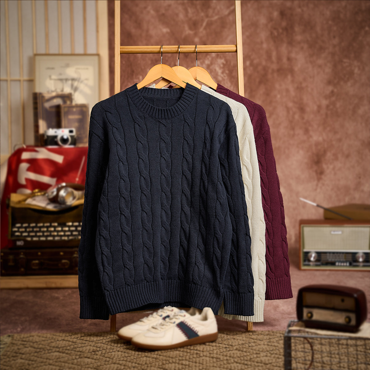 입체감 있는 케이블 짜임의 크루넥 니트로, 단독 착용이나 레이어드 모두에 잘 어울리며, 3컬러로 다양한 분위기를 연출할 수 있습니다.