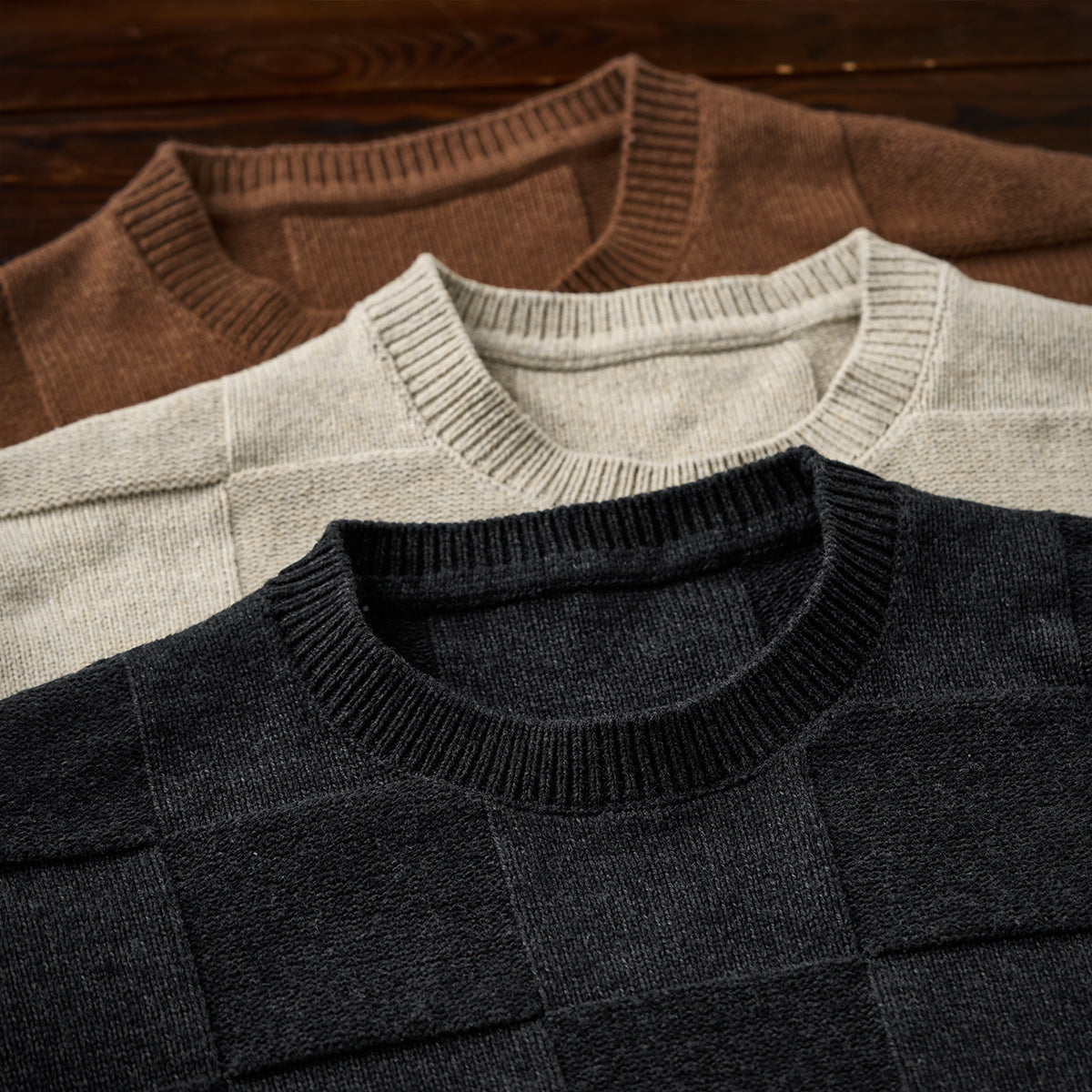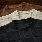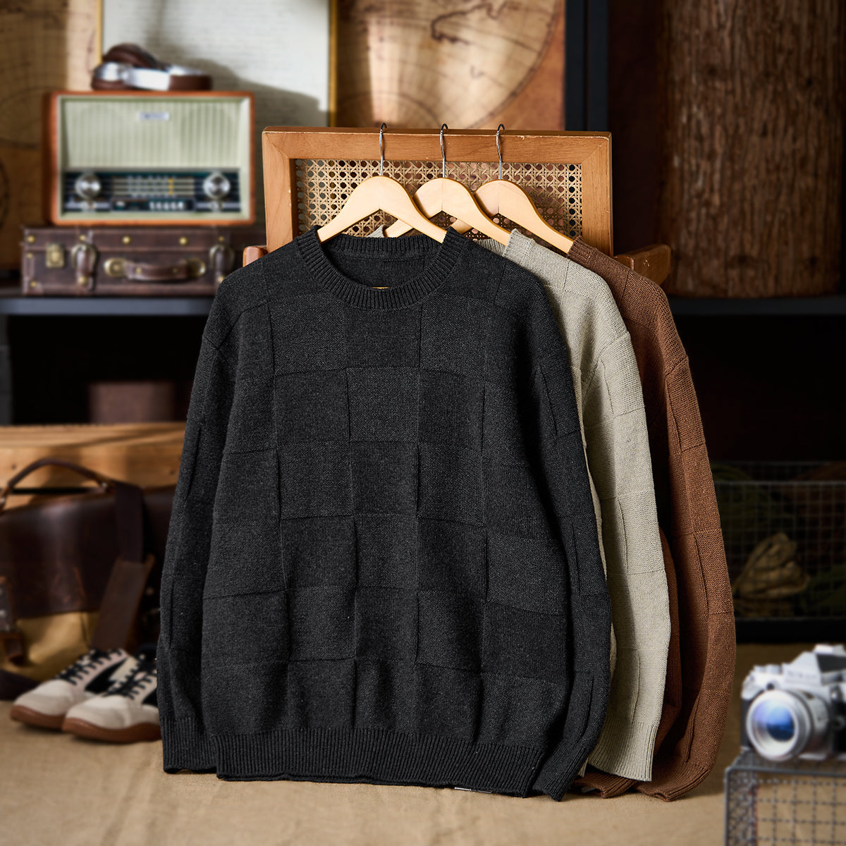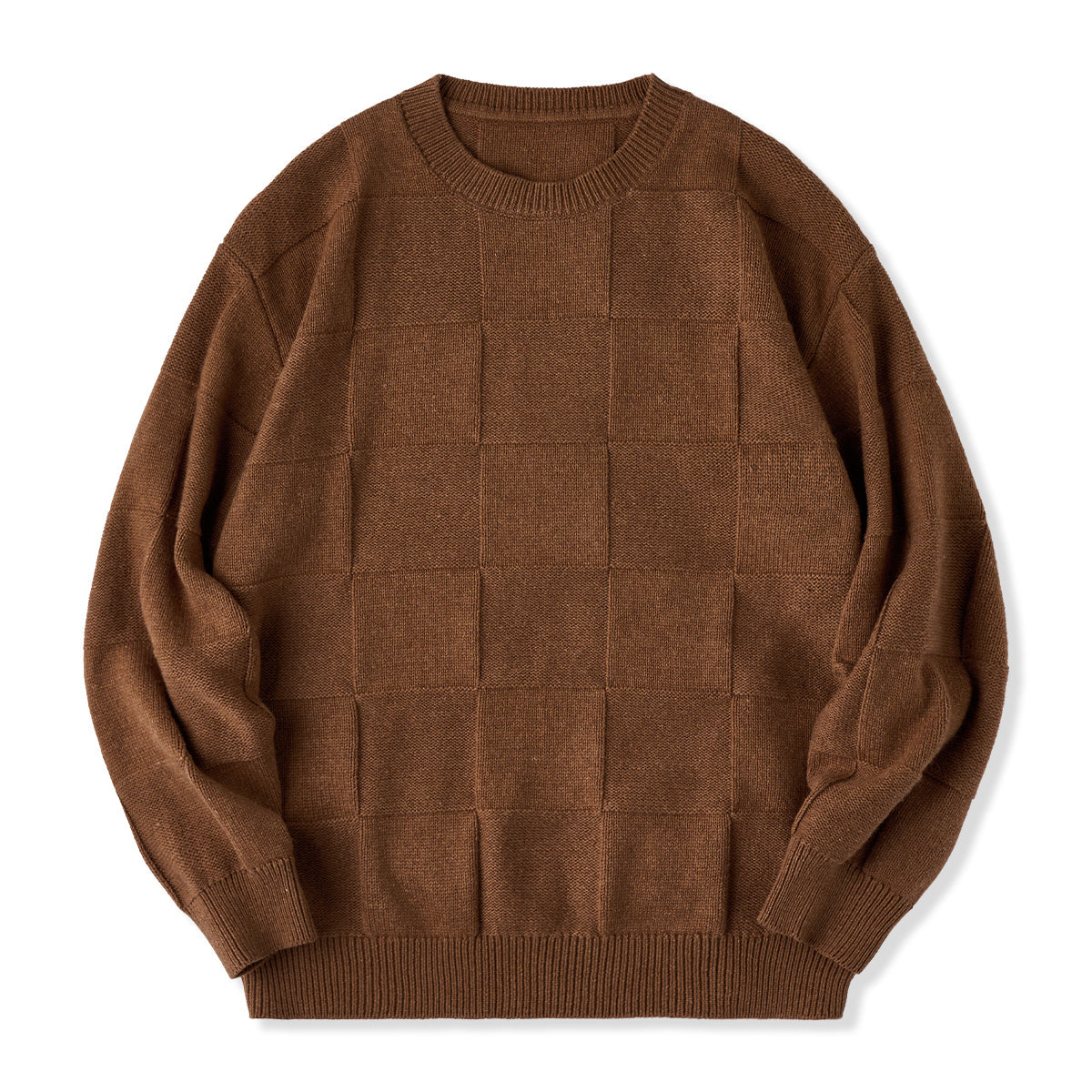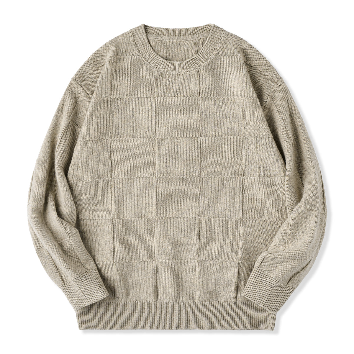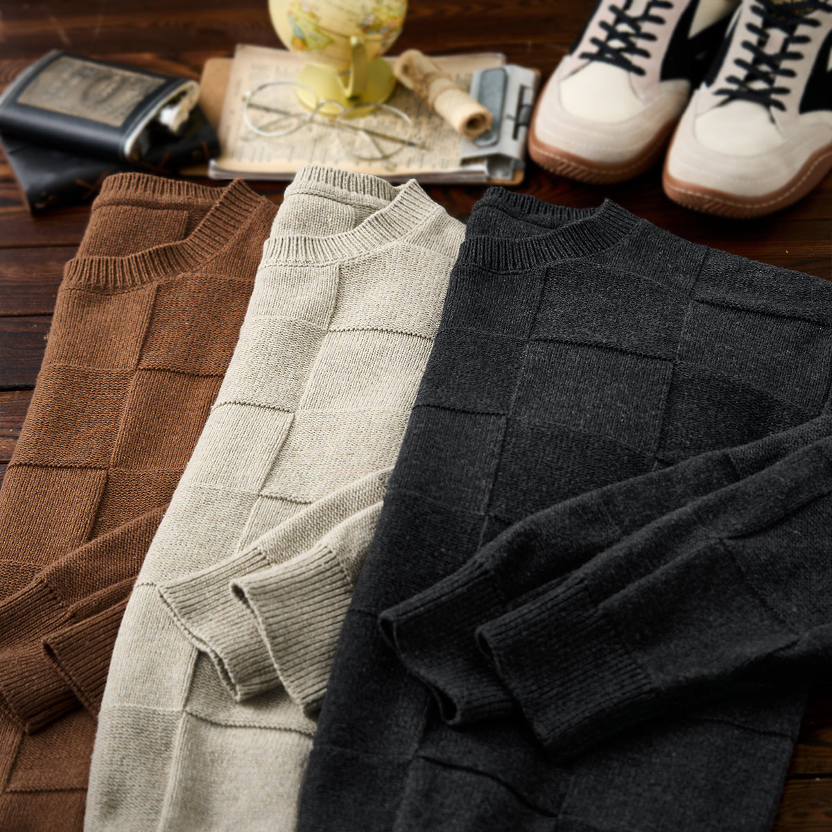 체크 패턴 자카드 니트로 입체감과 고급스러운 질감을 살린 크루넥 스웨터로, 편안한 실루엣과 심플한 디자인이 데일리 착용에 잘 어울립니다.
