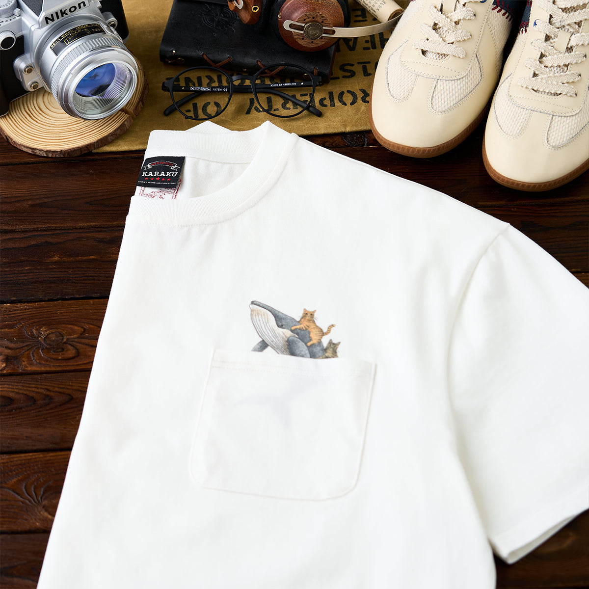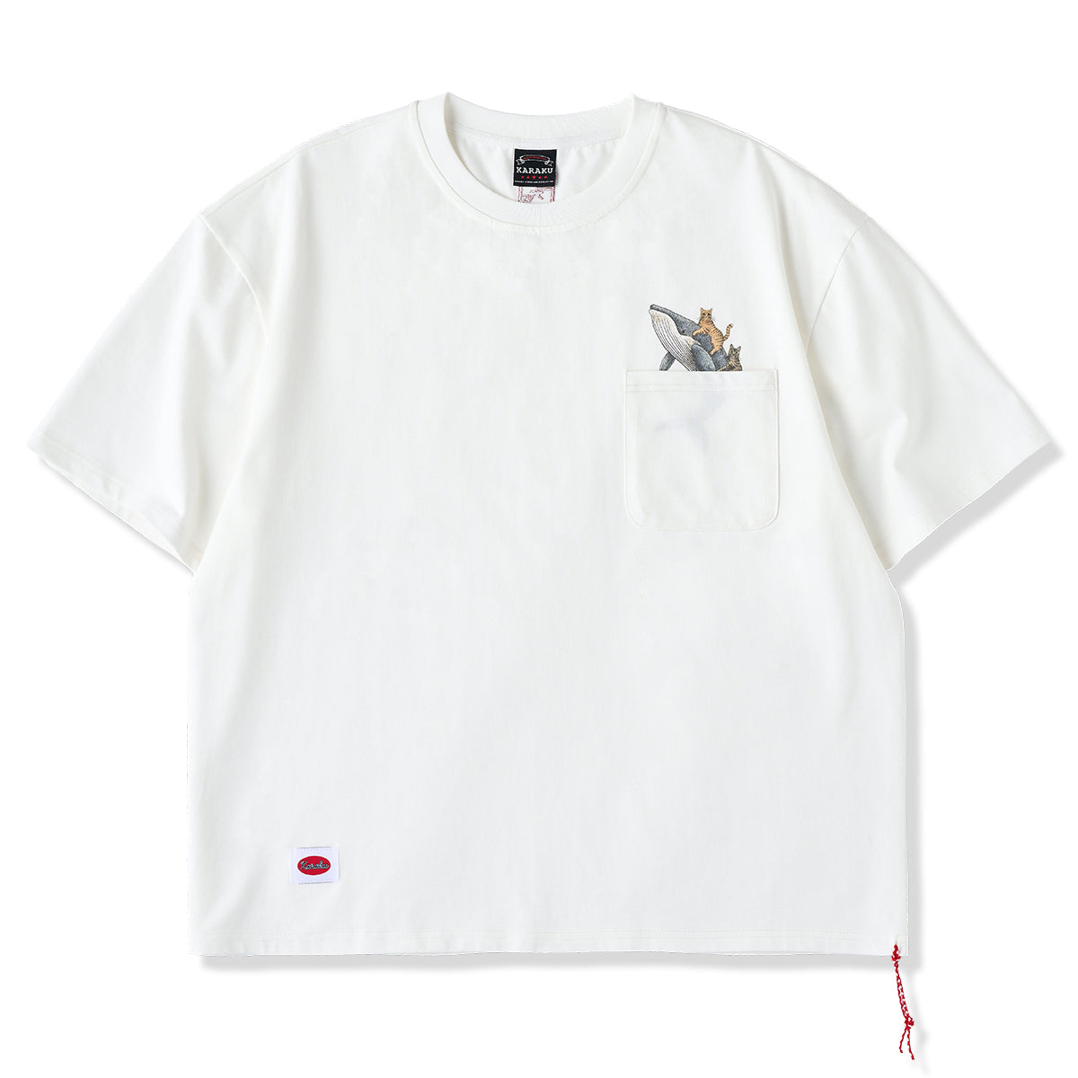 「Karaku×365CAT.ART」빨간 매듭 끈 고래와 함께 헤엄치는 고양이 프린트 코튼 티셔츠