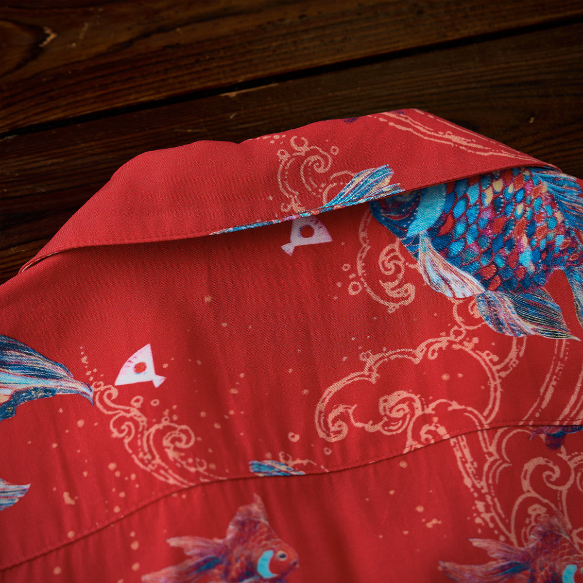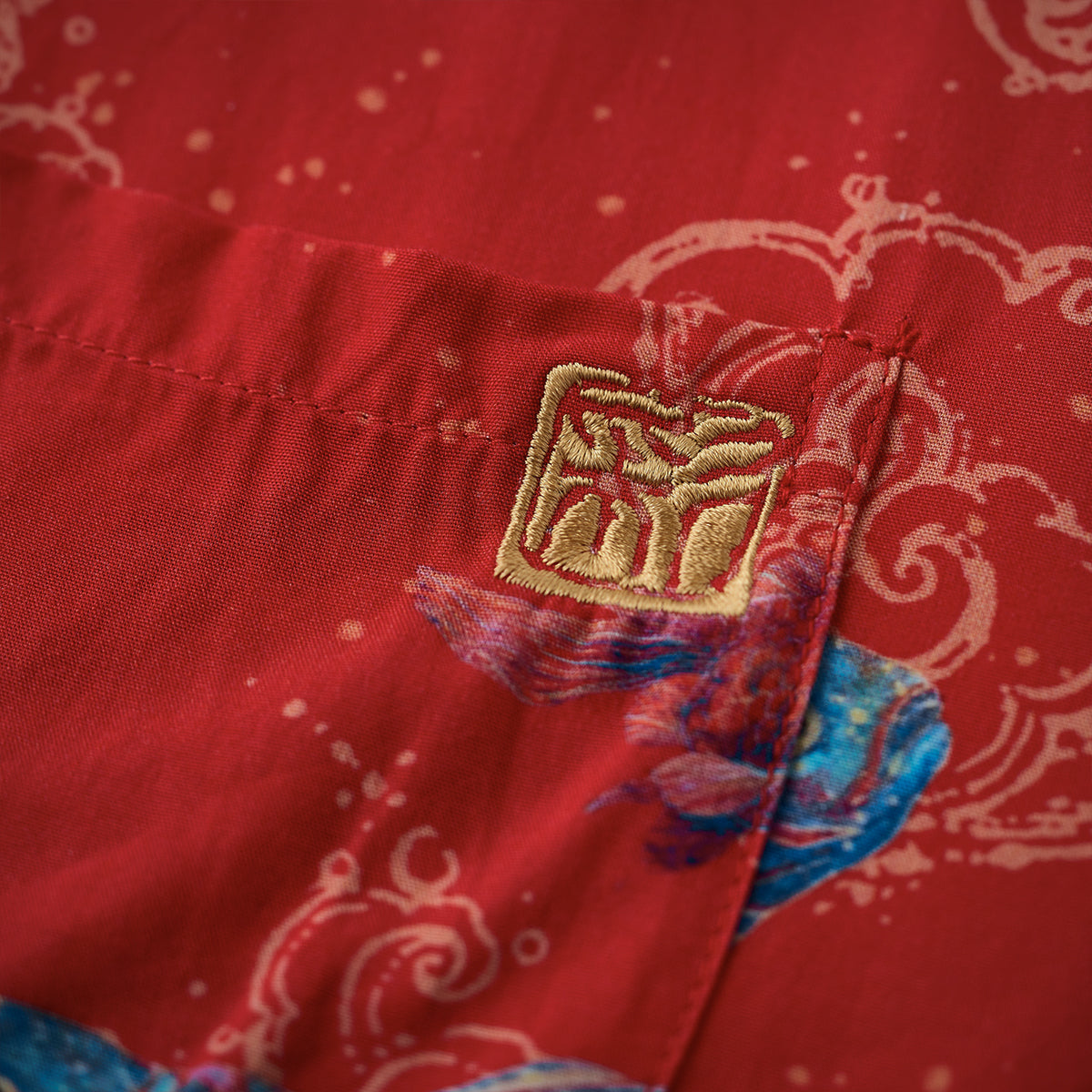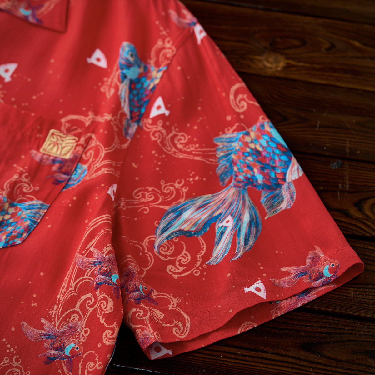 나스노 요이치의「扇の的」(부채의 표적) 일화를 모티브로 생명력과 역동성을 담은 아트 디자인, 골드 라인과 자수 디테일로 고급스러움을 더한 오픈 카라 셔츠입니다.