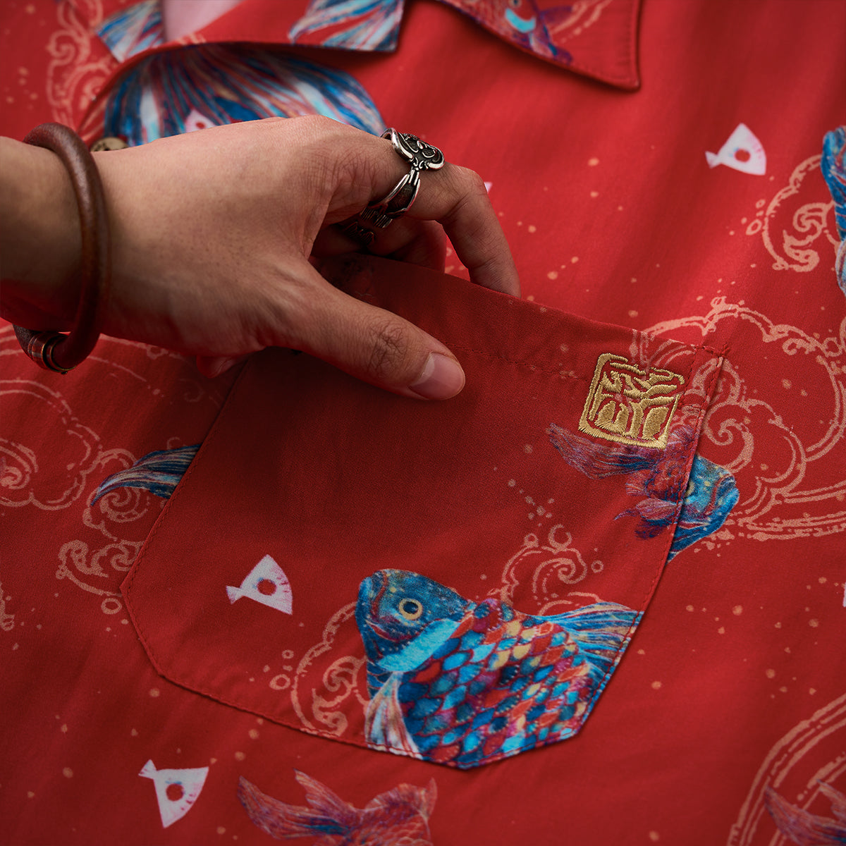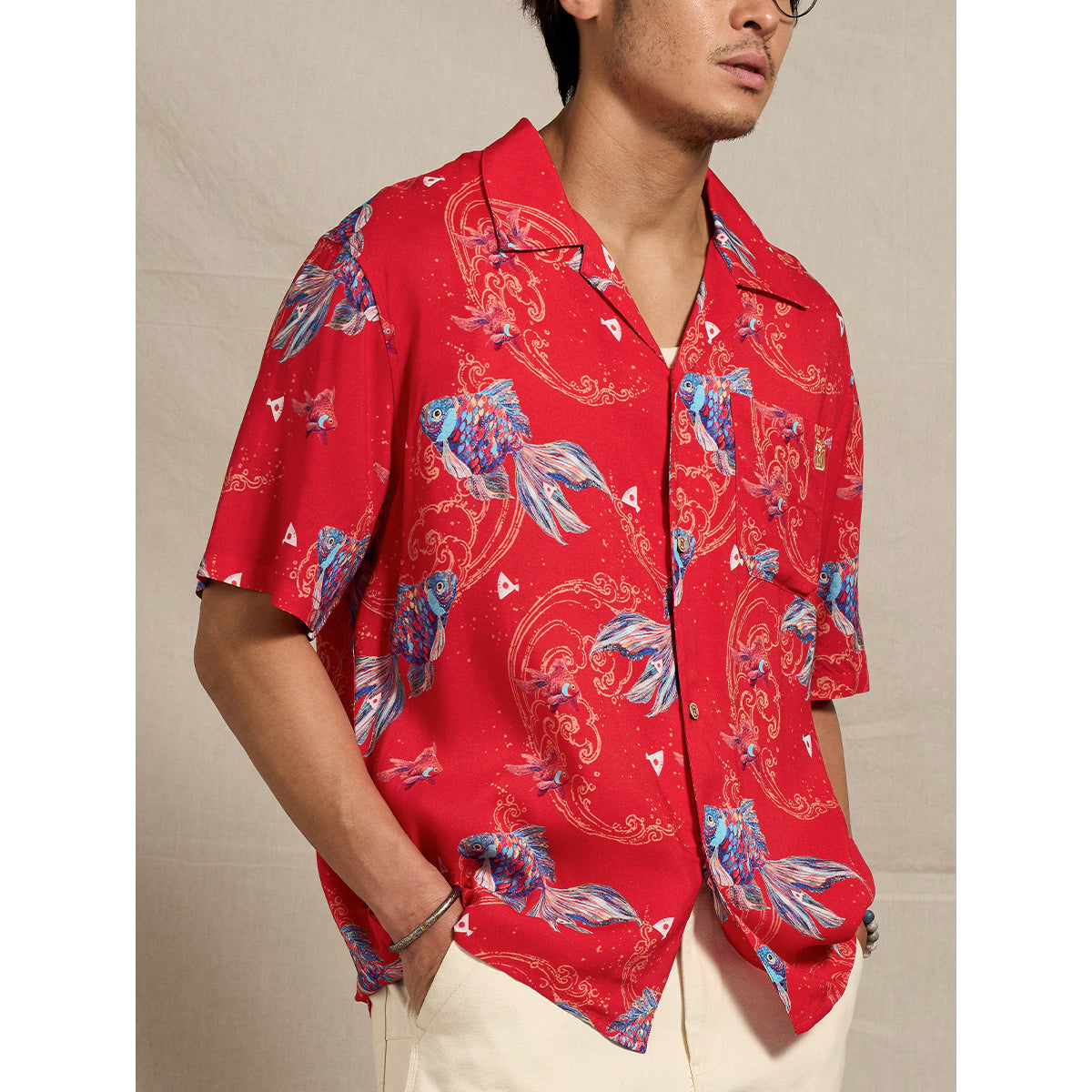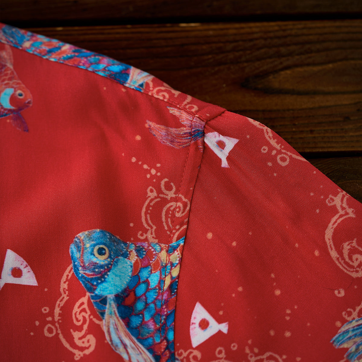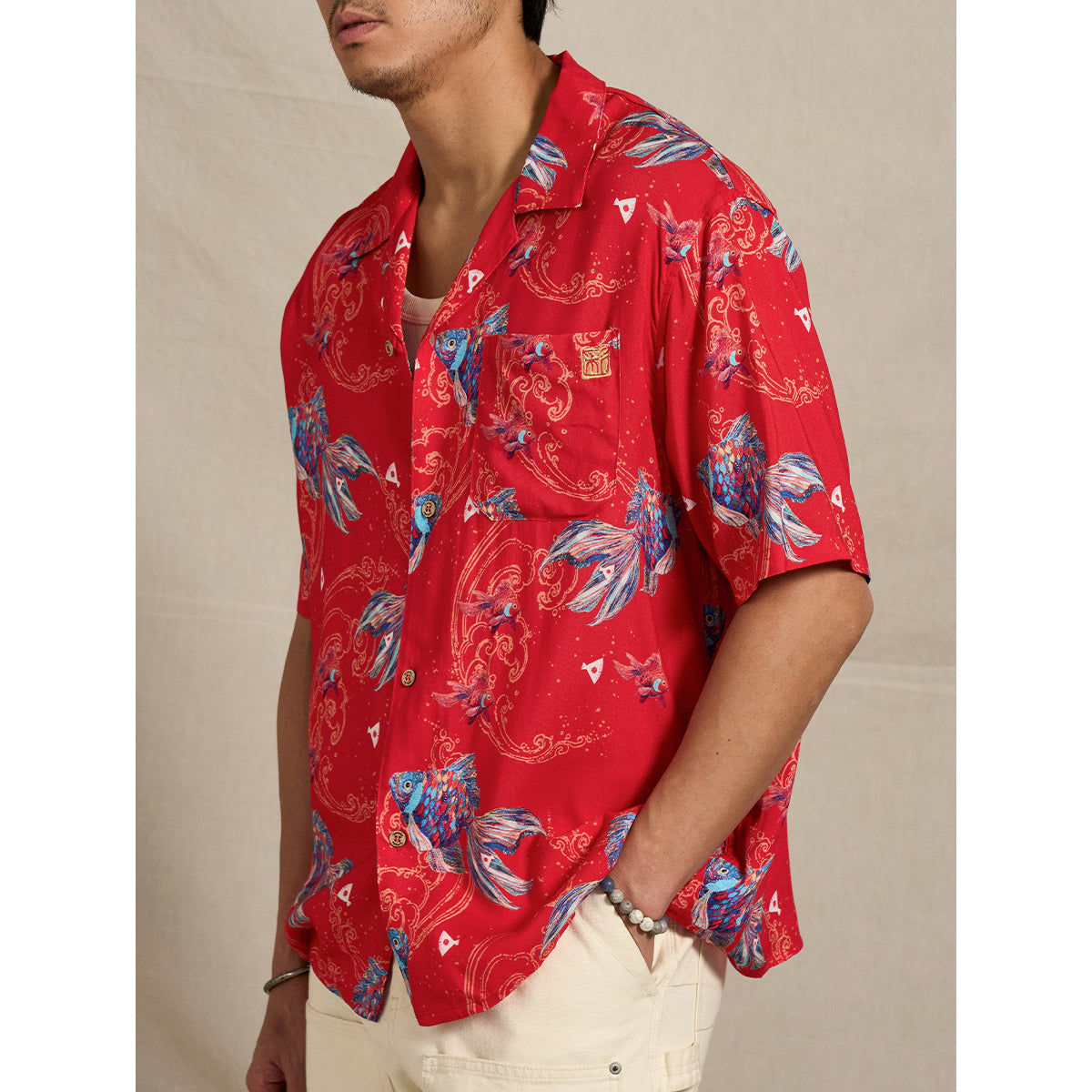 나스노 요이치의「扇の的」(부채의 표적) 일화를 모티브로 생명력과 역동성을 담은 아트 디자인, 골드 라인과 자수 디테일로 고급스러움을 더한 오픈 카라 셔츠입니다.