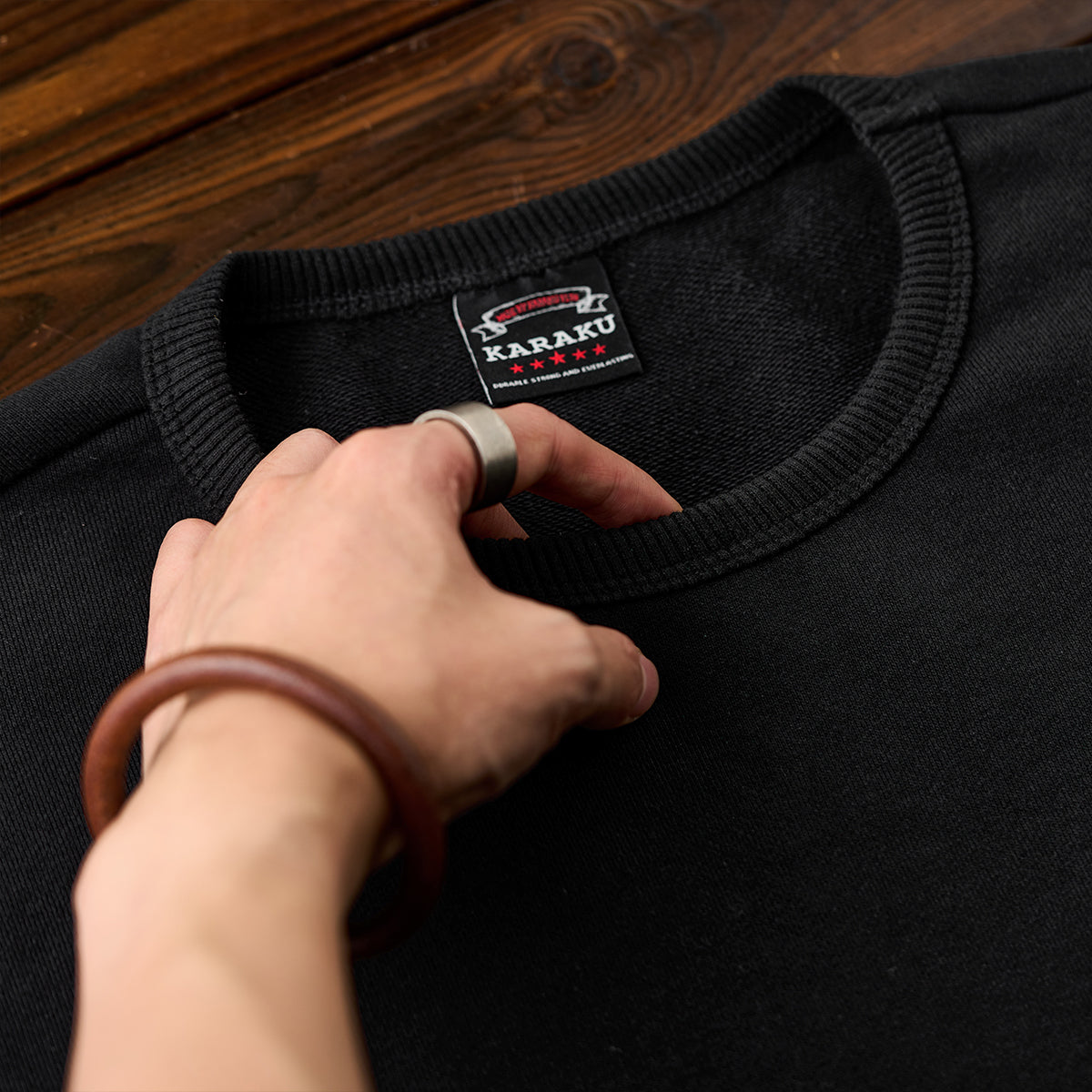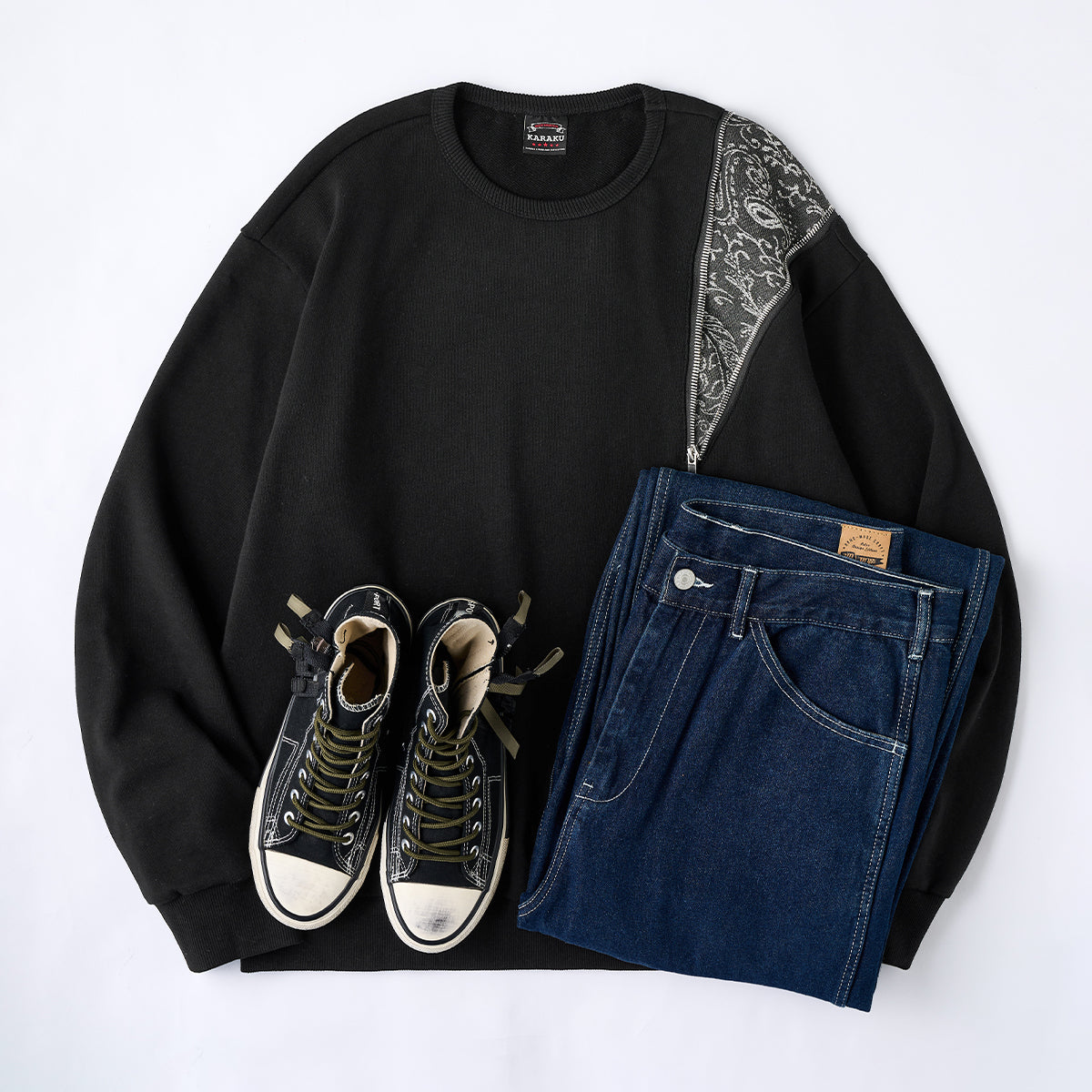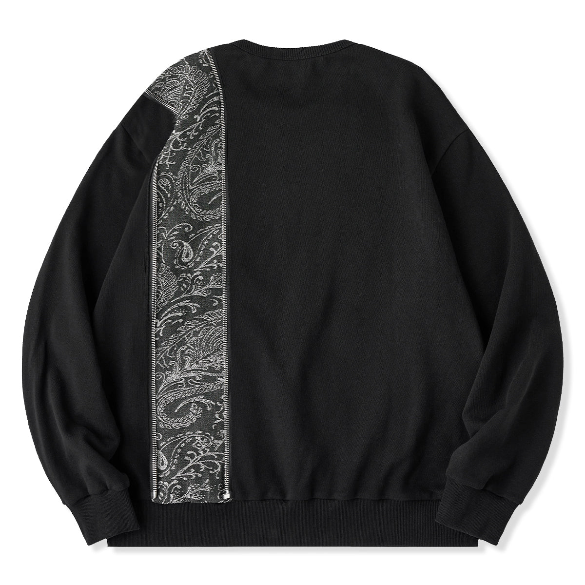 코튼 크루넥 풀오버 스웨트셔츠로, 페이즐리 데님 배색과 지퍼 디테일이 포인트이며, 차분한 컬러감으로 데일리 캐주얼에 잘 어울립니다.