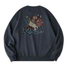 뒷면의 고양이·한냐면·칼 프린트, 벚꽃이 조화를 이루는 스웨트셔츠로, 손그림 느낌의 아트 스타일과 ‘KARAKU’ 로고가 레트로한 분위기를 완성합니다.