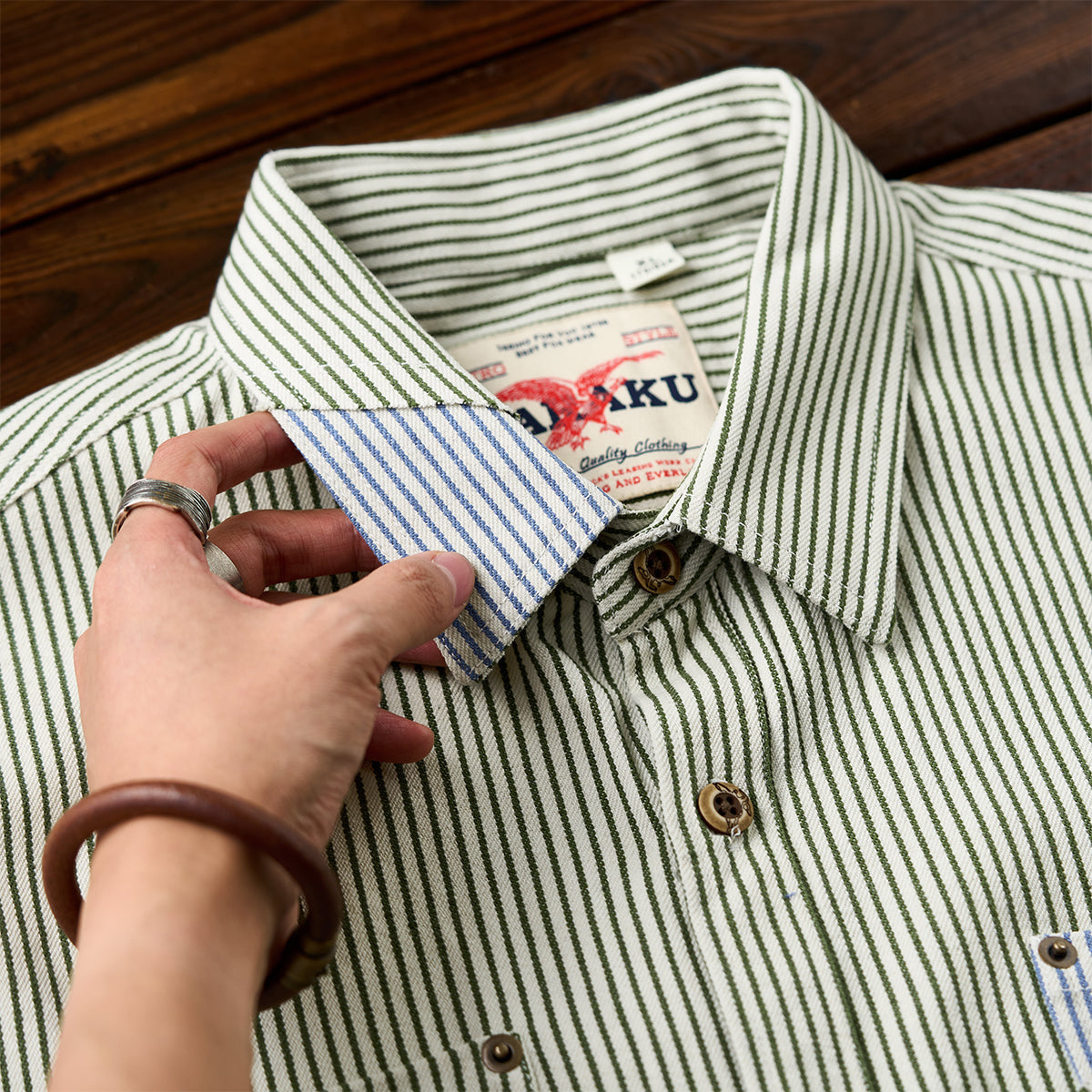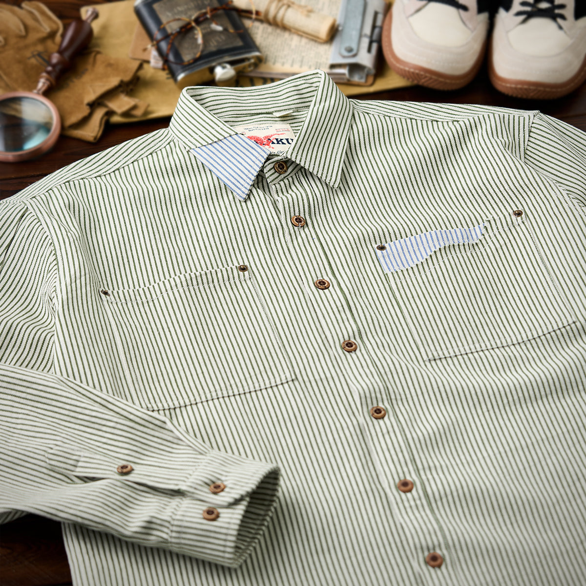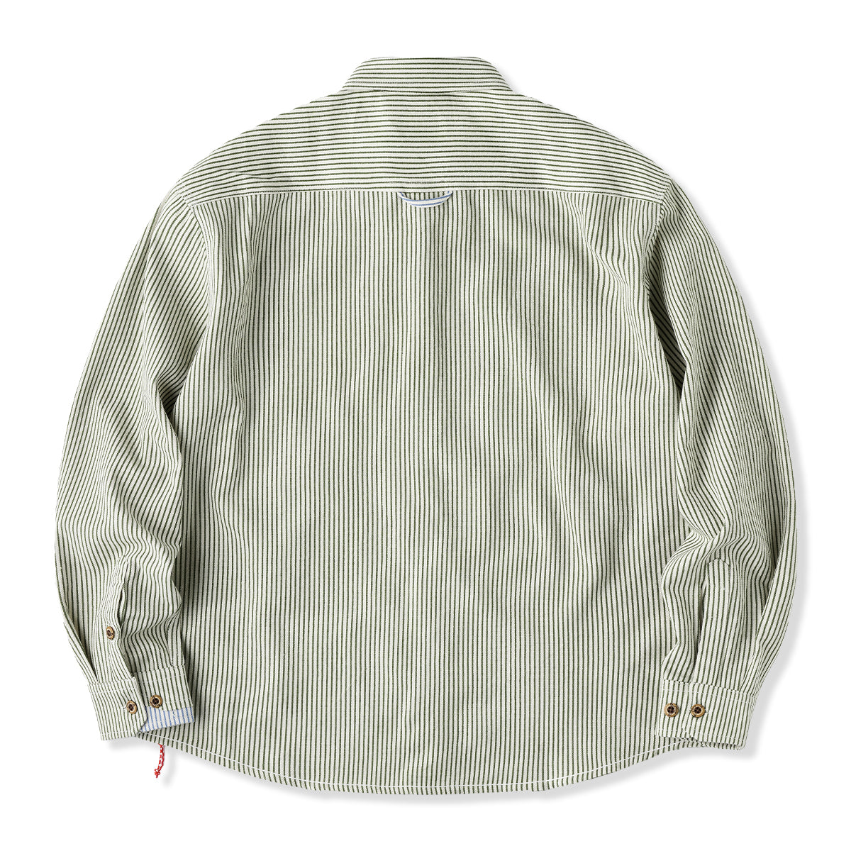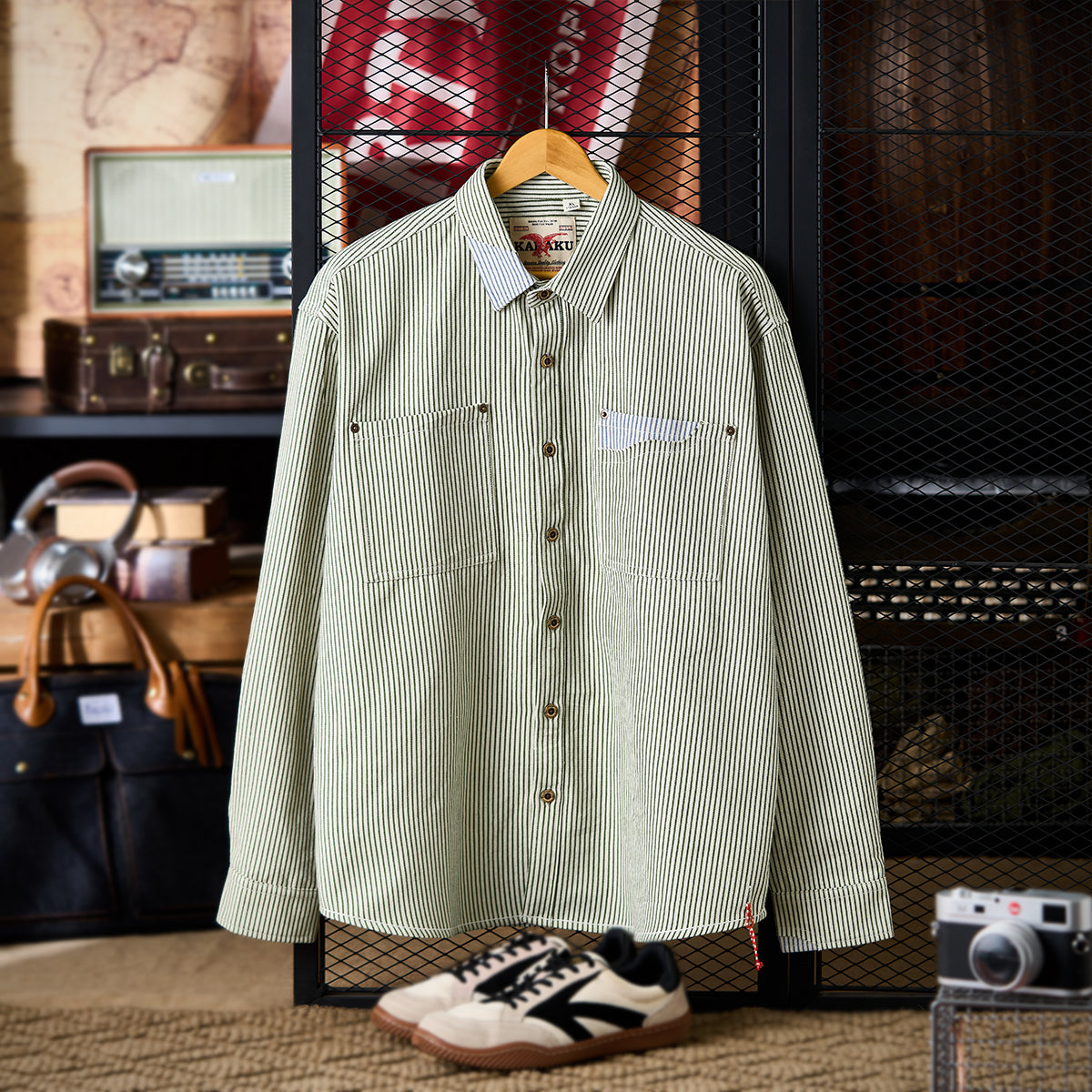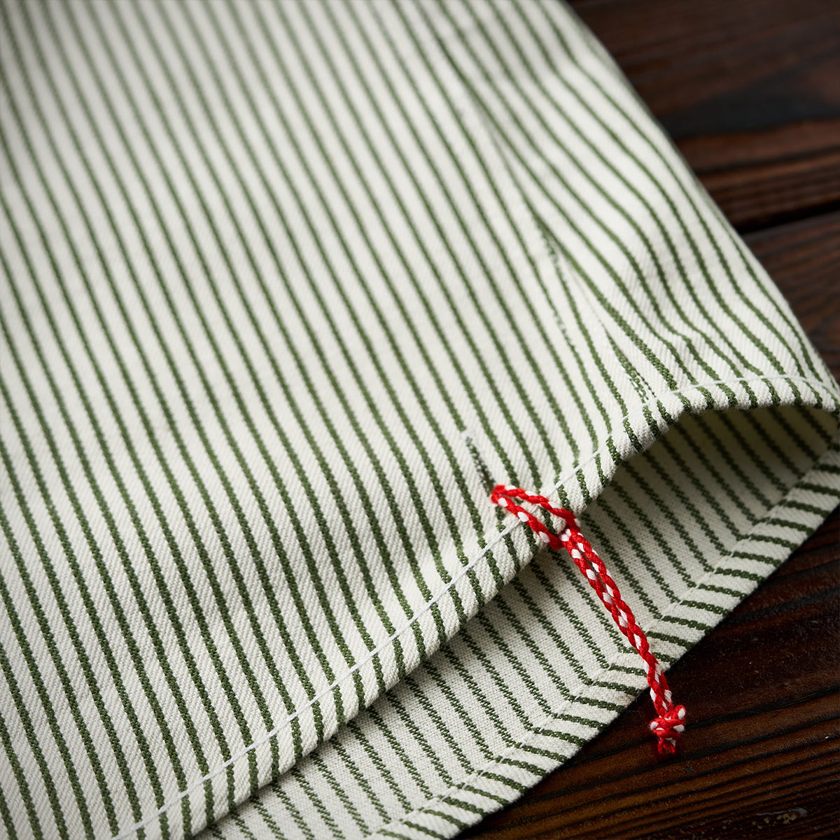 빨간 매듭 끈 칼라·소매·포켓 배색 전환 선염 스트라이프 워크 셔츠