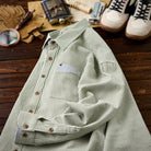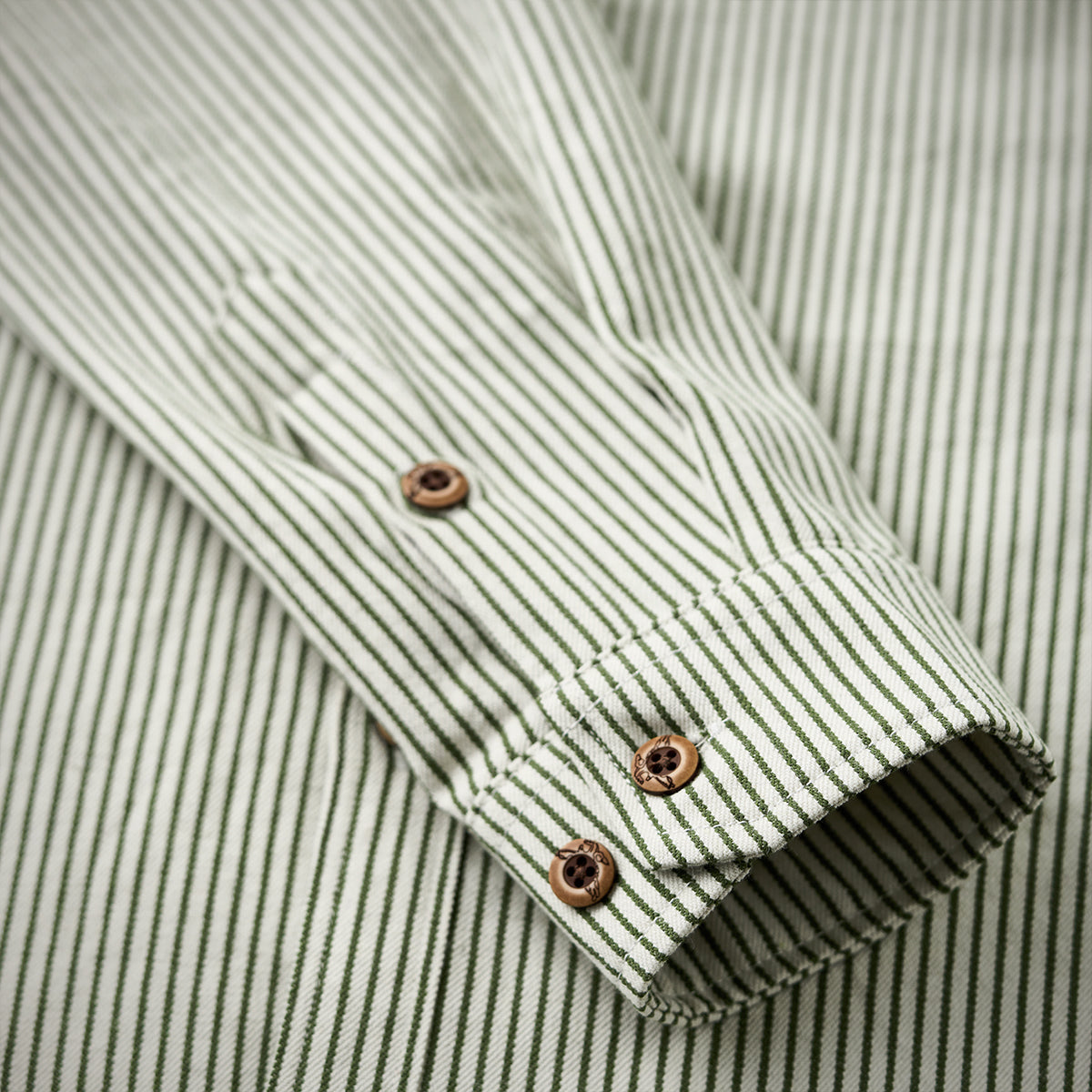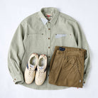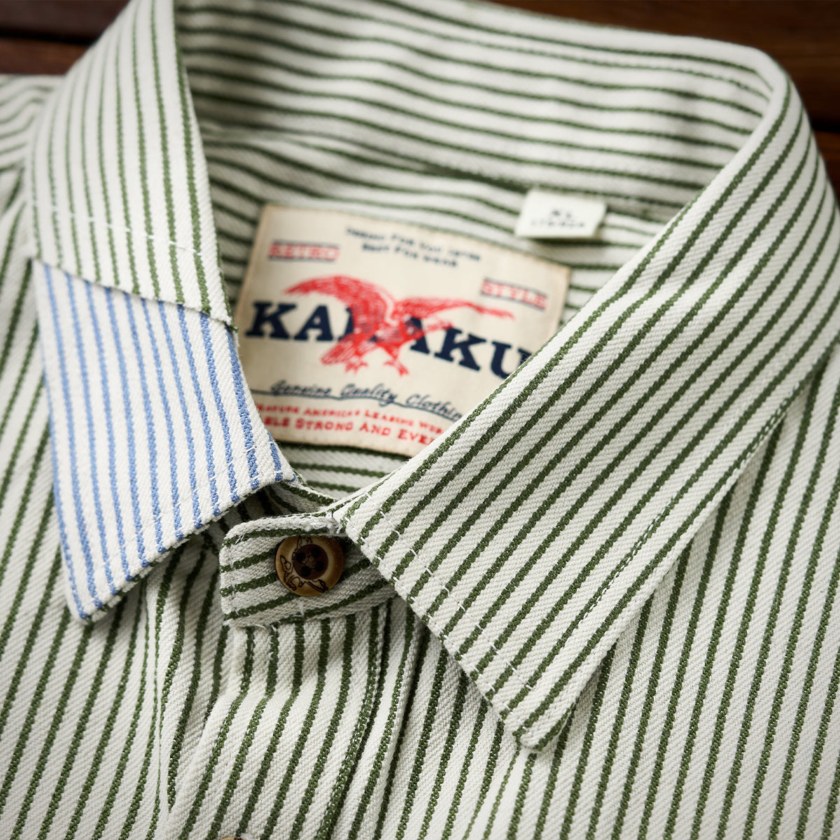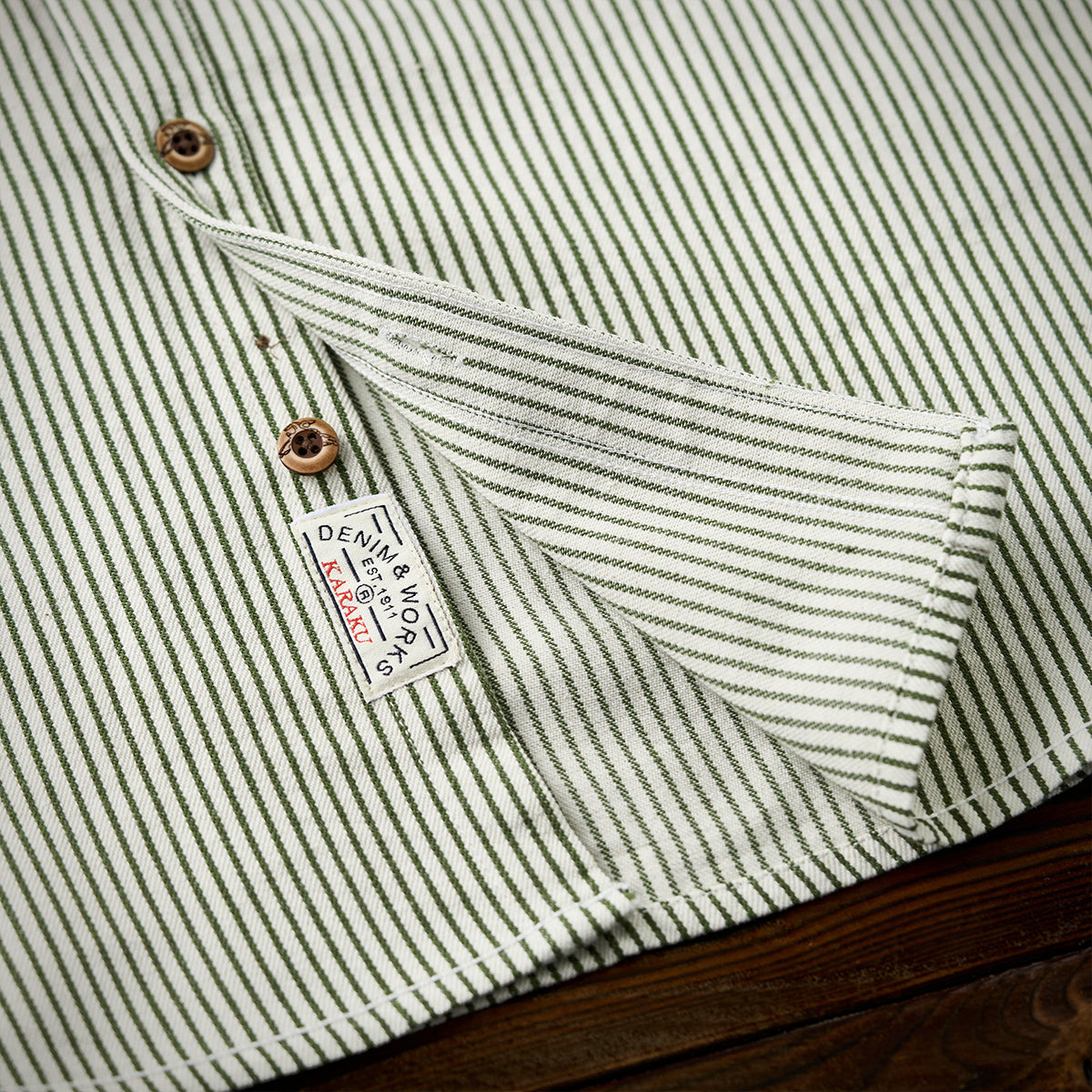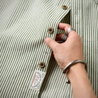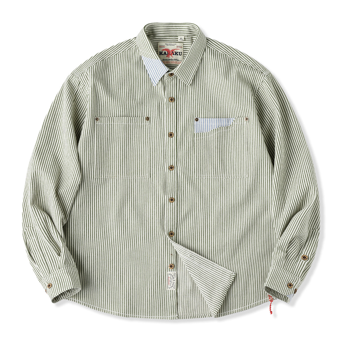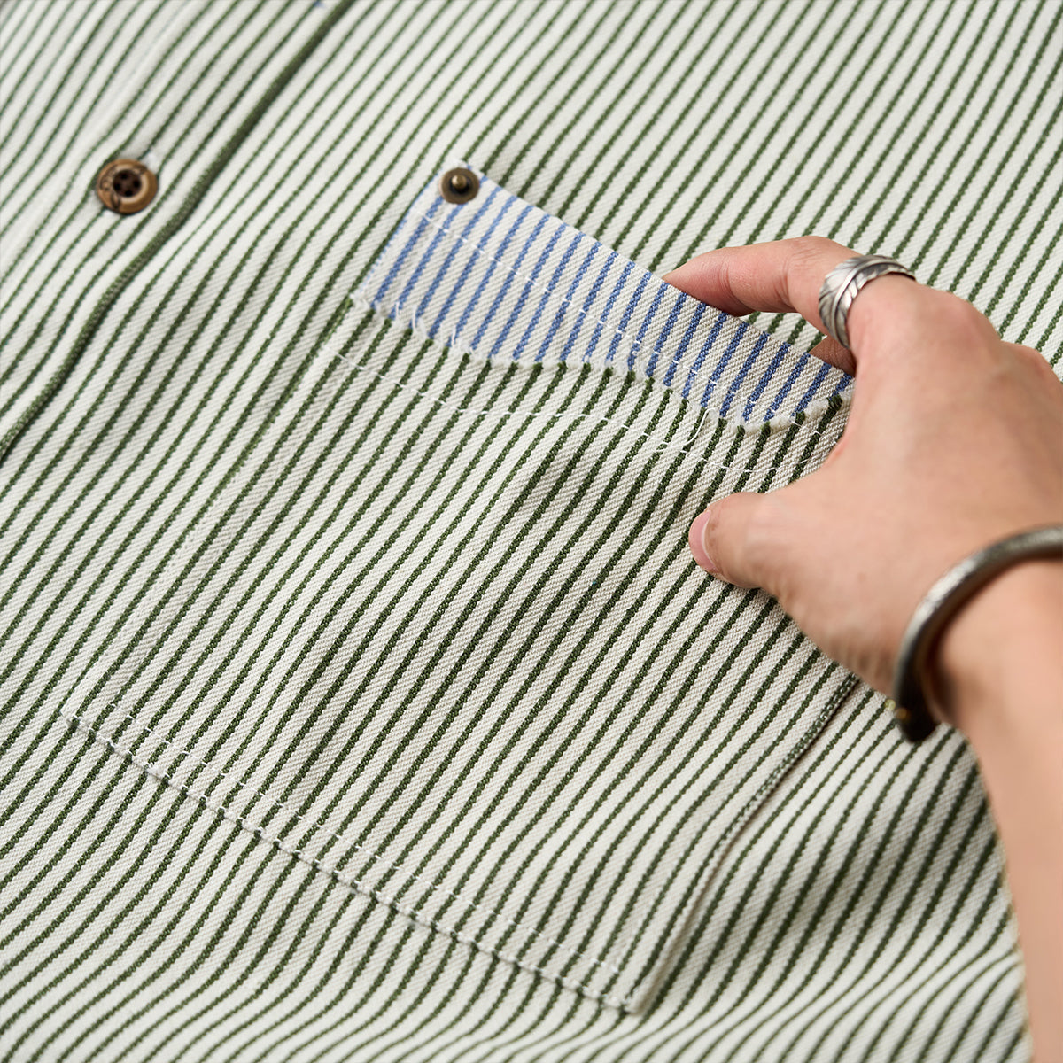 빨간 매듭 끈 칼라·소매·포켓 배색 전환 선염 스트라이프 워크 셔츠