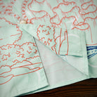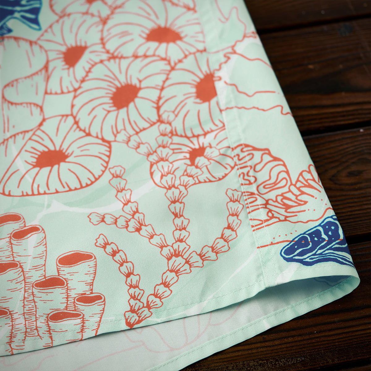 블루·오렌지 컬러로 표현한 해양 생물 올오버 패턴 디자인입니다. 민트 그린 바탕과 화이트 파문 패턴이 어우러져 시원한 바닷속 분위기를 완성합니다.