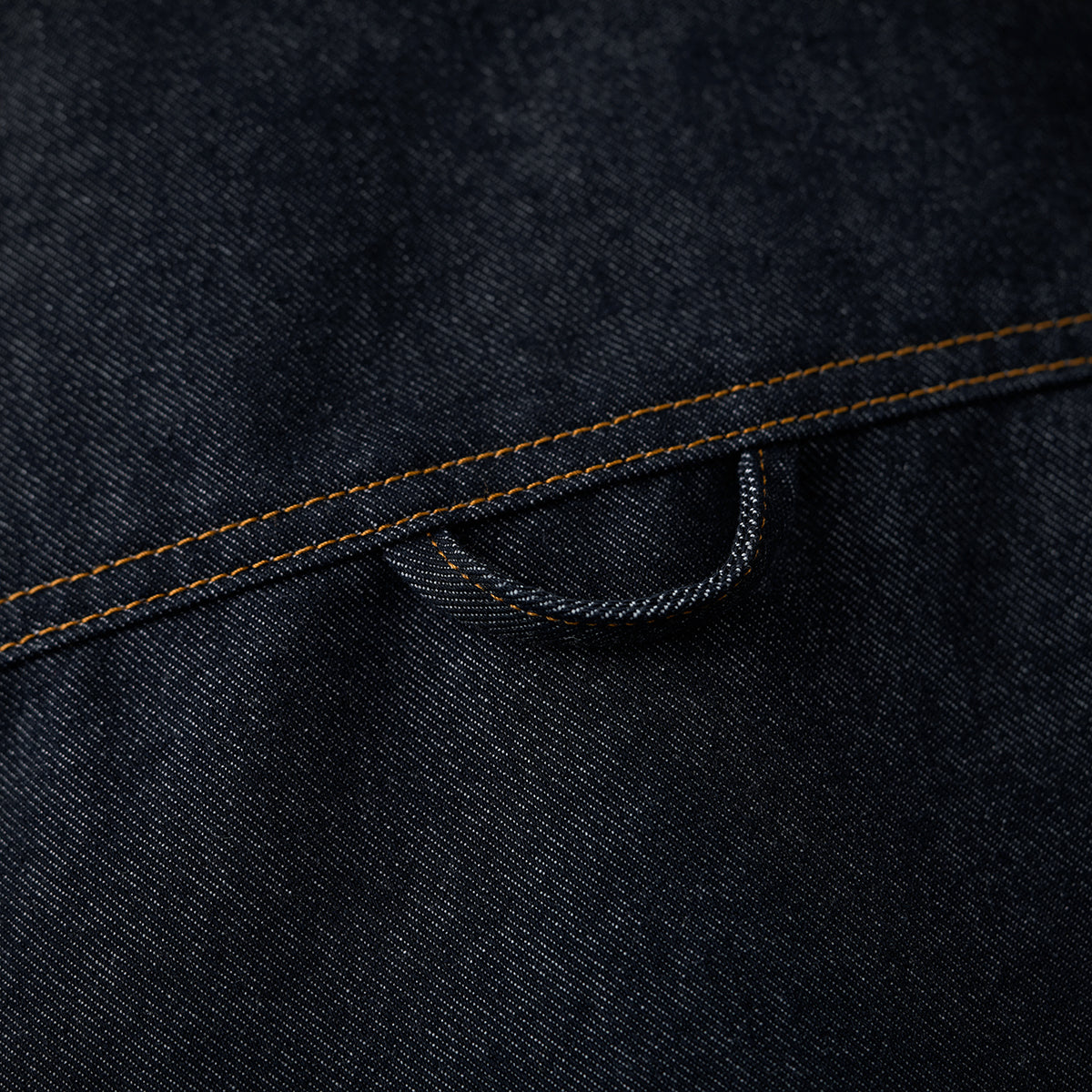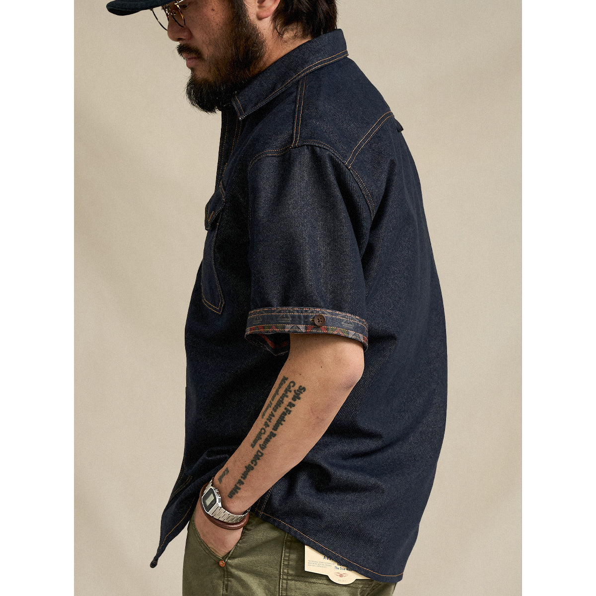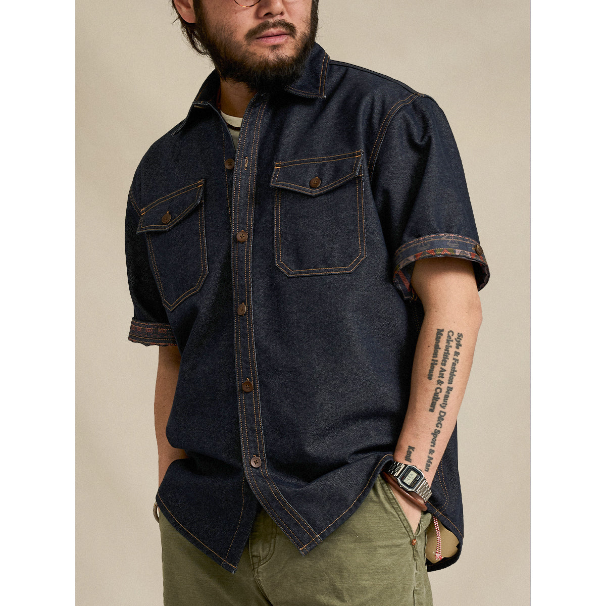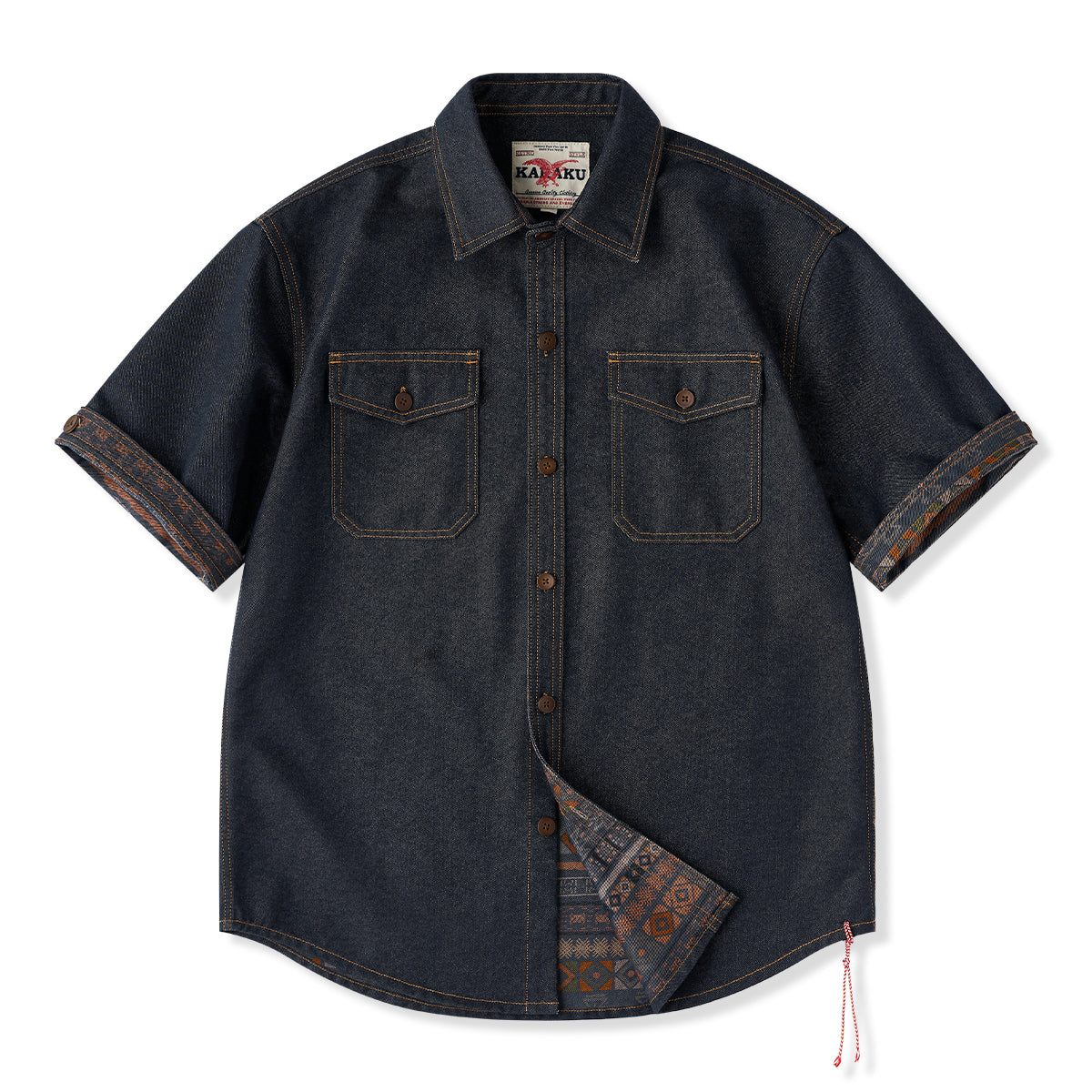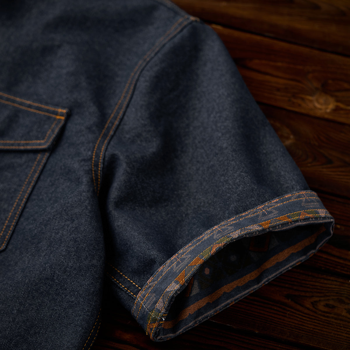 진한 인디고 데님 소재와 에스닉 패턴 안감이 어우러진 워크 셔츠로, 더블 스티치와 프론트 포켓, 로고 자수 등 실용적이면서 세련된 디테일을 갖춘 아이템입니다.