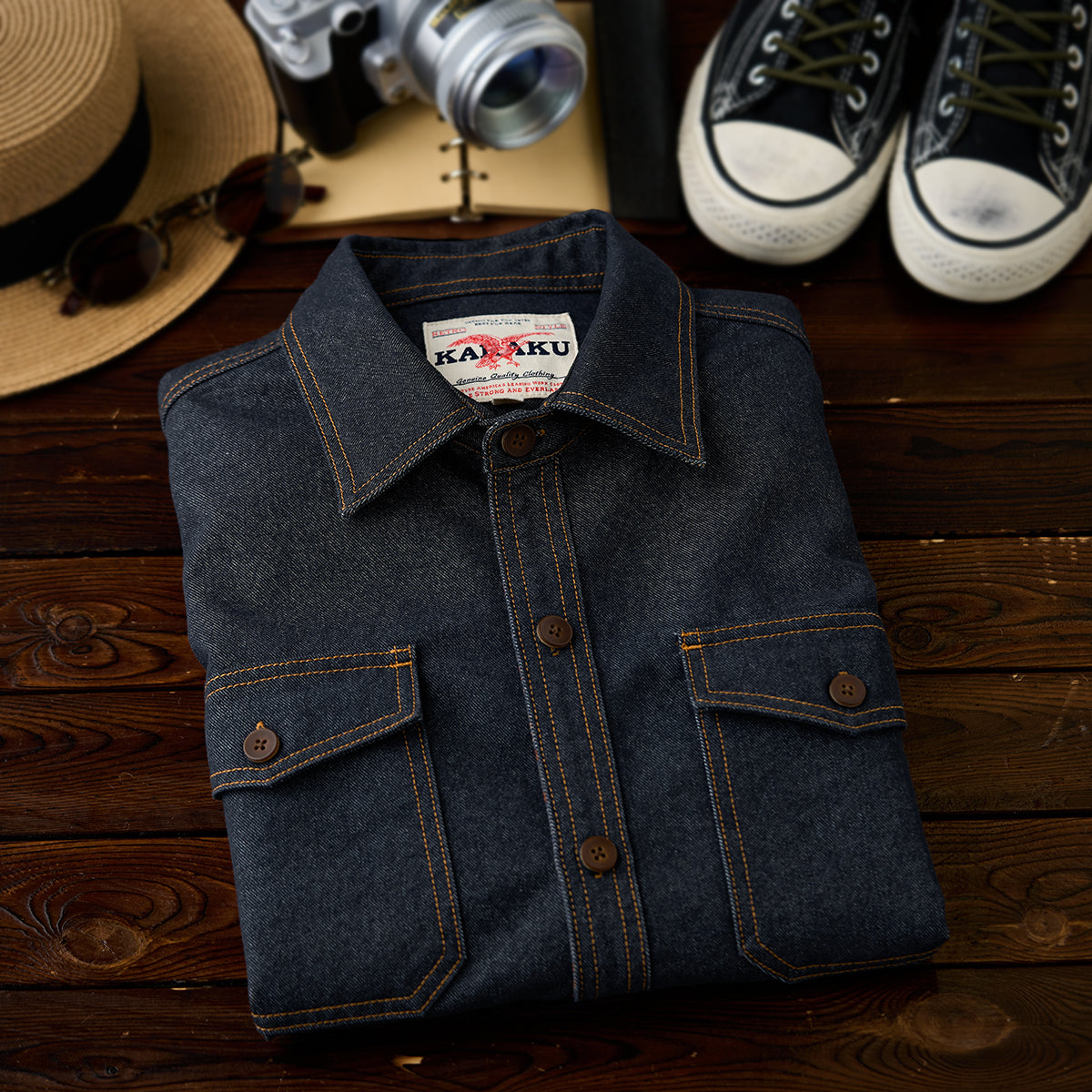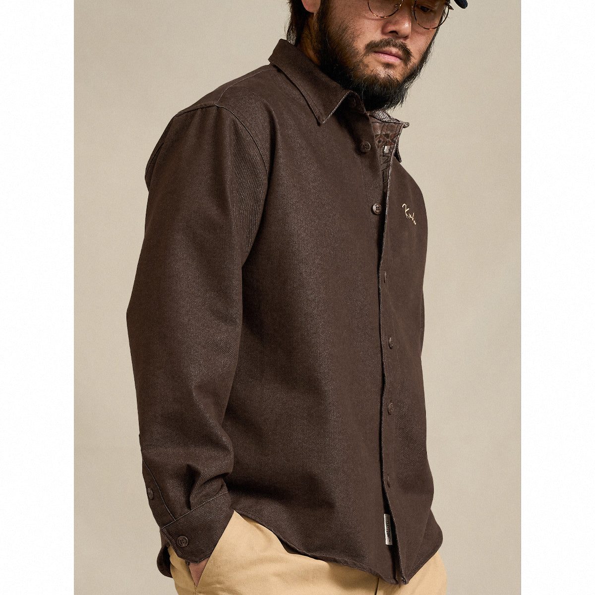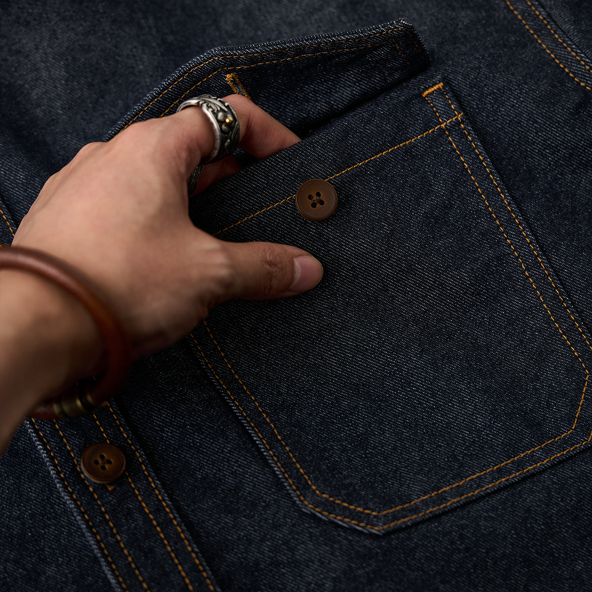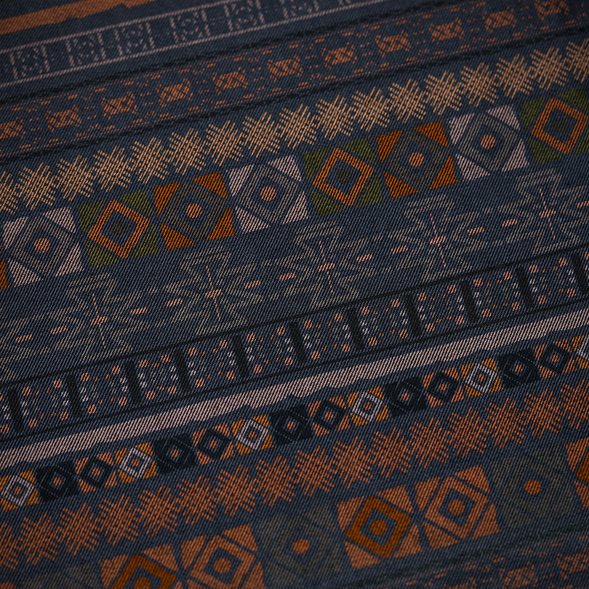 진한 인디고 데님 소재와 에스닉 패턴 안감이 어우러진 워크 셔츠로, 더블 스티치와 프론트 포켓, 로고 자수 등 실용적이면서 세련된 디테일을 갖춘 아이템입니다.