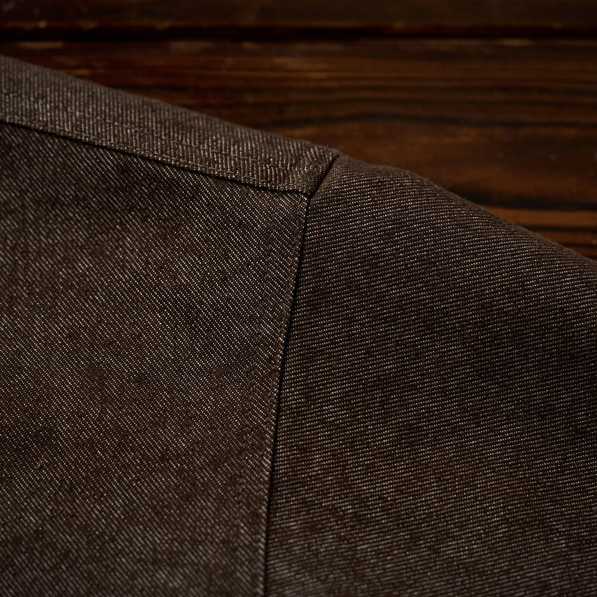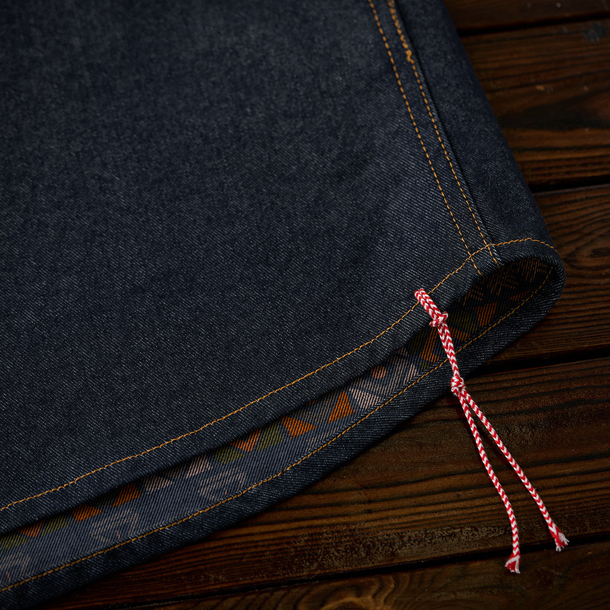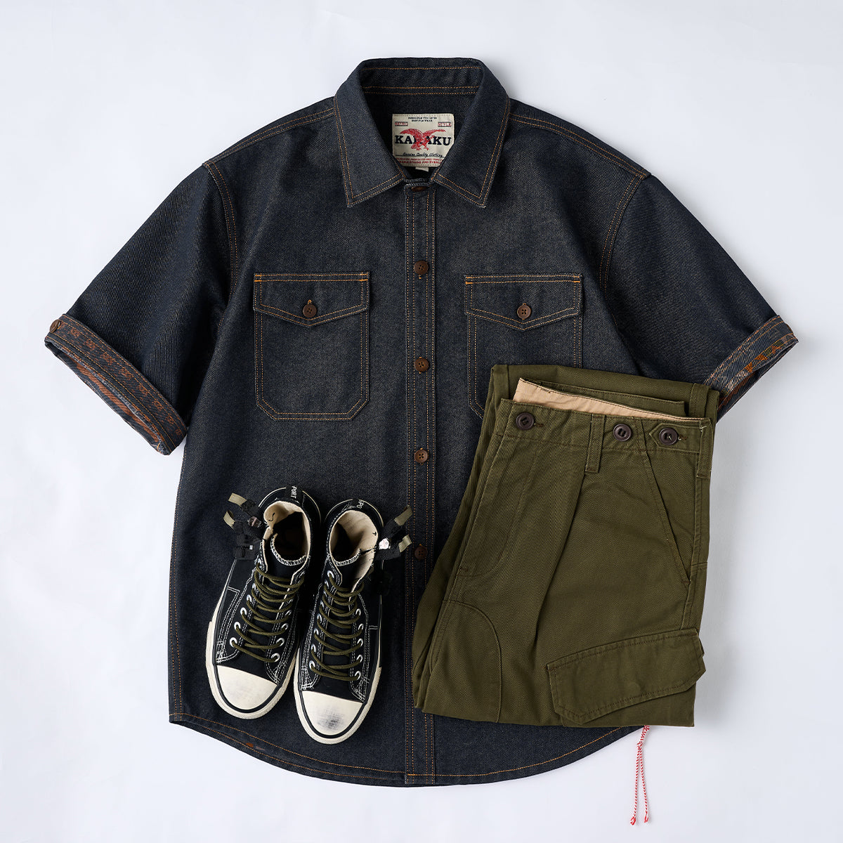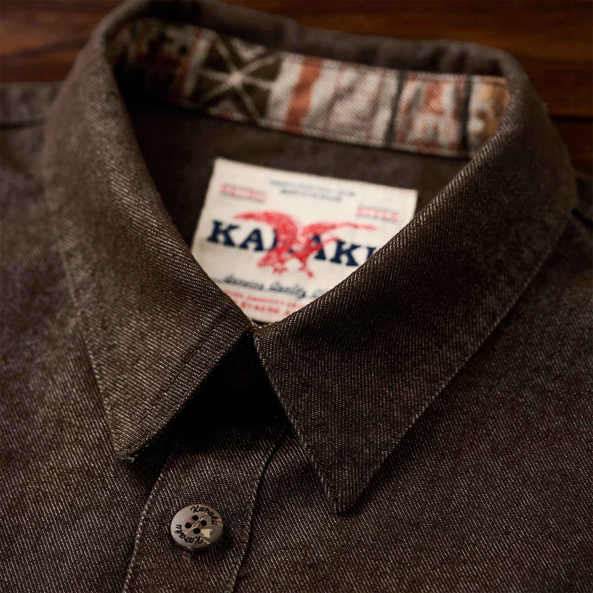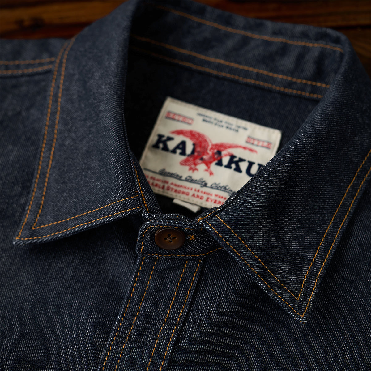 진한 인디고 데님 소재와 에스닉 패턴 안감이 어우러진 워크 셔츠로, 더블 스티치와 프론트 포켓, 로고 자수 등 실용적이면서 세련된 디테일을 갖춘 아이템입니다.