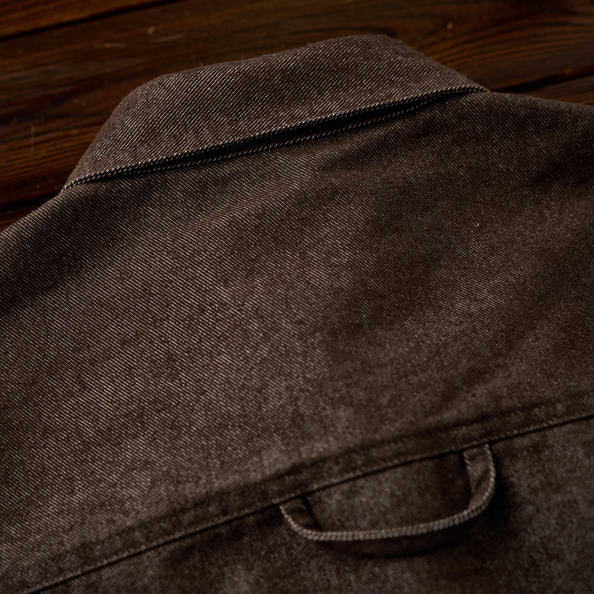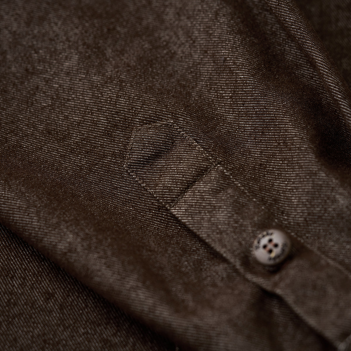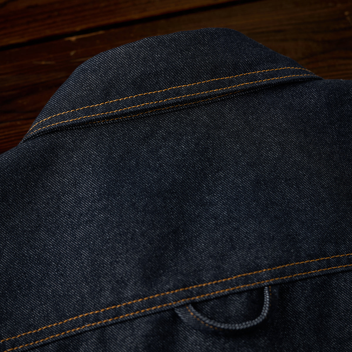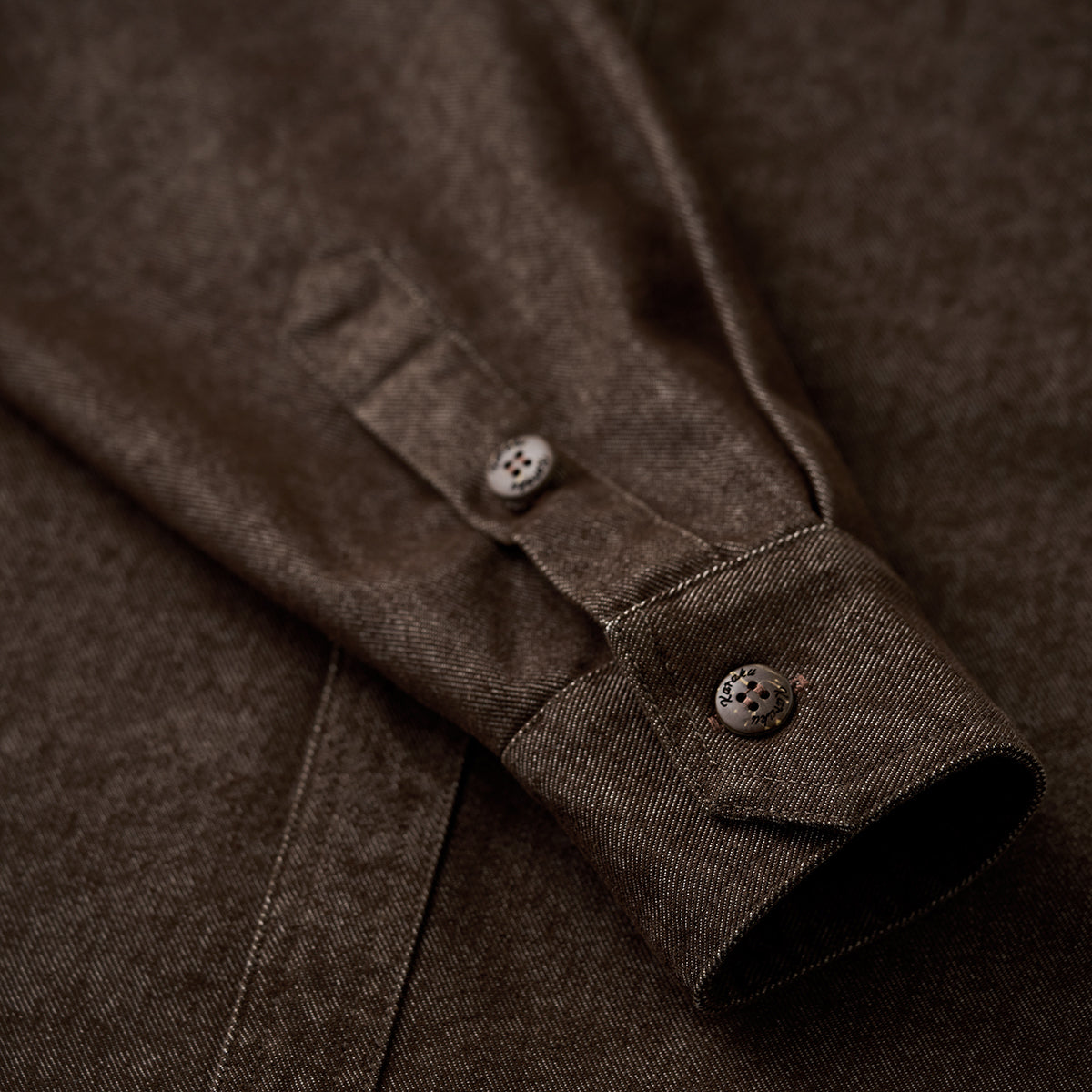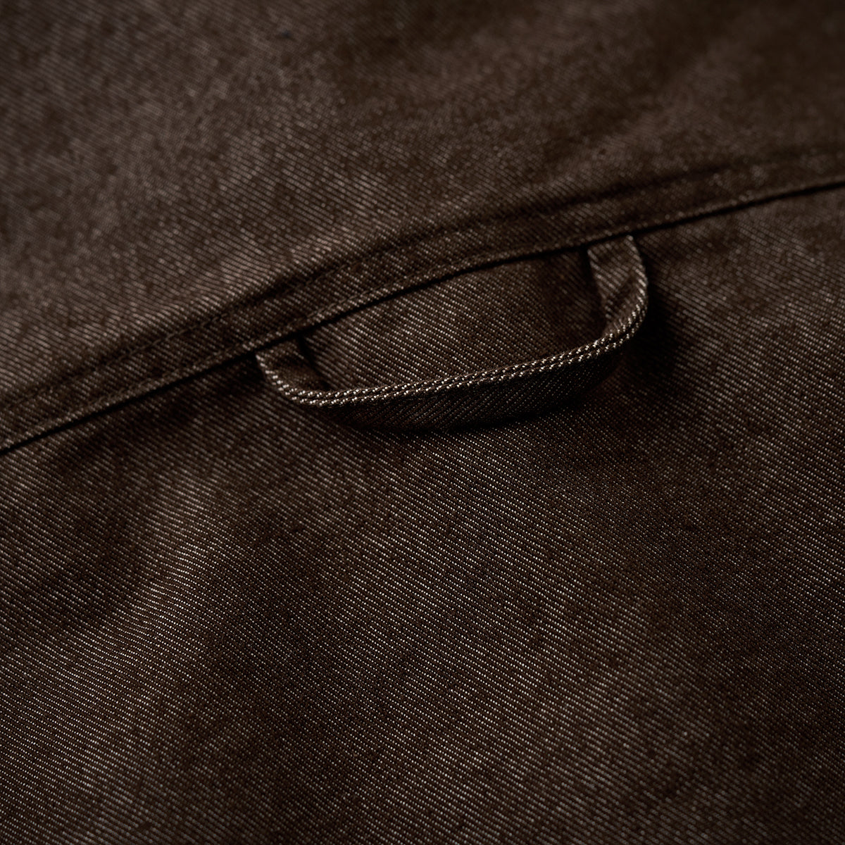 진한 인디고 데님 소재와 에스닉 패턴 안감이 어우러진 워크 셔츠로, 더블 스티치와 프론트 포켓, 로고 자수 등 실용적이면서 세련된 디테일을 갖춘 아이템입니다.