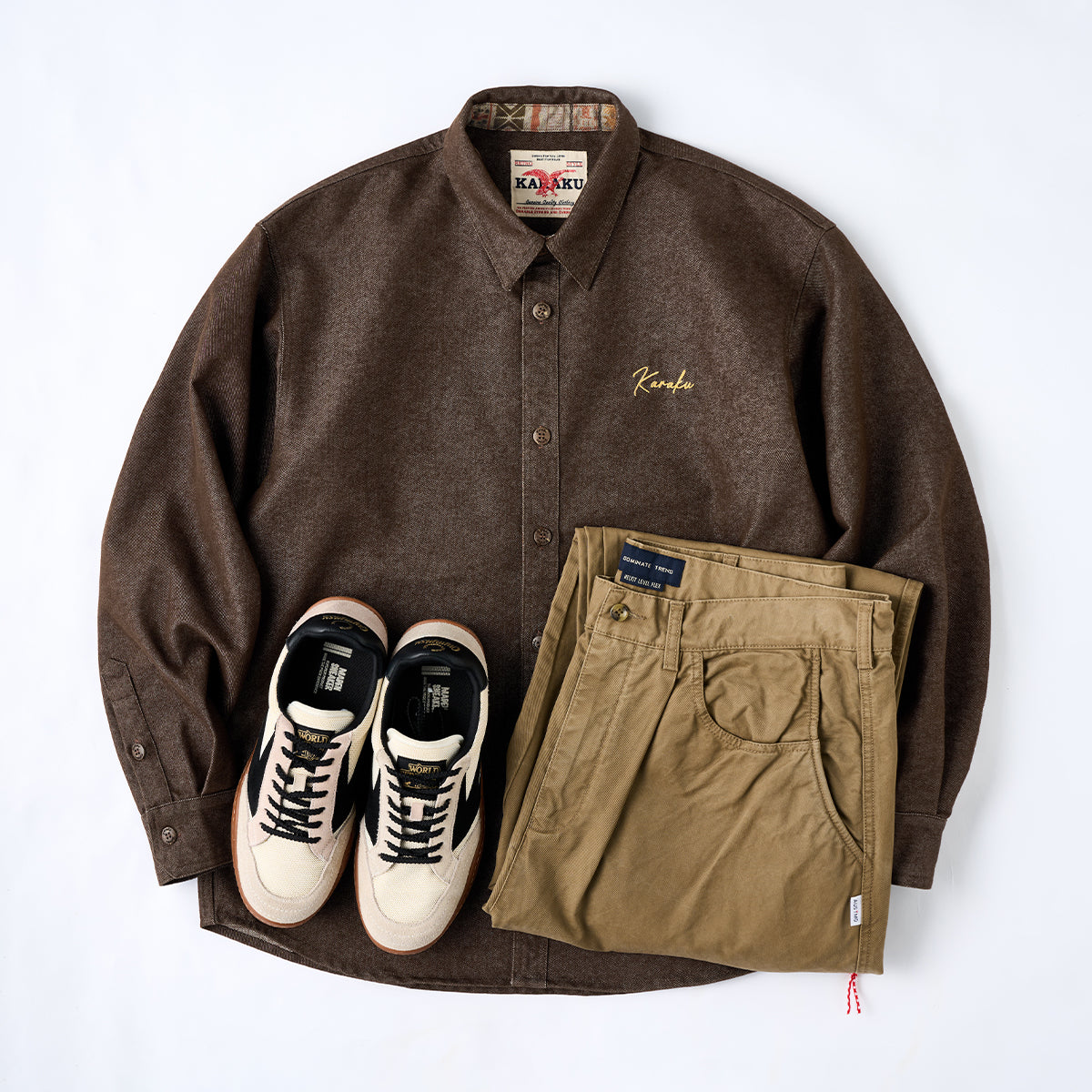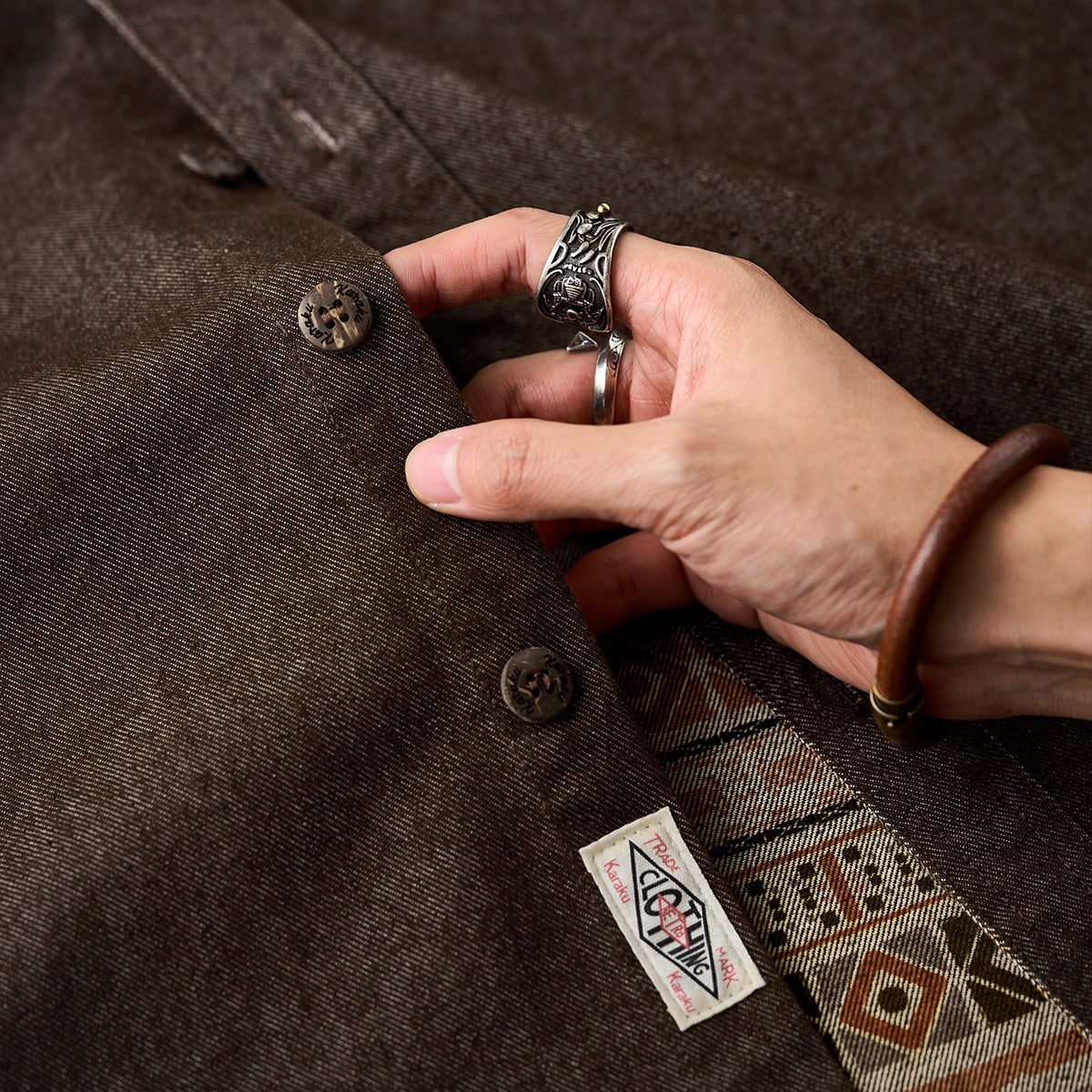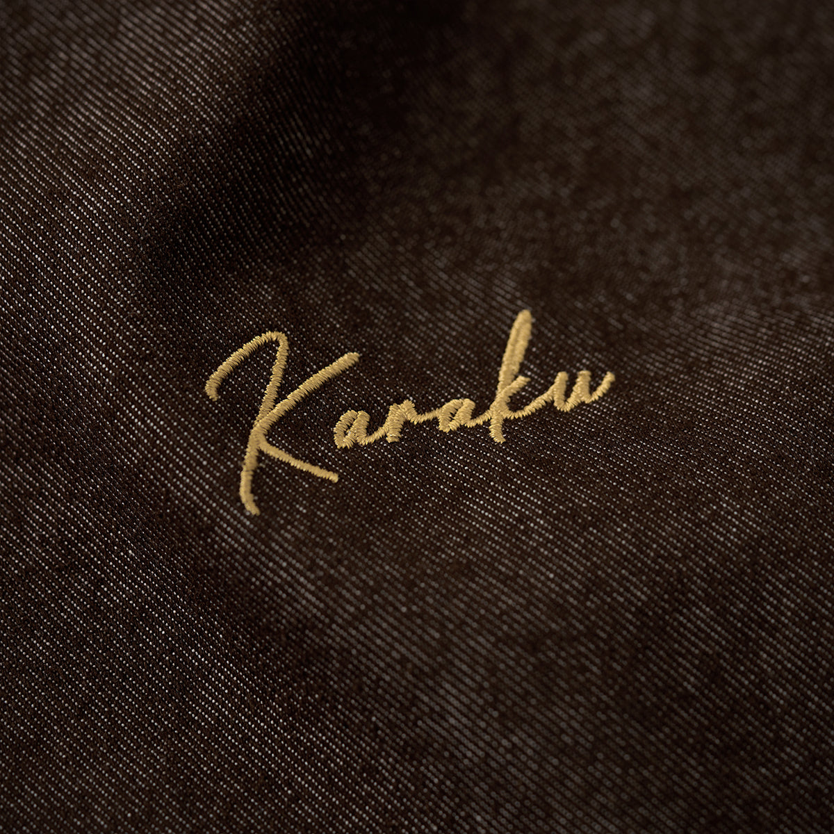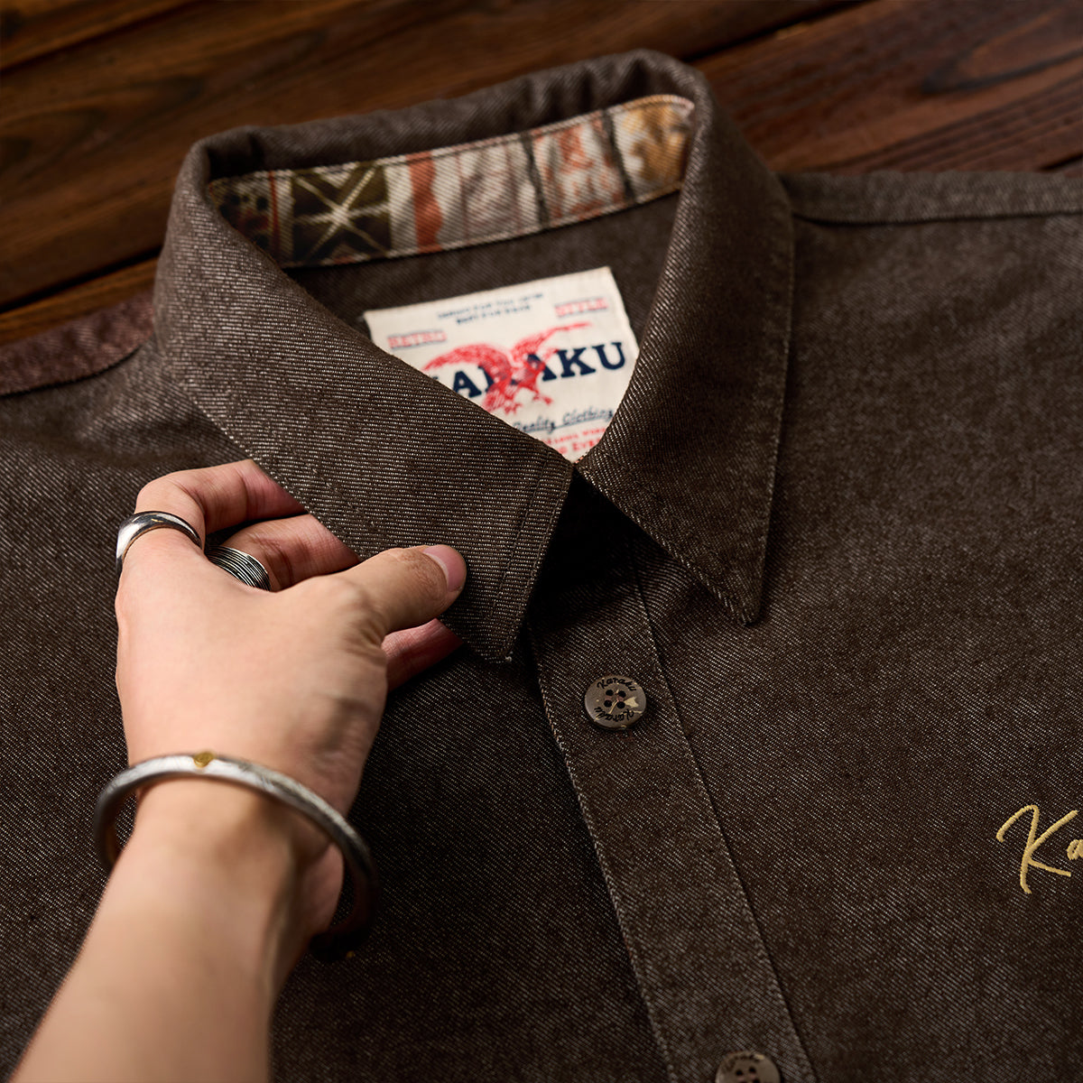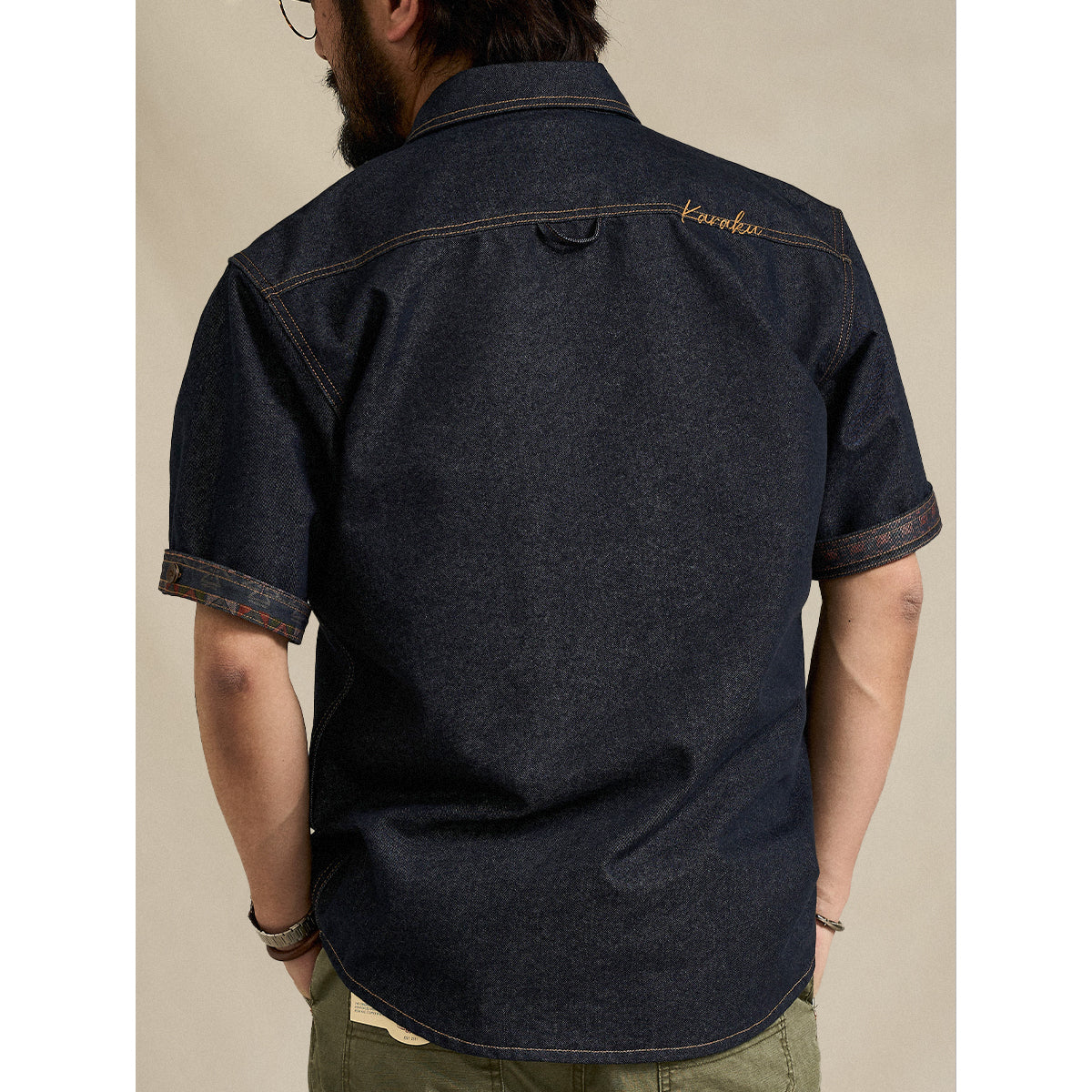【사전예약】「KaraKu」로고 자수 빨간 매듭 끈 에스닉 패턴 안감 데님 셔츠