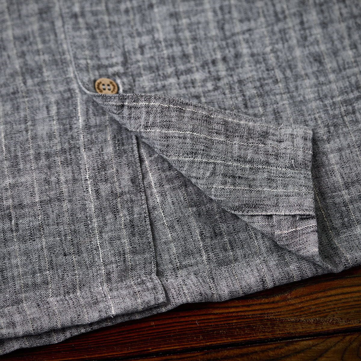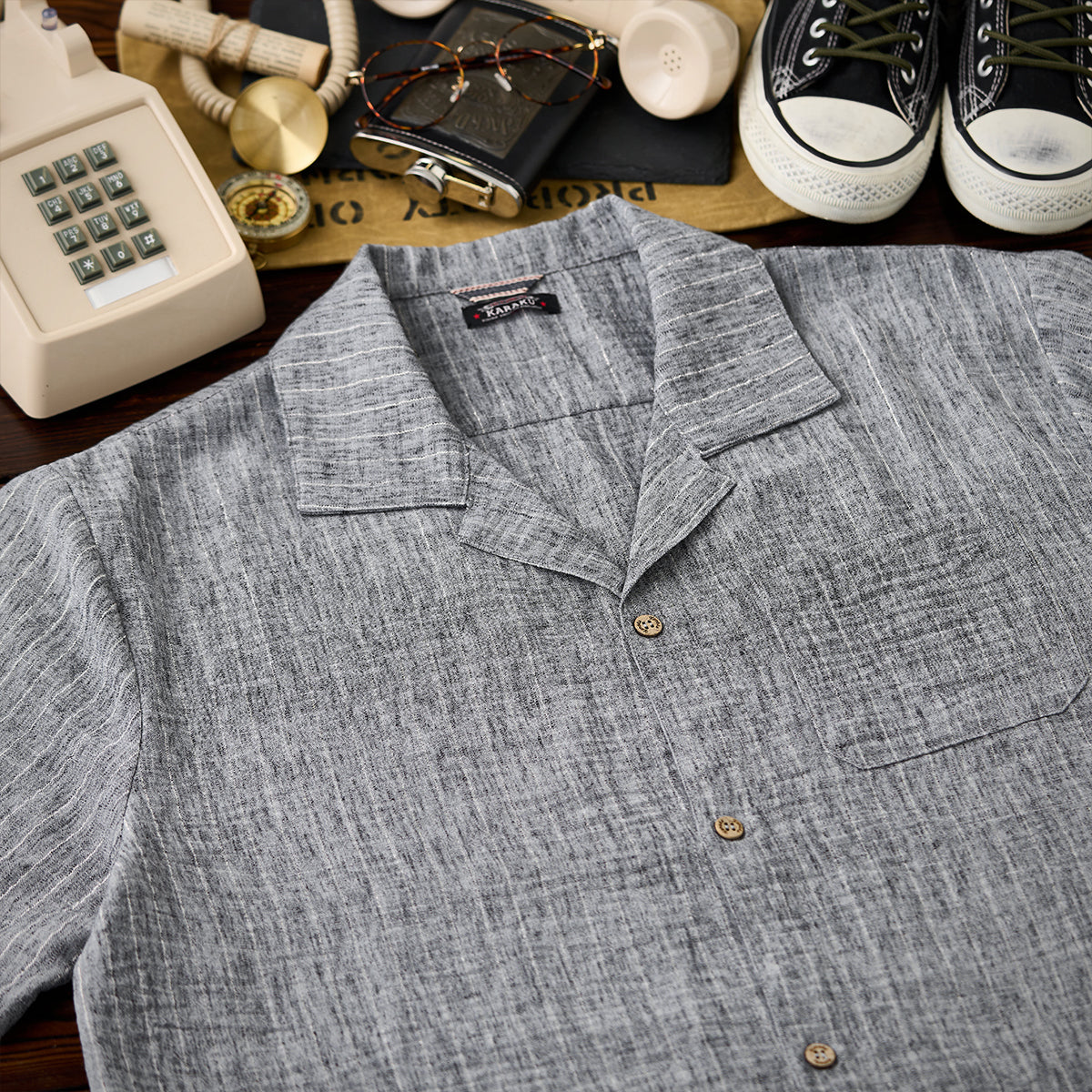 오픈 카라 셔츠는 편안한 분위기로 캐주얼 스타일에 잘 어울리며, 심플한 사각형 가슴 포켓과 나무 느낌의 자연스러운 버튼이 특징입니다.