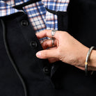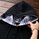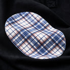 안감에는 팔꿈치 패치와 동일한 체크 패턴을 넣어, 후드나 앞 여밈 사이로 살짝 보이는 패턴이 시선을 끕니다.