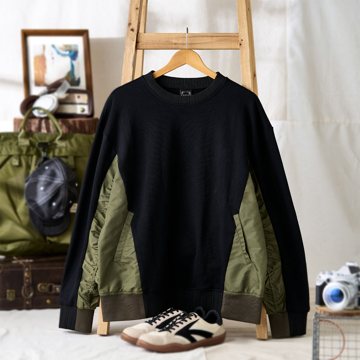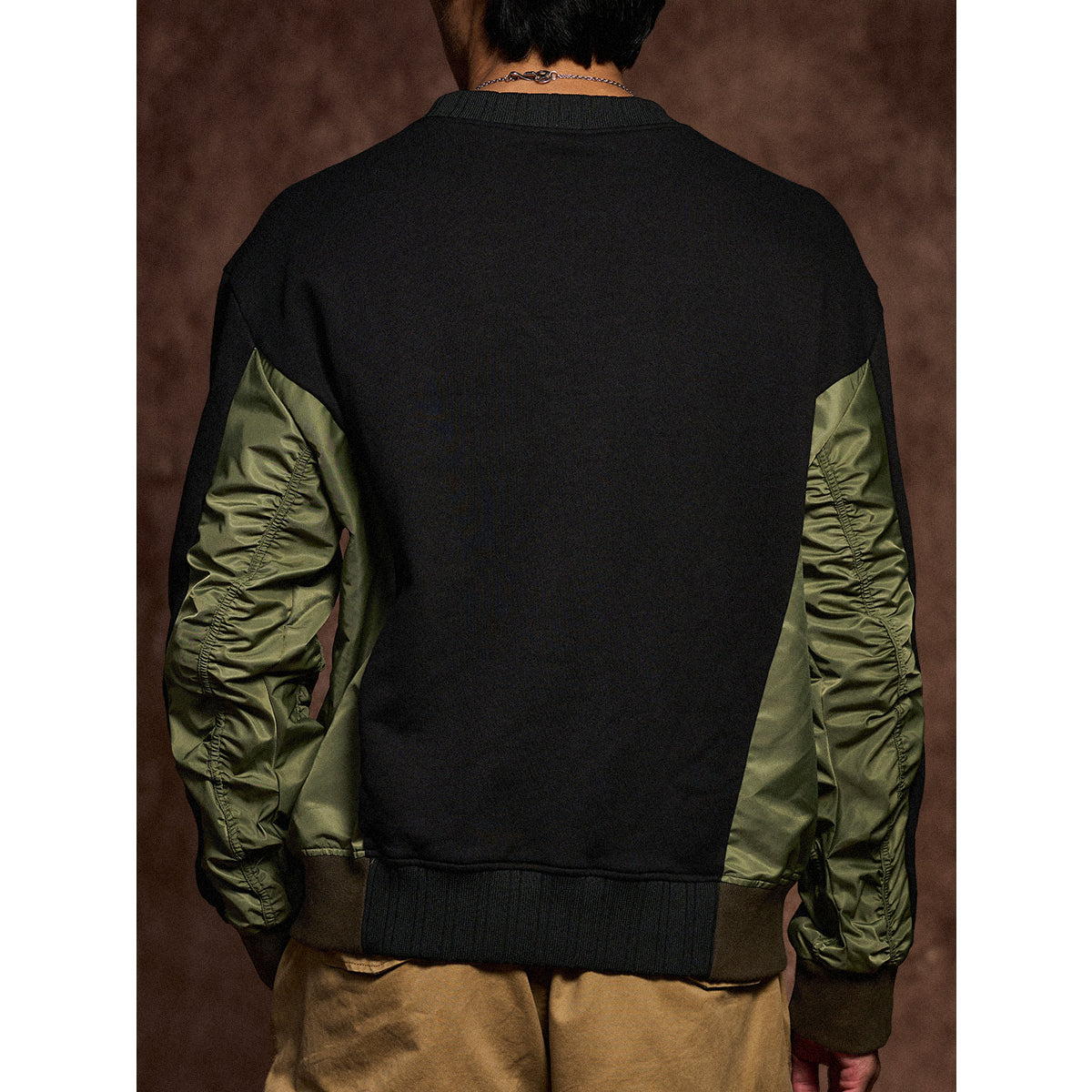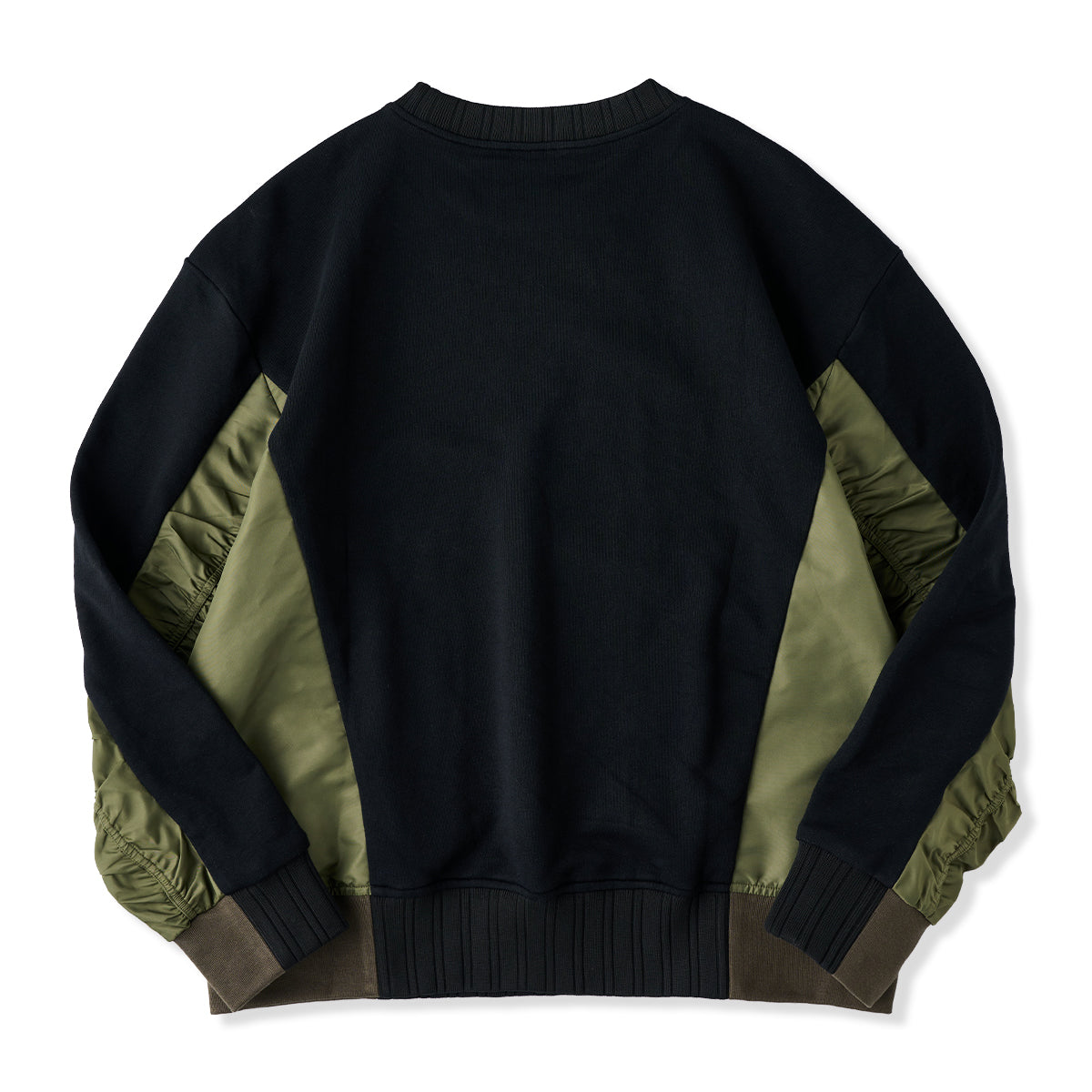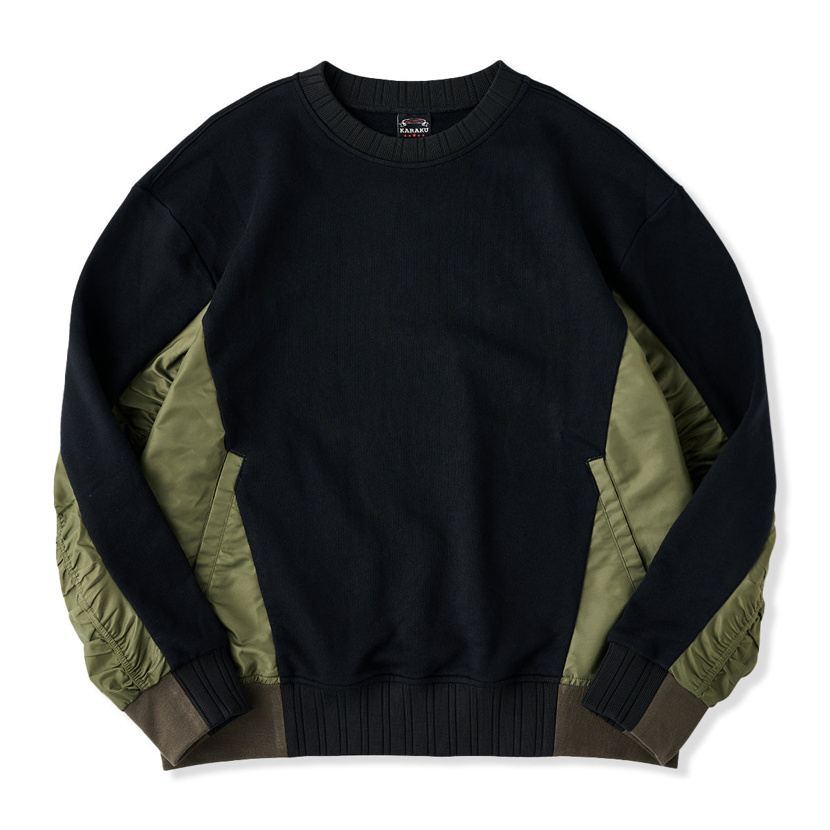 나일론 배색 소매 셔링 처리 풀오버 스웨트셔츠