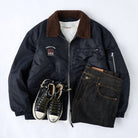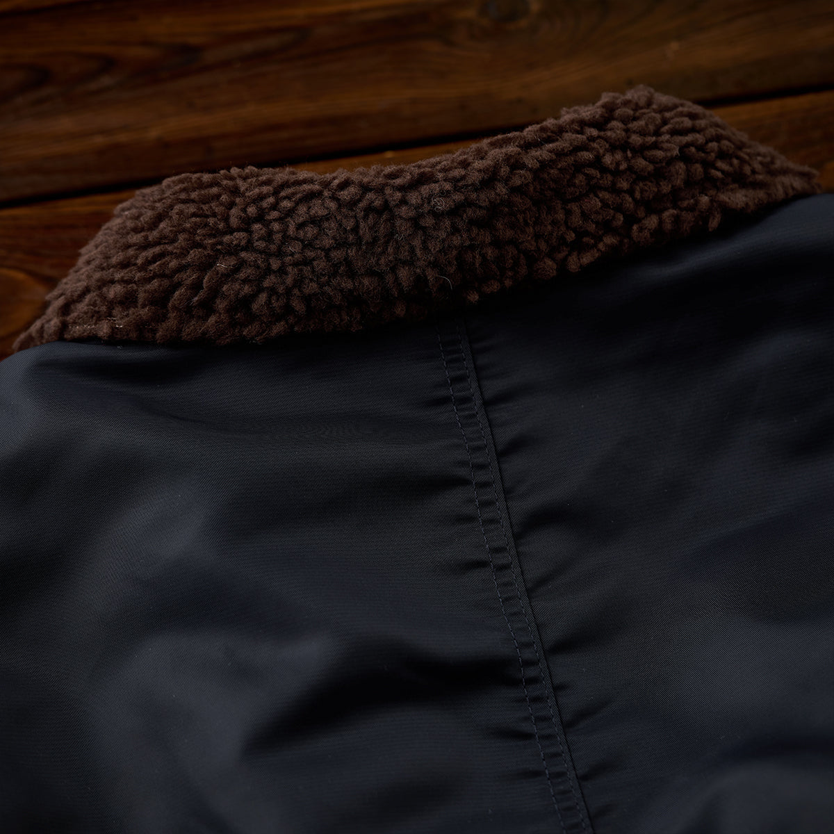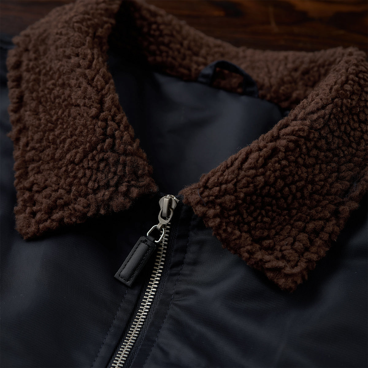 브라운 보아 칼라와 밀리터리 감성의 자수·와펜 디테일이 돋보이는 플라이트 재킷으로, 지퍼형 포켓과 플랩 포켓으로 실용적인 수납이 가능한 아이템입니다.