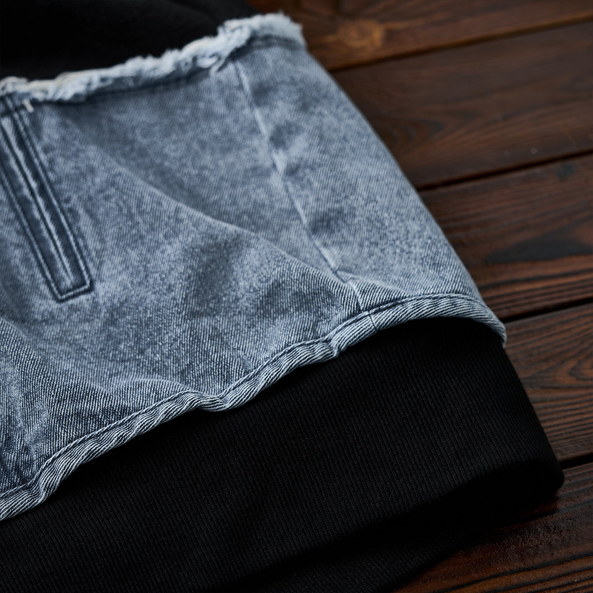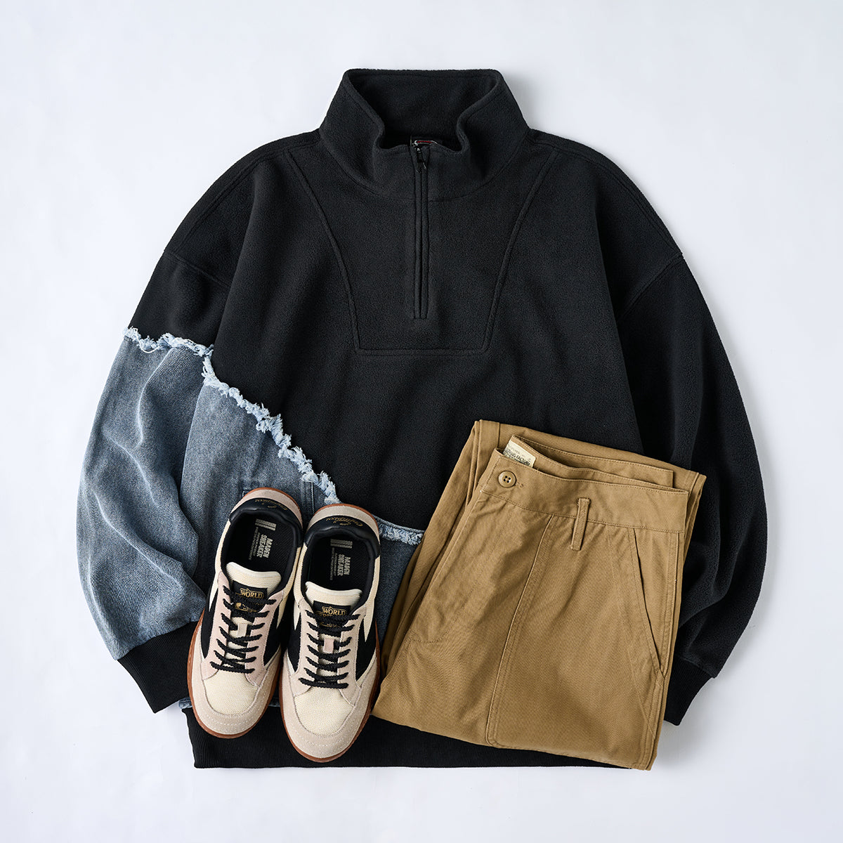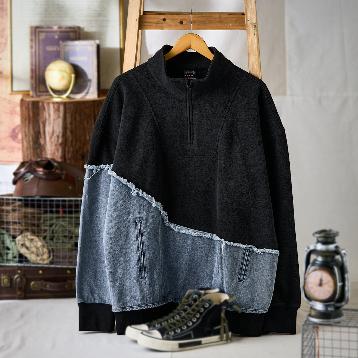 재구성 워싱 데님 배색 하프집업 폴라 플리스 스웨트셔츠