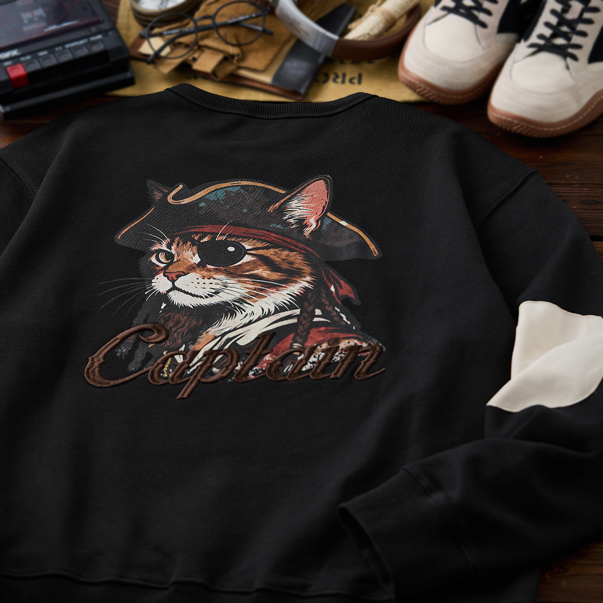 【사전예약】「해적・선장 고양이」프린트 팔꿈치 스웨이드 패치 풀오버 스웨트셔츠