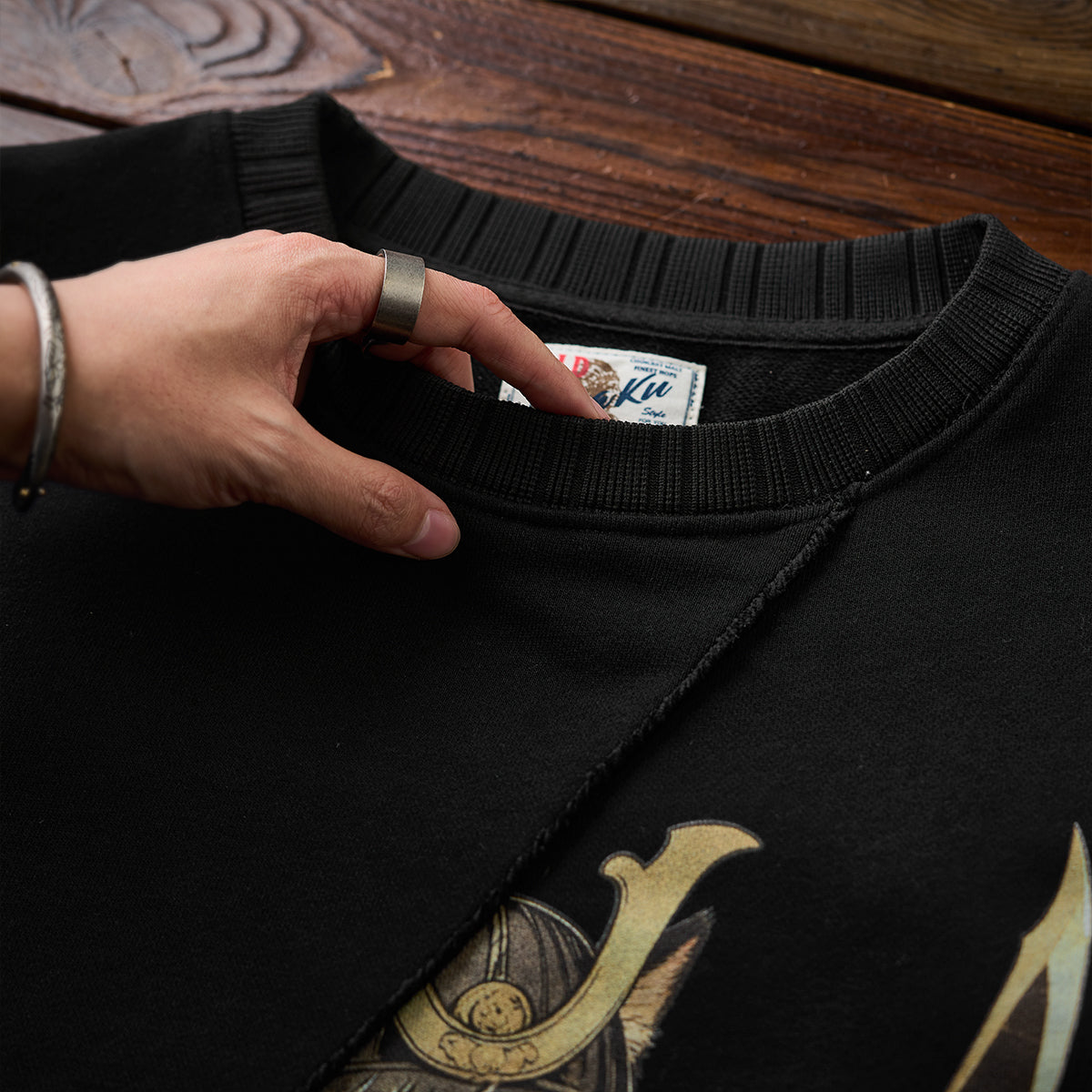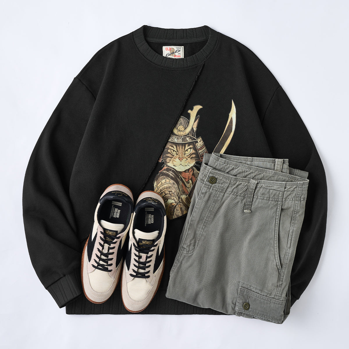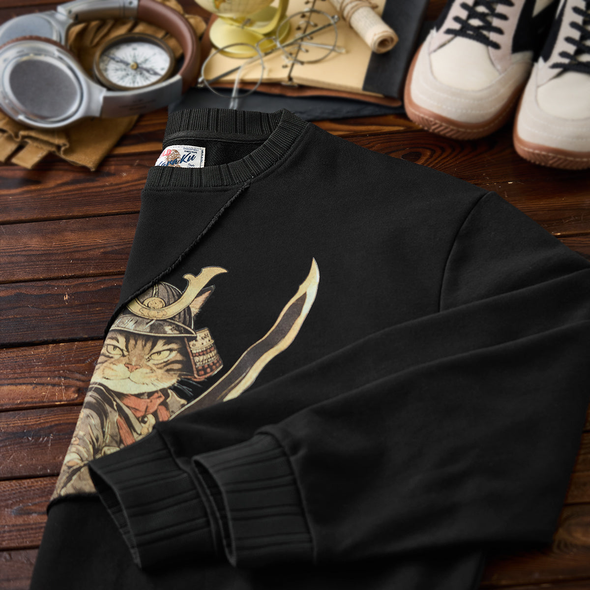 【사전예약】「검을 휘두르는 무사 고양이」프린트 프린지 풀오버 스웨트셔츠