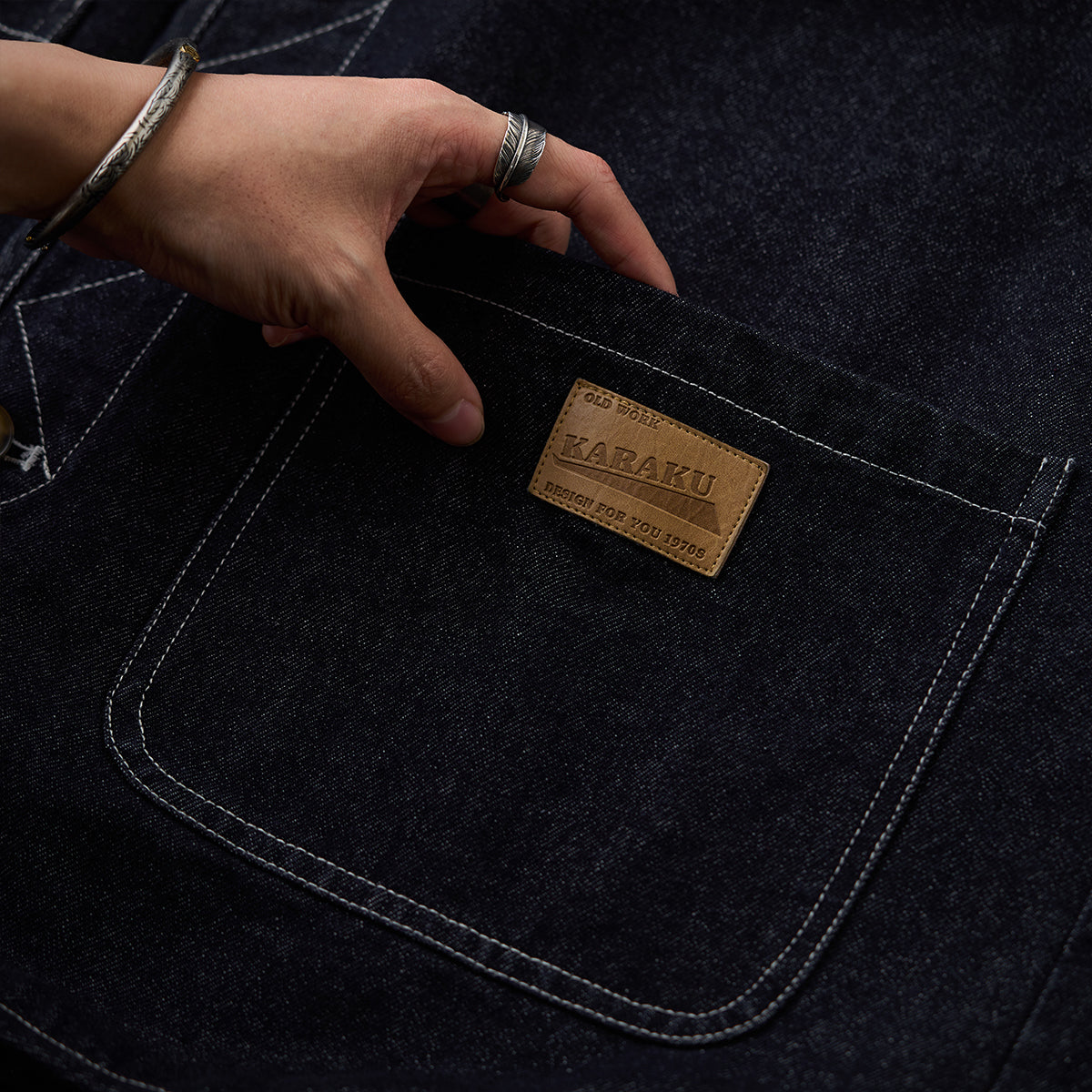 【사전예약】「KaraKu」로고 자수 데님 배색 호박 퀼팅 솜 안감 자켓