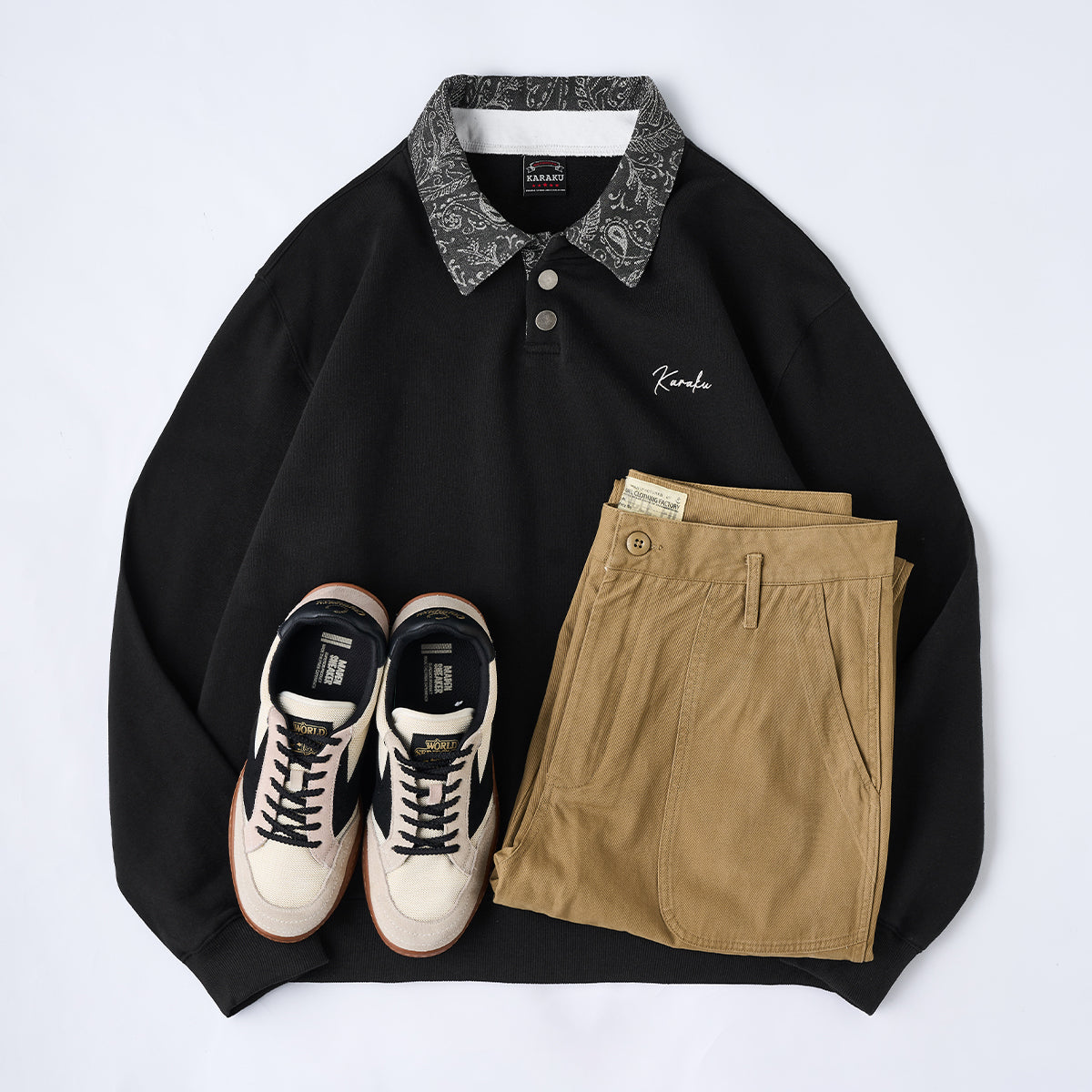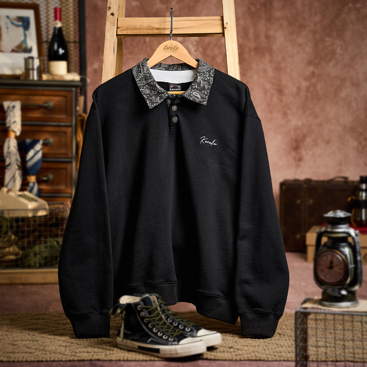 【사전예약】Karaku 자수 칼라·앞판 페이즐리 자카드 배색 폴로 스웨트셔츠