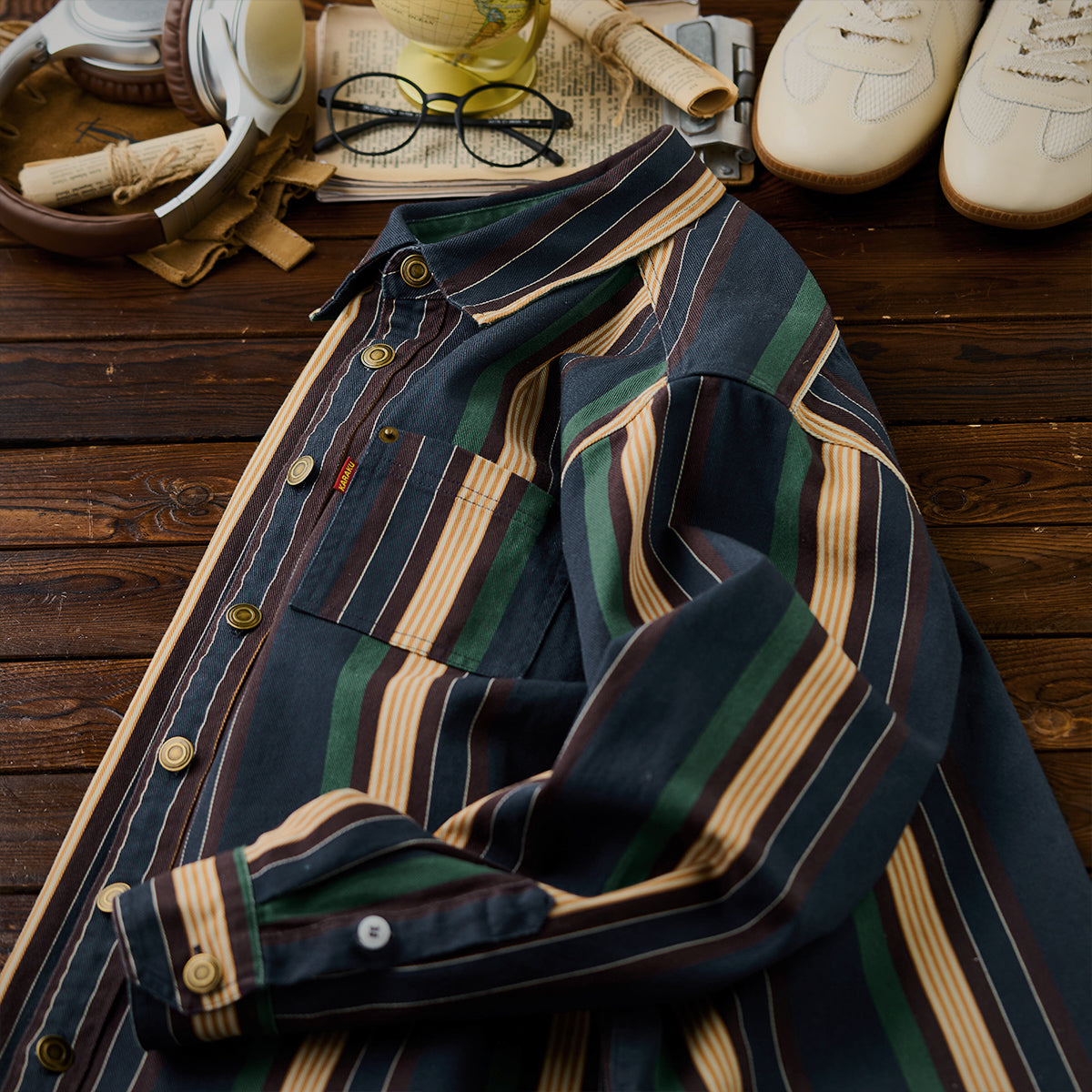 【사전예약】유즈드 가공 버튼 레트로 스트라이프 자카드 워크 셔츠