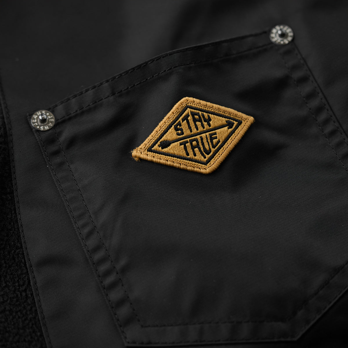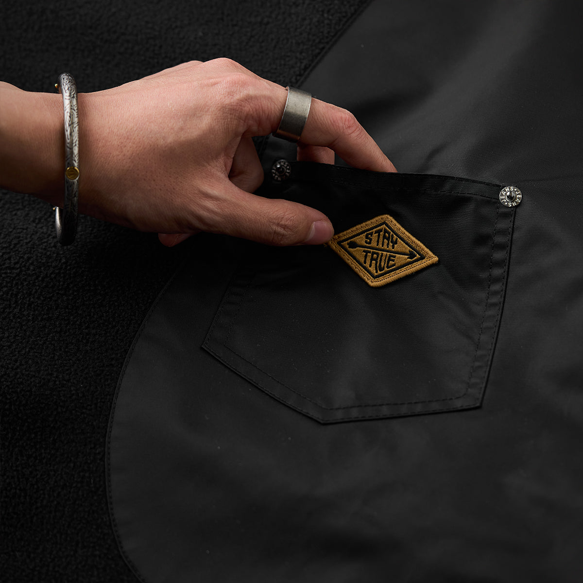 【사전예약】「STAY TRUE」자수 와펜 · 언밸런스 나일론 패치 포켓 플리스 스웨트