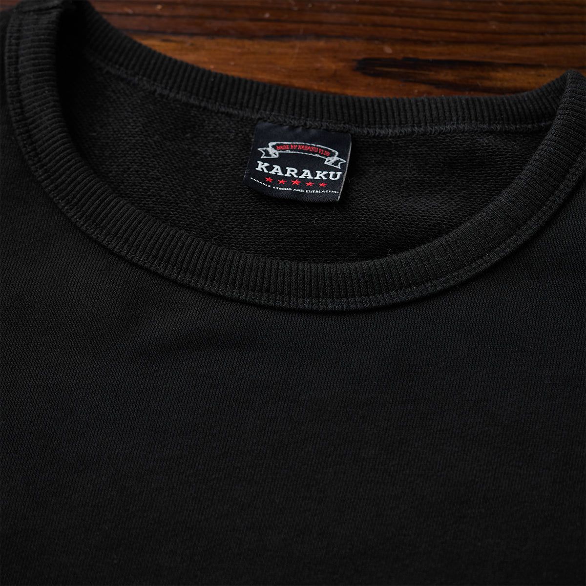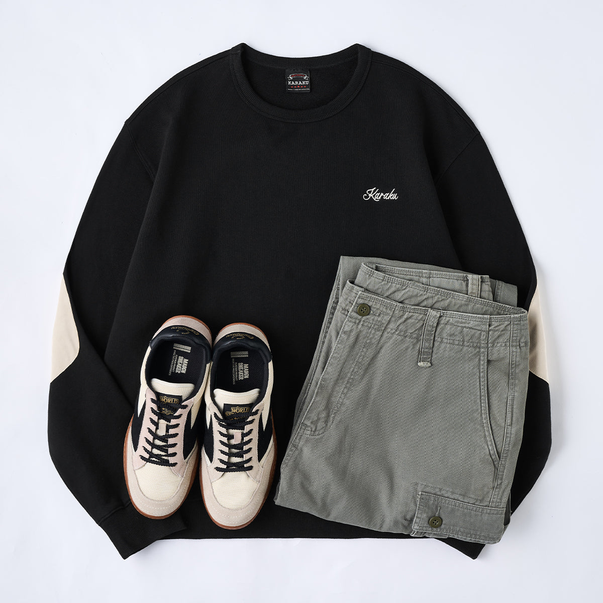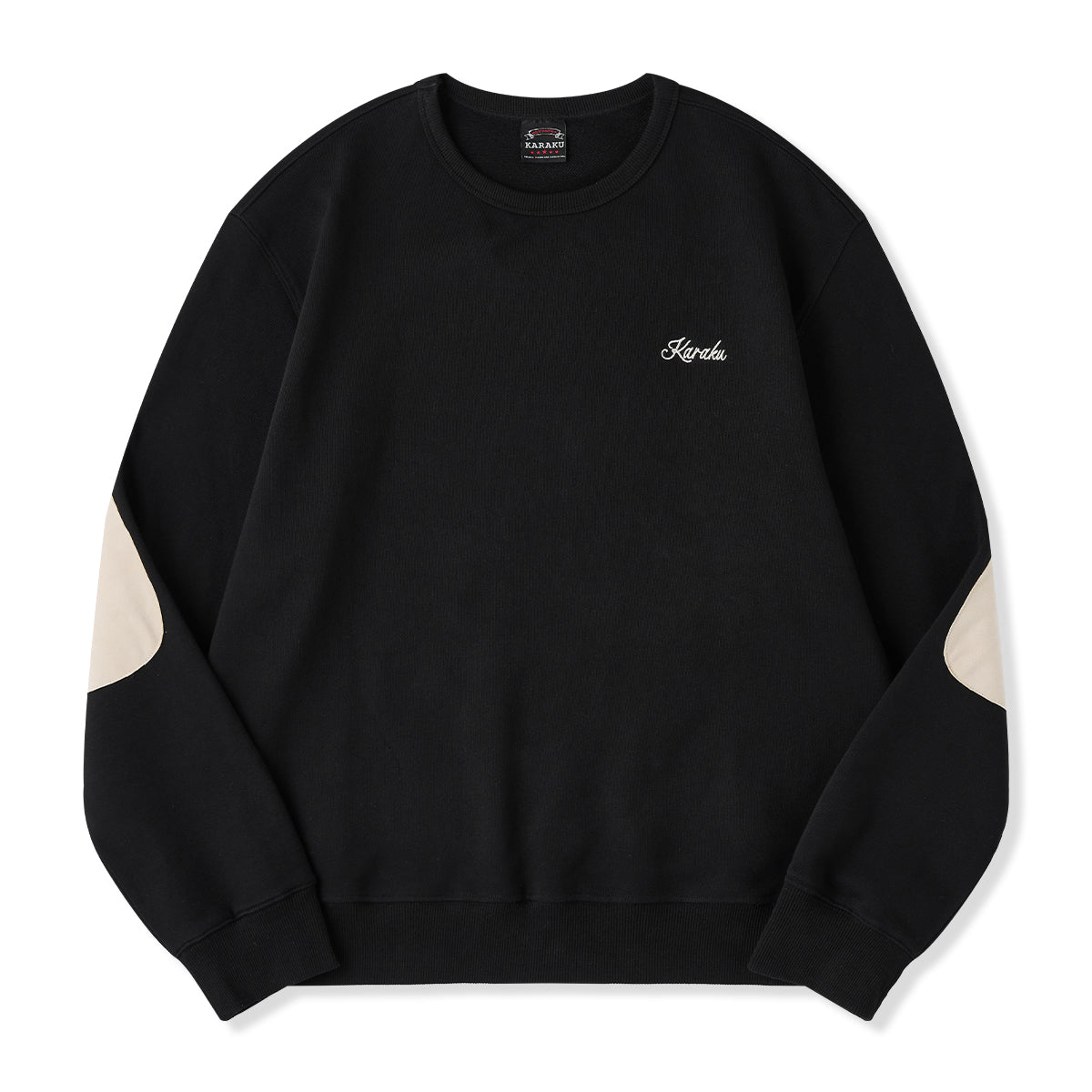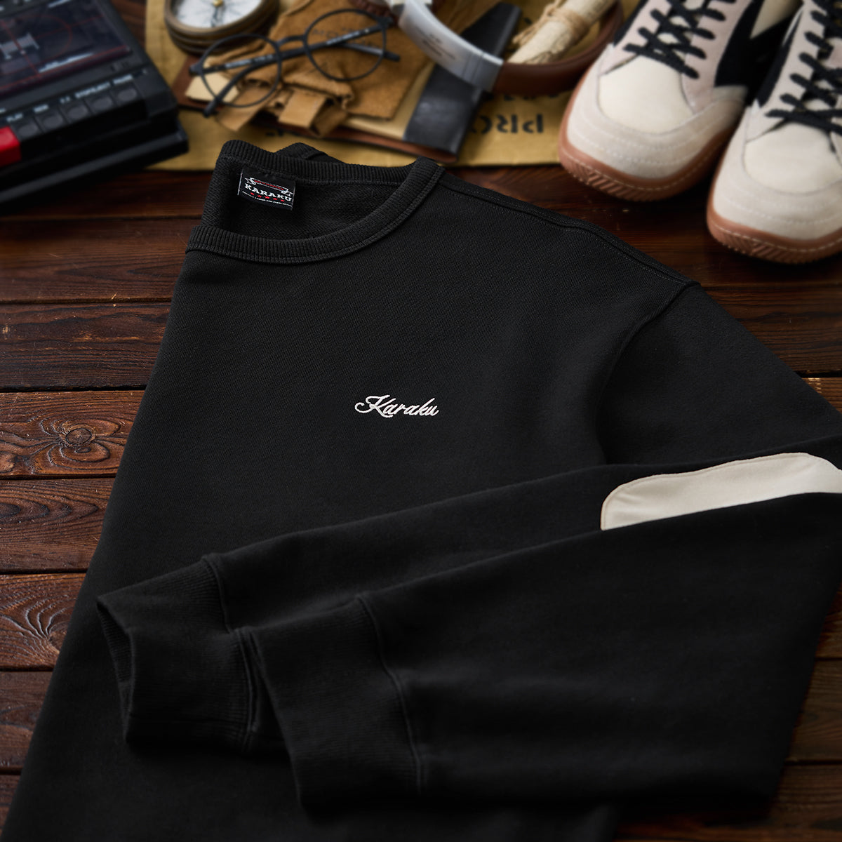 ‘해적·캡틴 고양이’와 ‘CAPTAIN’ 영문 자수가 포인트인 스웨트셔츠입니다. 은은한 KARAKU 로고 자수와 팔꿈치 스웨이드 패치가 세련된 디테일과 내구성을 더해 줍니다.