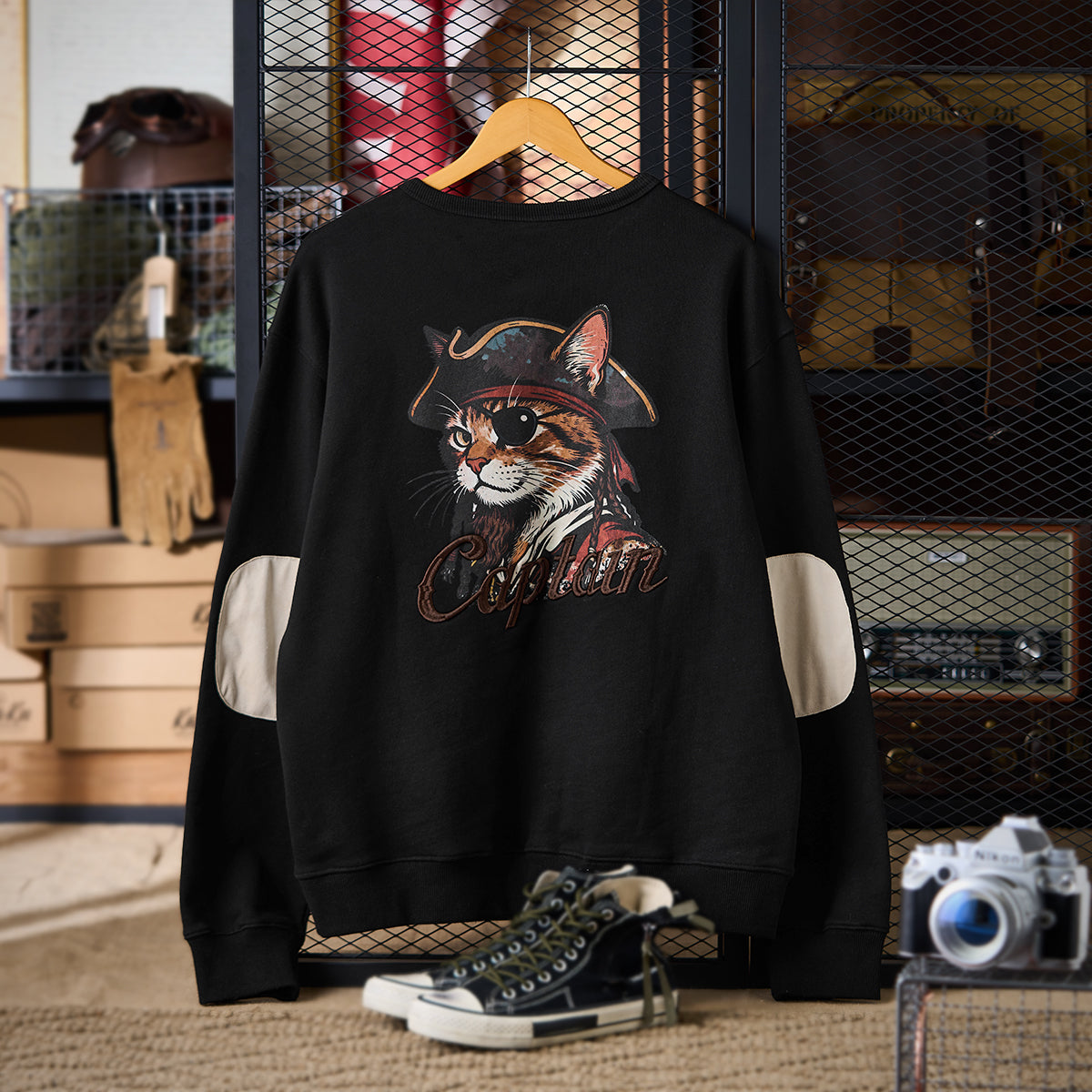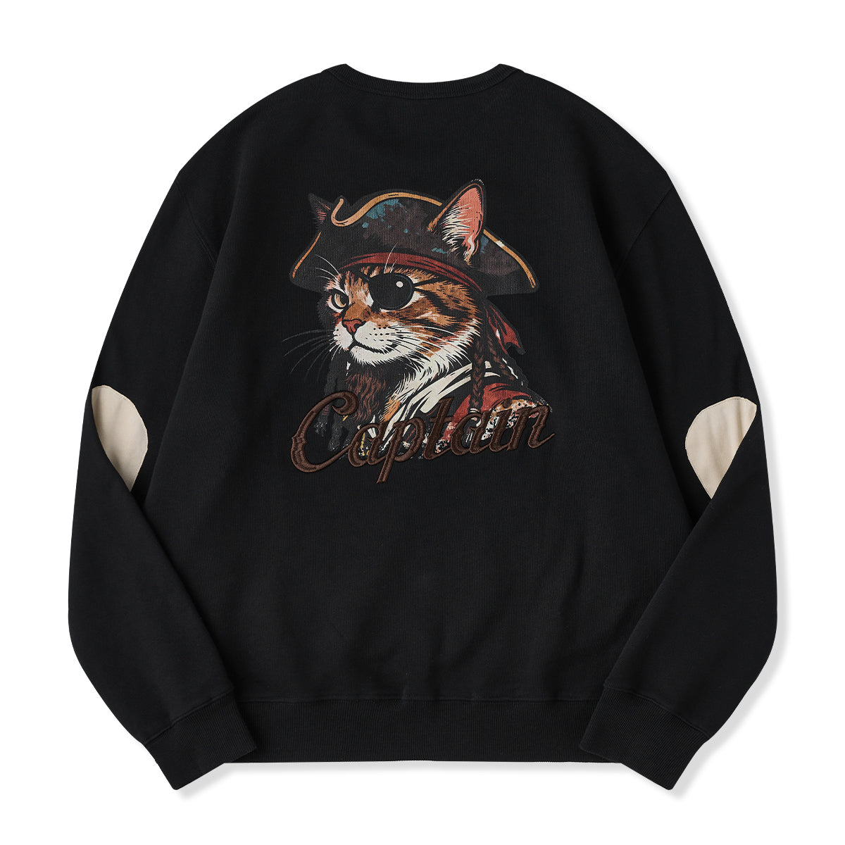 【사전예약】「해적・선장 고양이」프린트 팔꿈치 스웨이드 패치 풀오버 스웨트셔츠