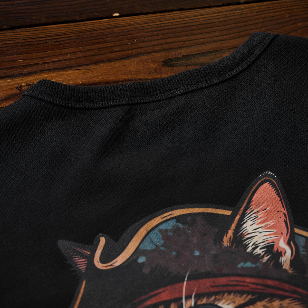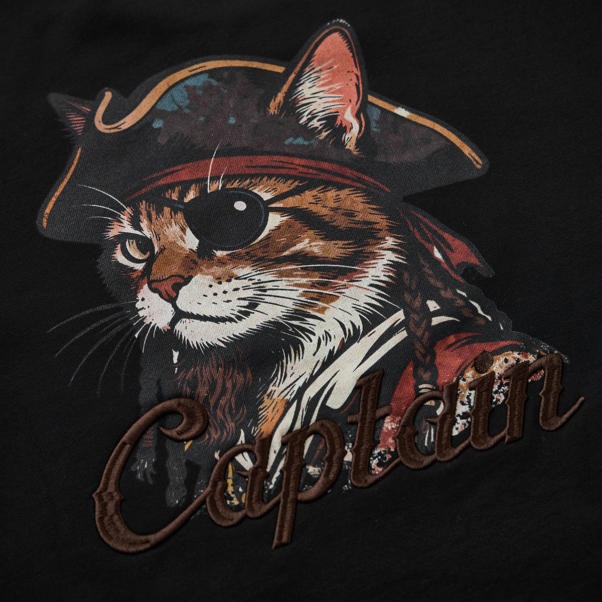 뒷면의 ‘해적 선장 고양이’ 프린트가 시선을 사로잡으며, 블랙톤에 조화를 이루는 ‘CAPTAIN’ 영문 자수가 프린트를 더욱 돋보이게 합니다.