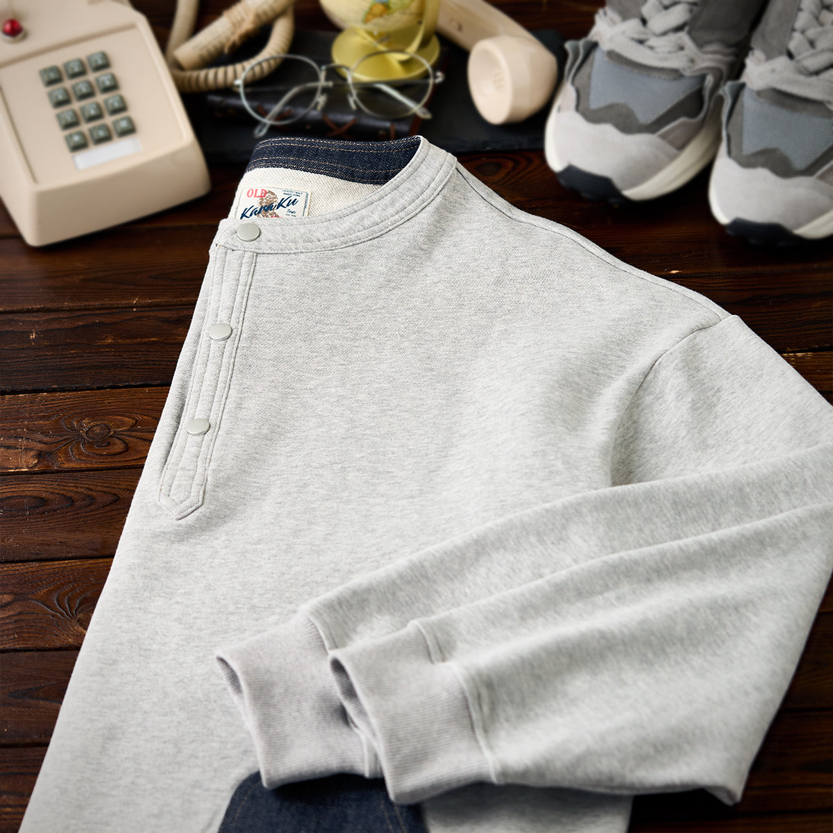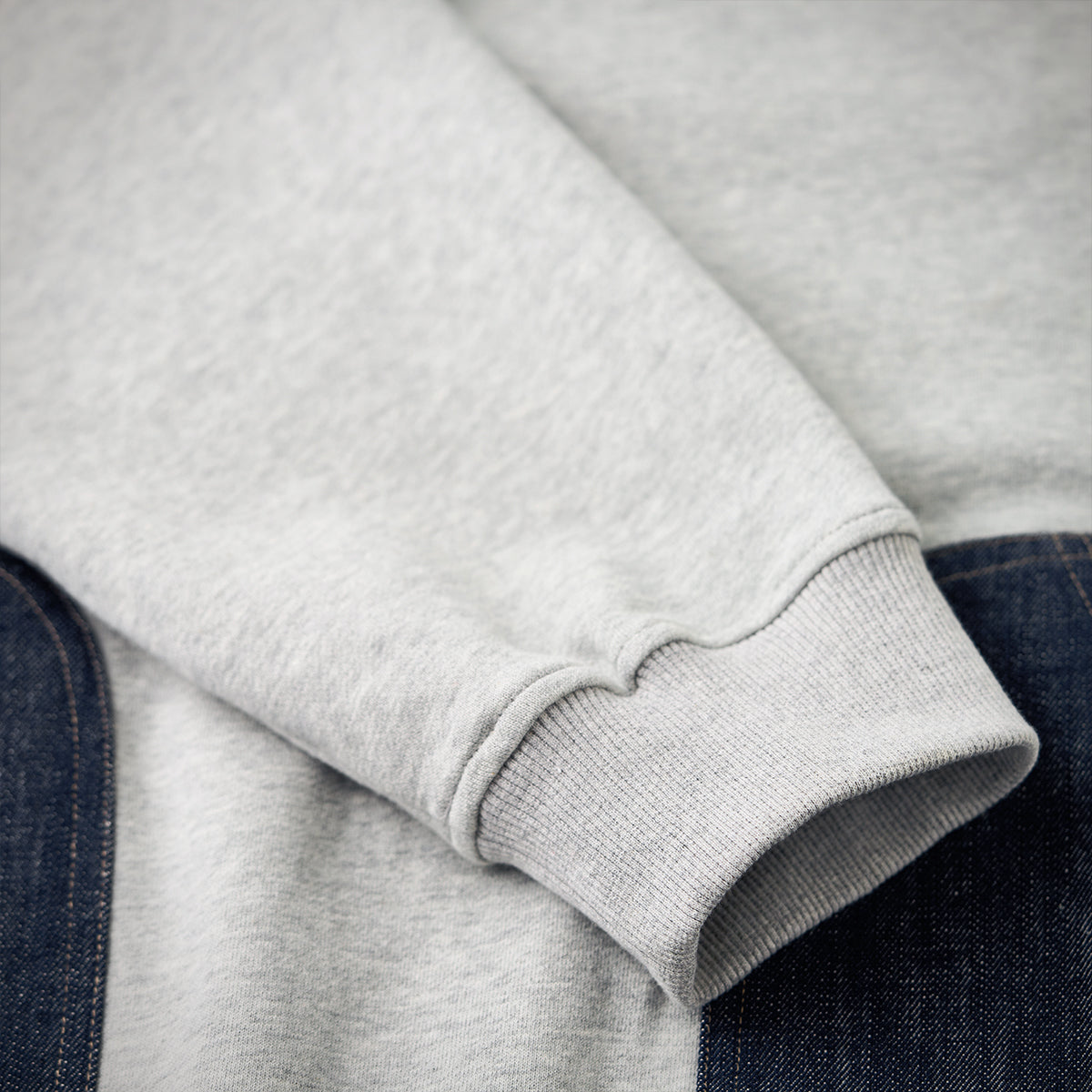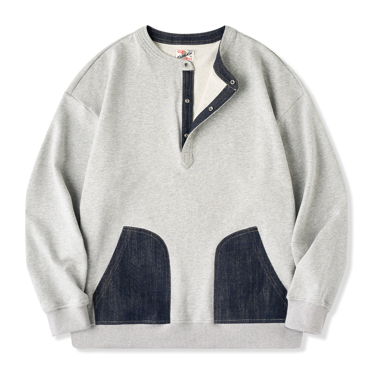 【사전예약】이종 소재 배색 포켓·앞단 데님 헨리넥 스웨트셔츠