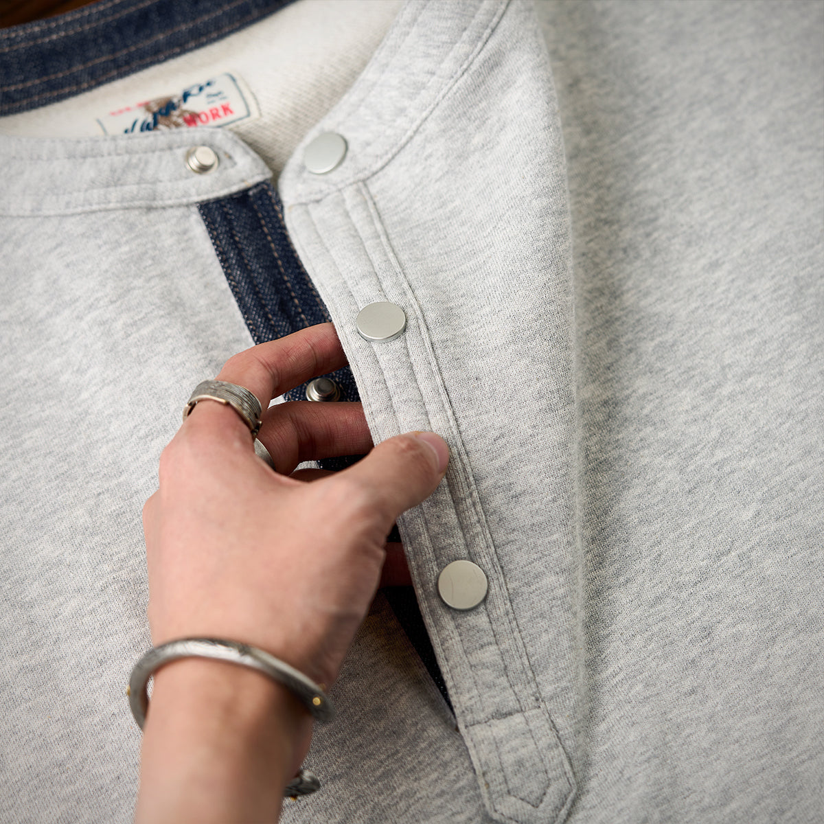 전체 면 소재에 데님 디테일을 더한 헨리넥 스웨트셔츠입니다. 여유로운 실루엣과 버튼 여밈으로 다양한 연출이 가능하며, 데일리 캐주얼 아이템으로 활용하기 좋습니다.