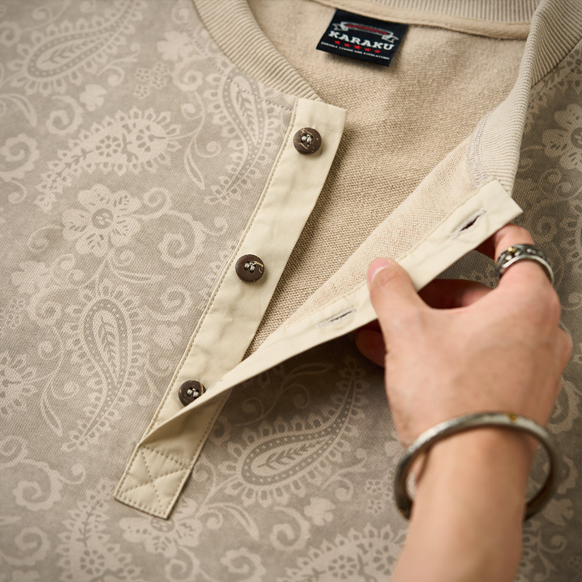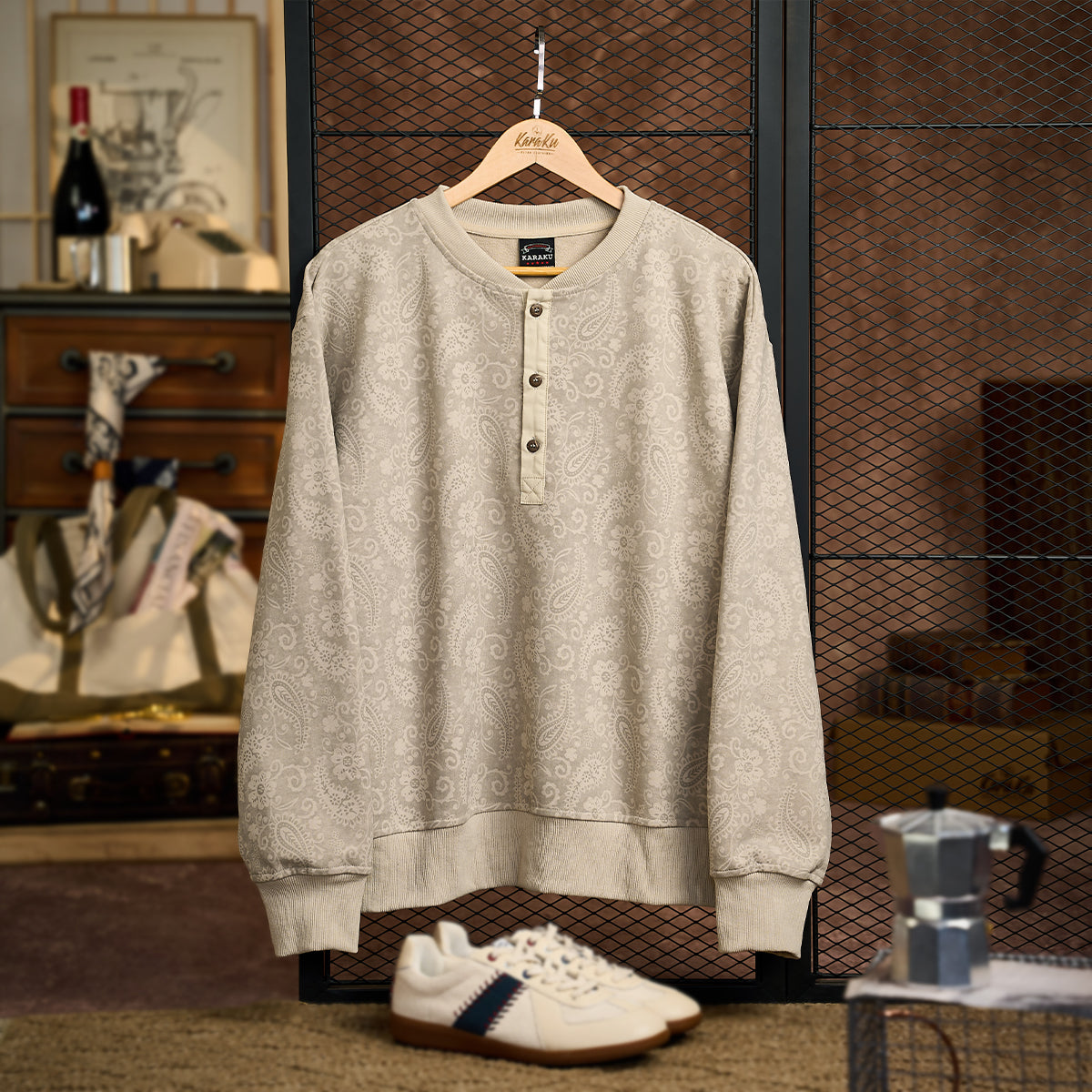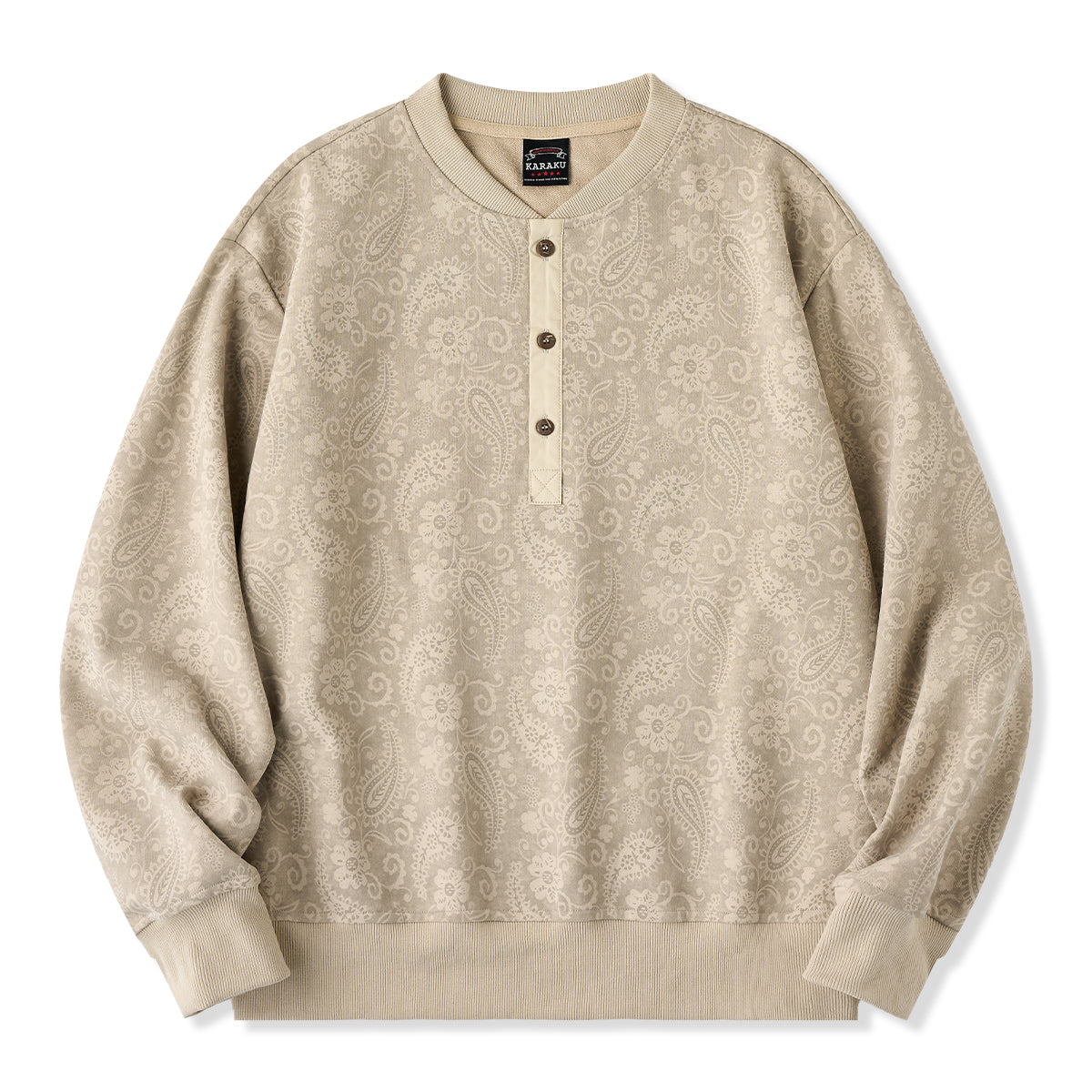 페이즐리 패턴이 포인트인 하프 버튼 스웨트입니다. 시보리 마감으로 핏감과 보온성을 높여 가을·겨울 시즌에 착용하기 좋습니다.