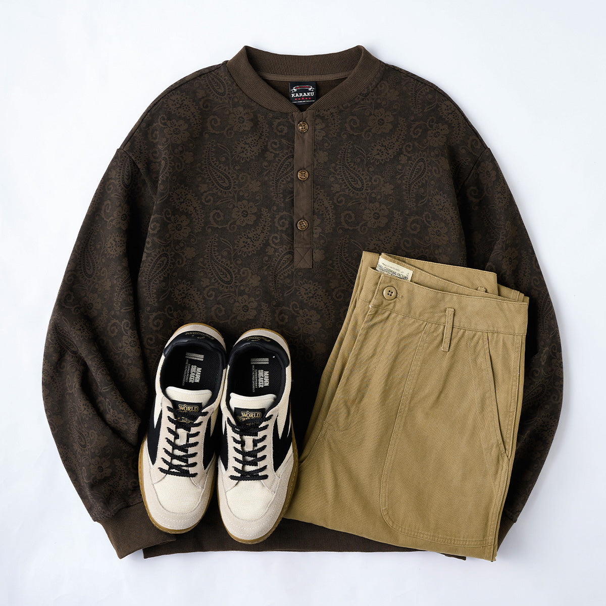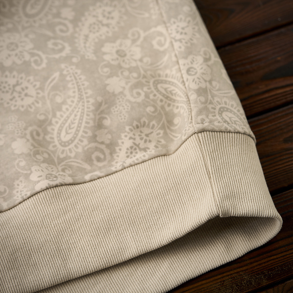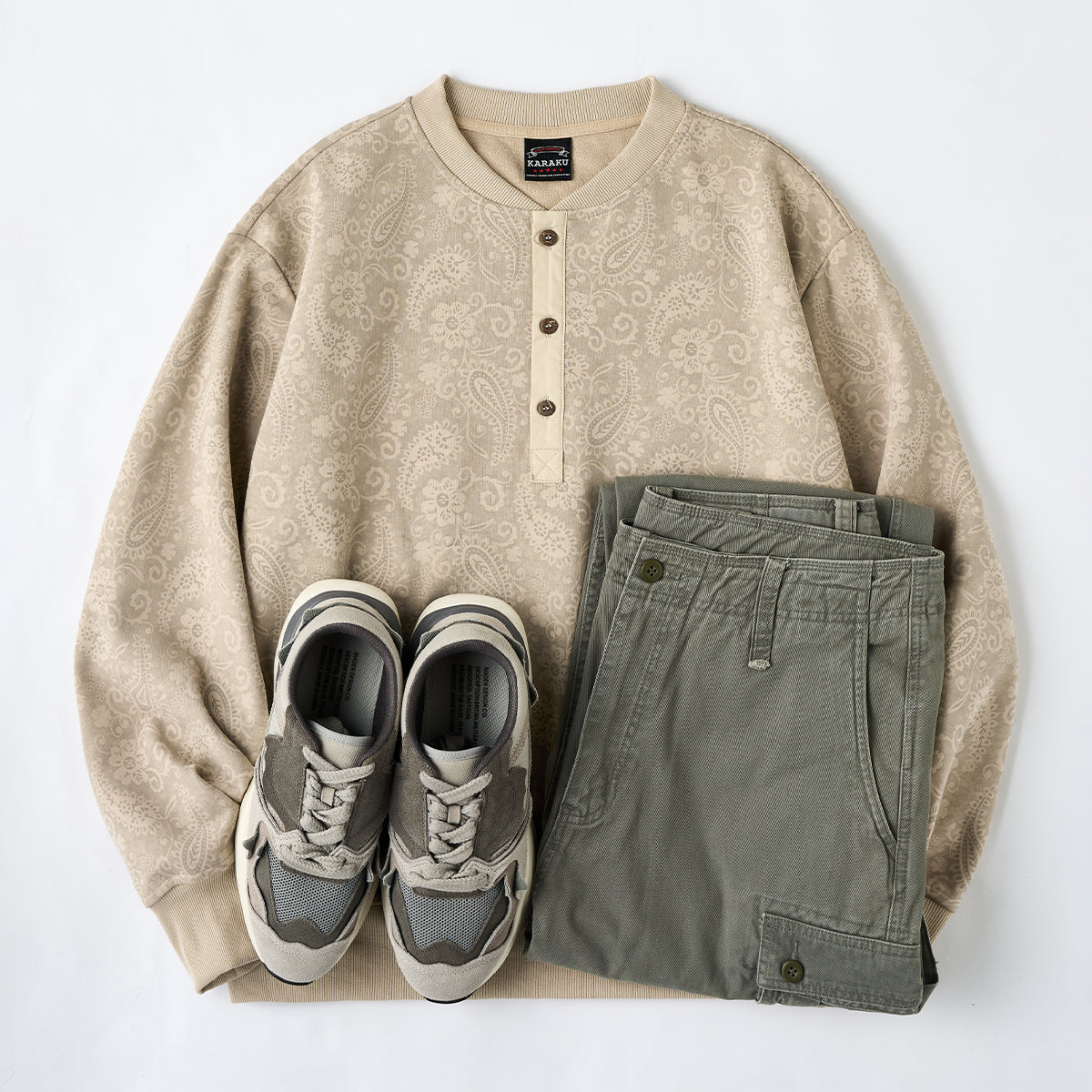 페이즐리 패턴이 포인트인 하프 버튼 스웨트입니다. 시보리 마감으로 핏감과 보온성을 높여 가을·겨울 시즌에 착용하기 좋습니다.
