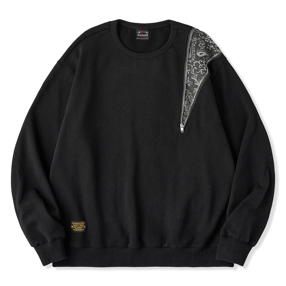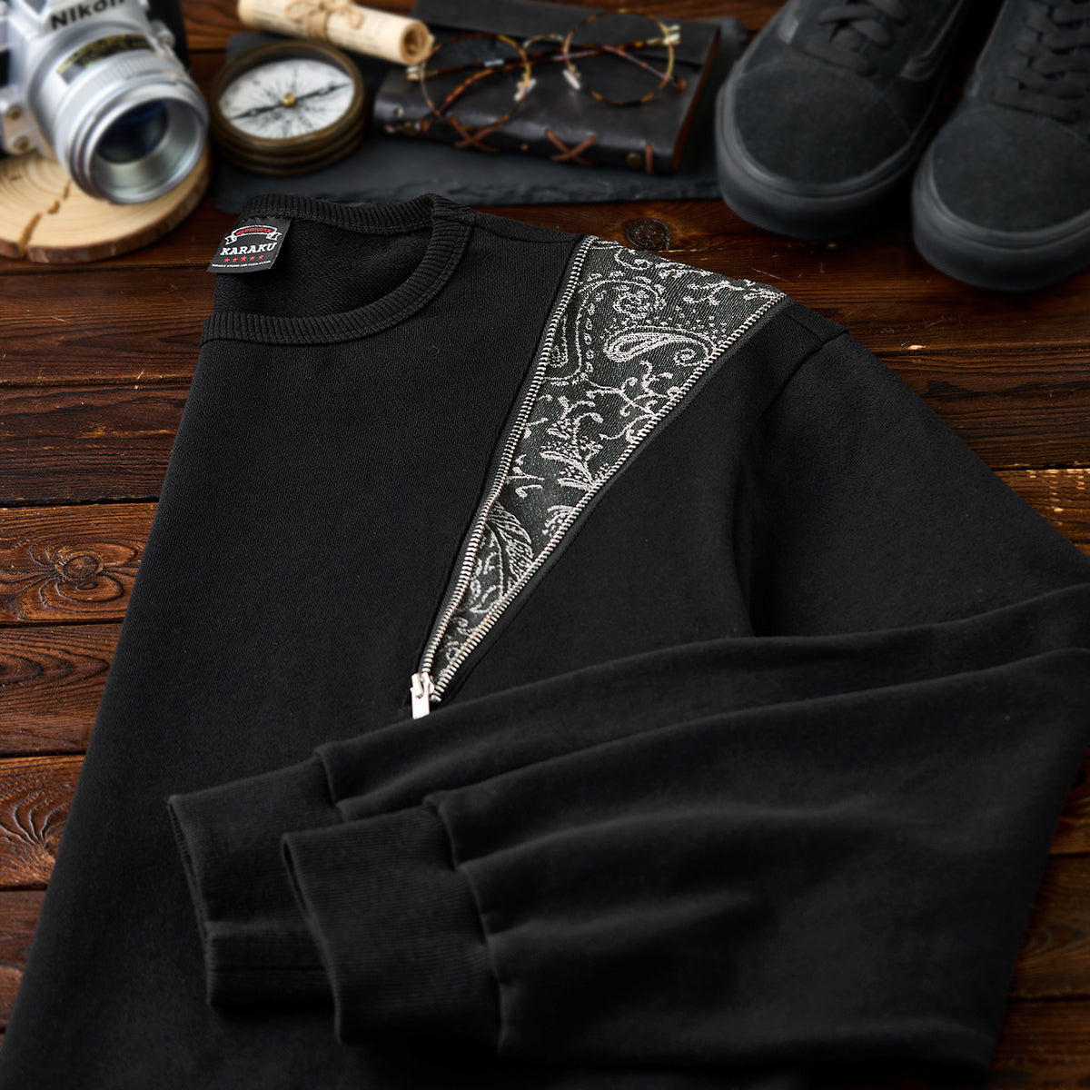코튼 크루넥 풀오버 스웨트셔츠로, 페이즐리 데님 배색과 지퍼 디테일이 포인트이며, 차분한 컬러감으로 데일리 캐주얼에 잘 어울립니다.