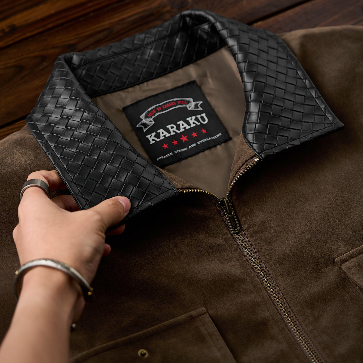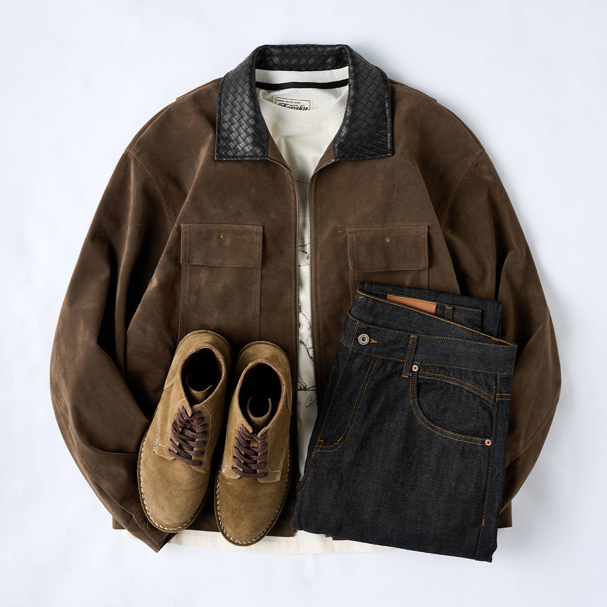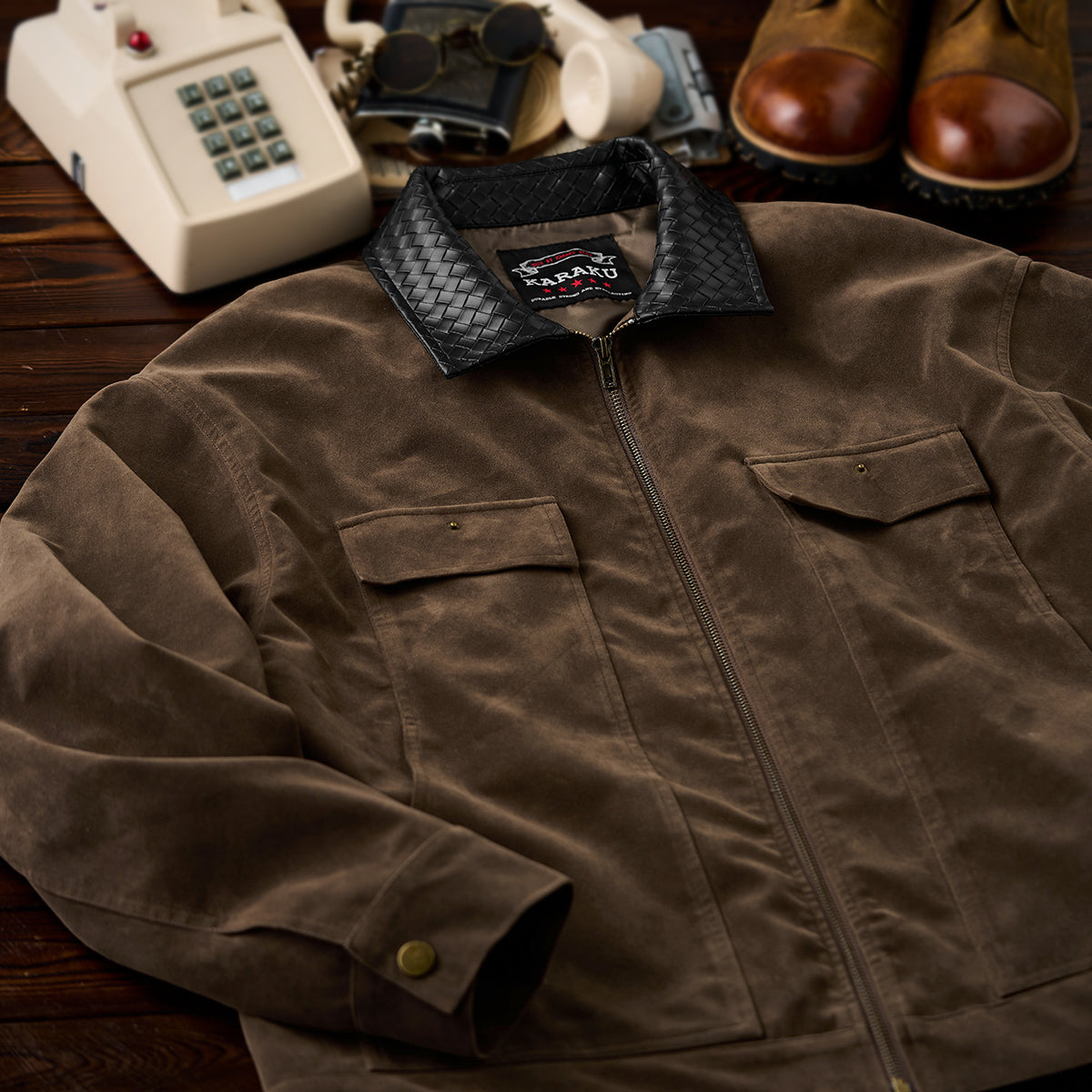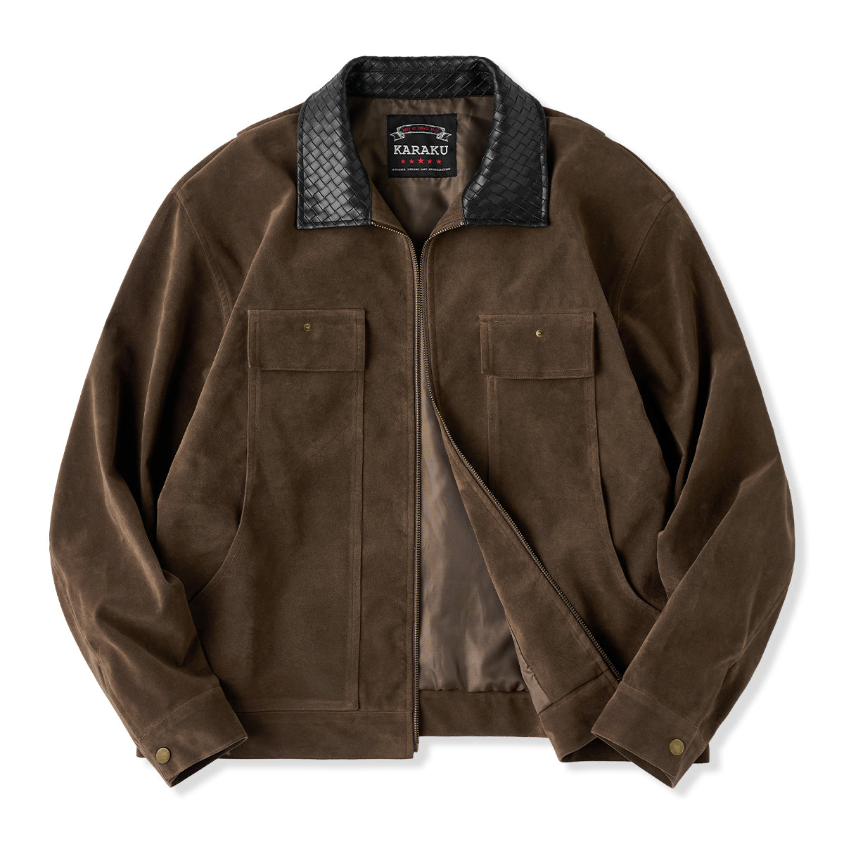 【사전예약】브레이드 가죽 칼라 배색 유니크 포켓 스웨이드 자켓
