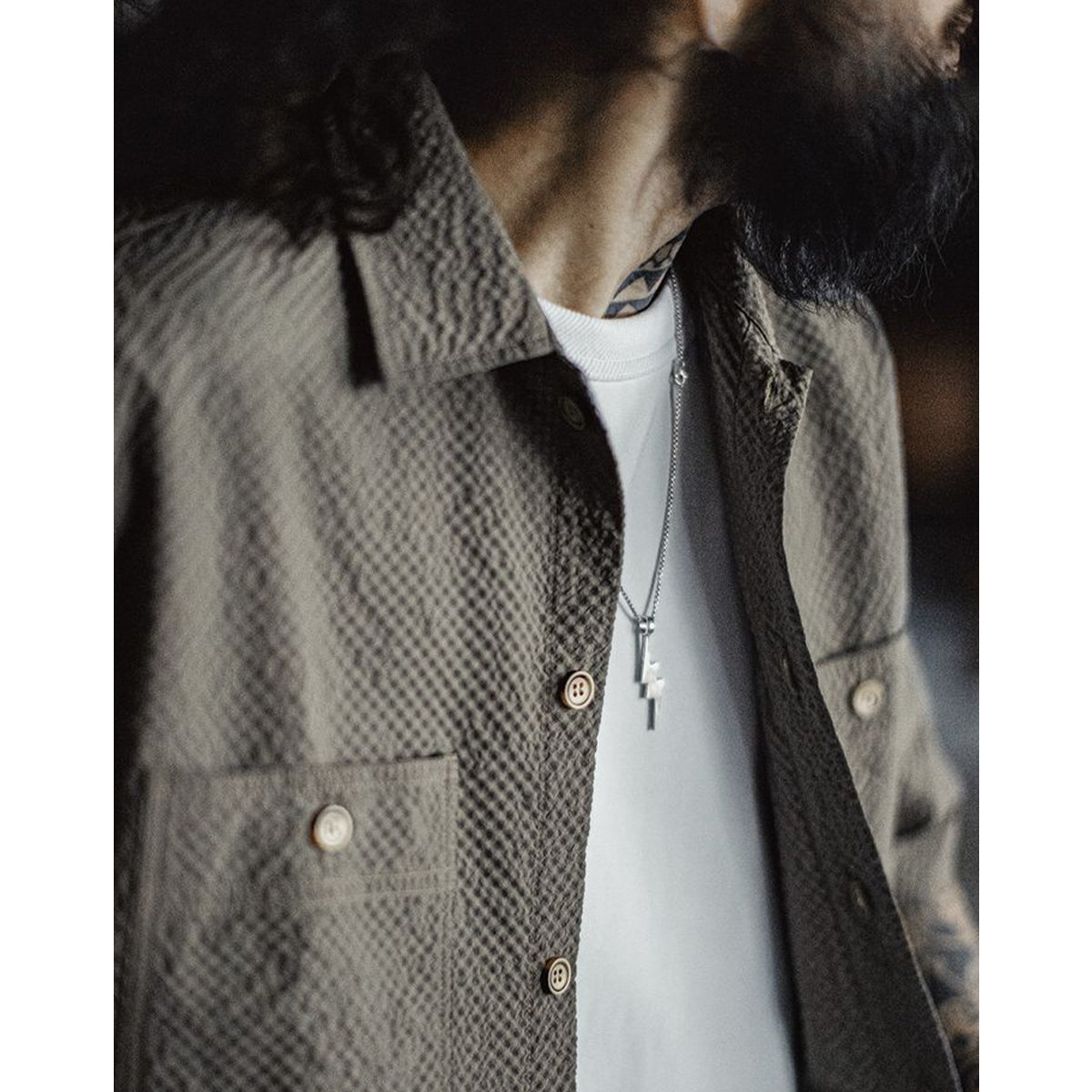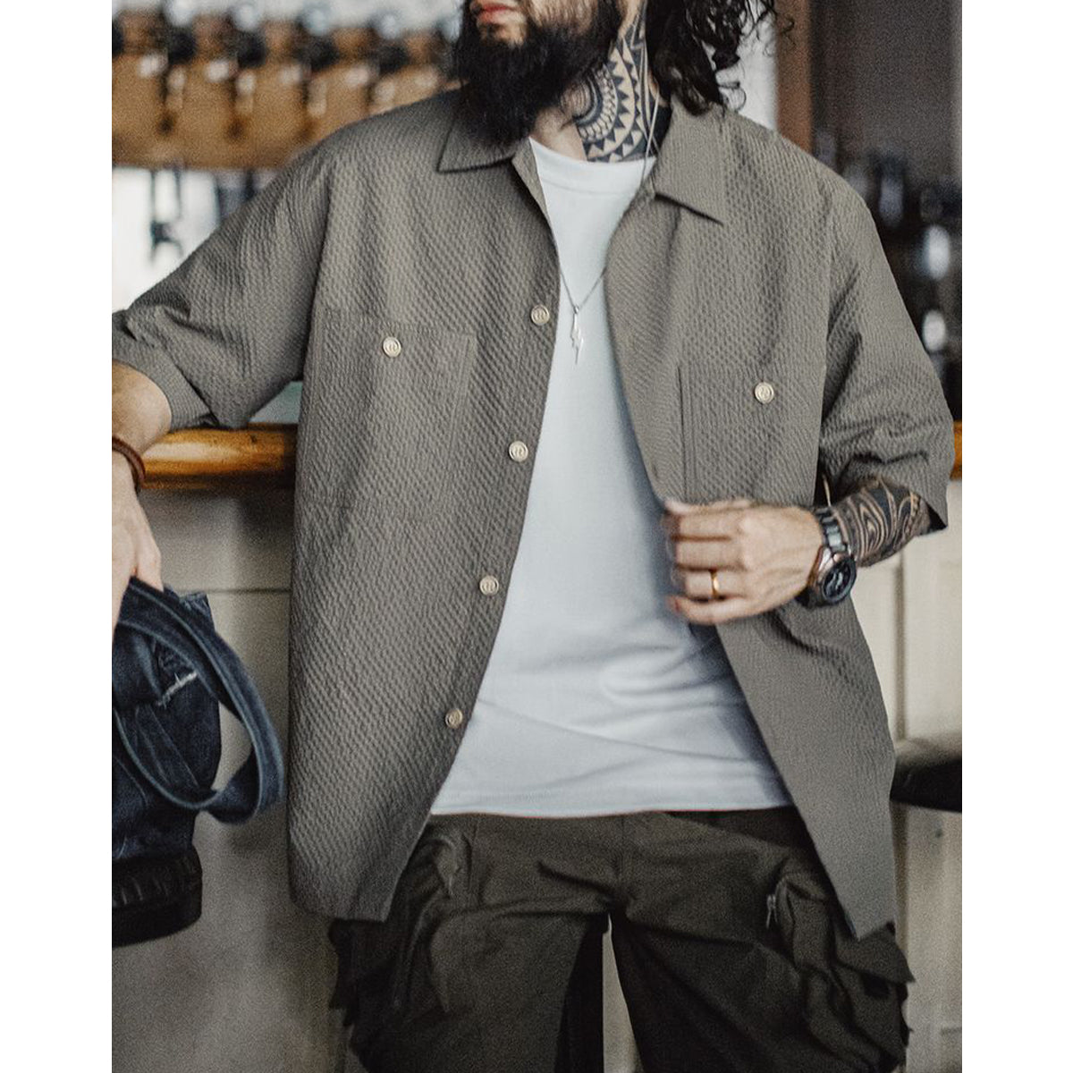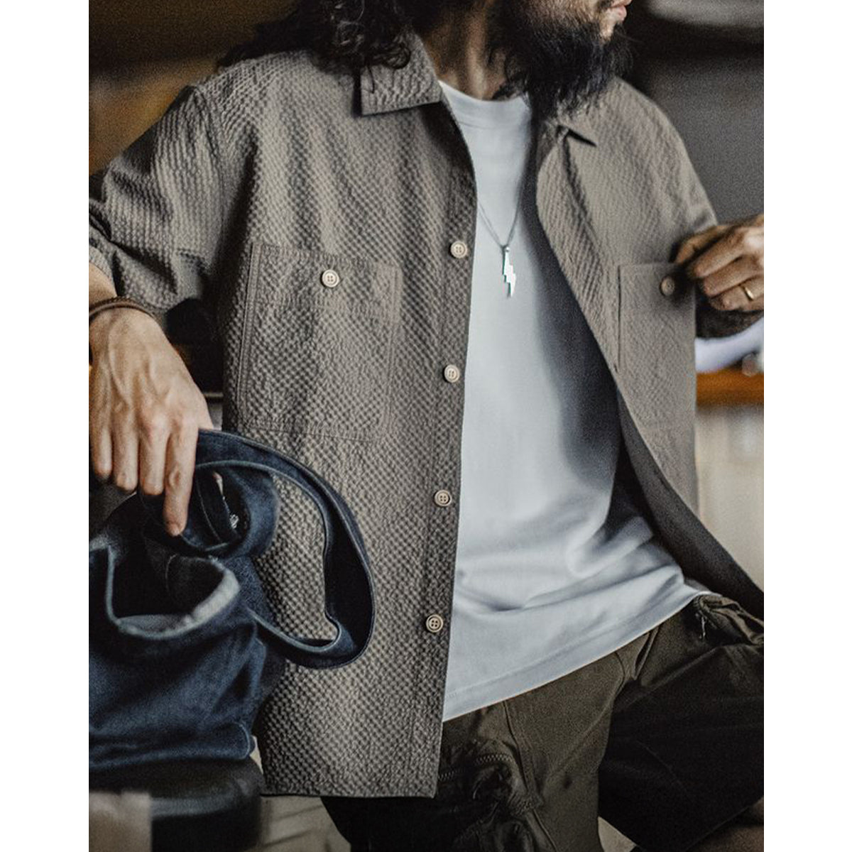 전면에 큰 포켓과 은은한 버튼, 목각 태그·주름 디테일, 맞춤 시어서커 원단, 캐주얼 코디가 특징입니다.