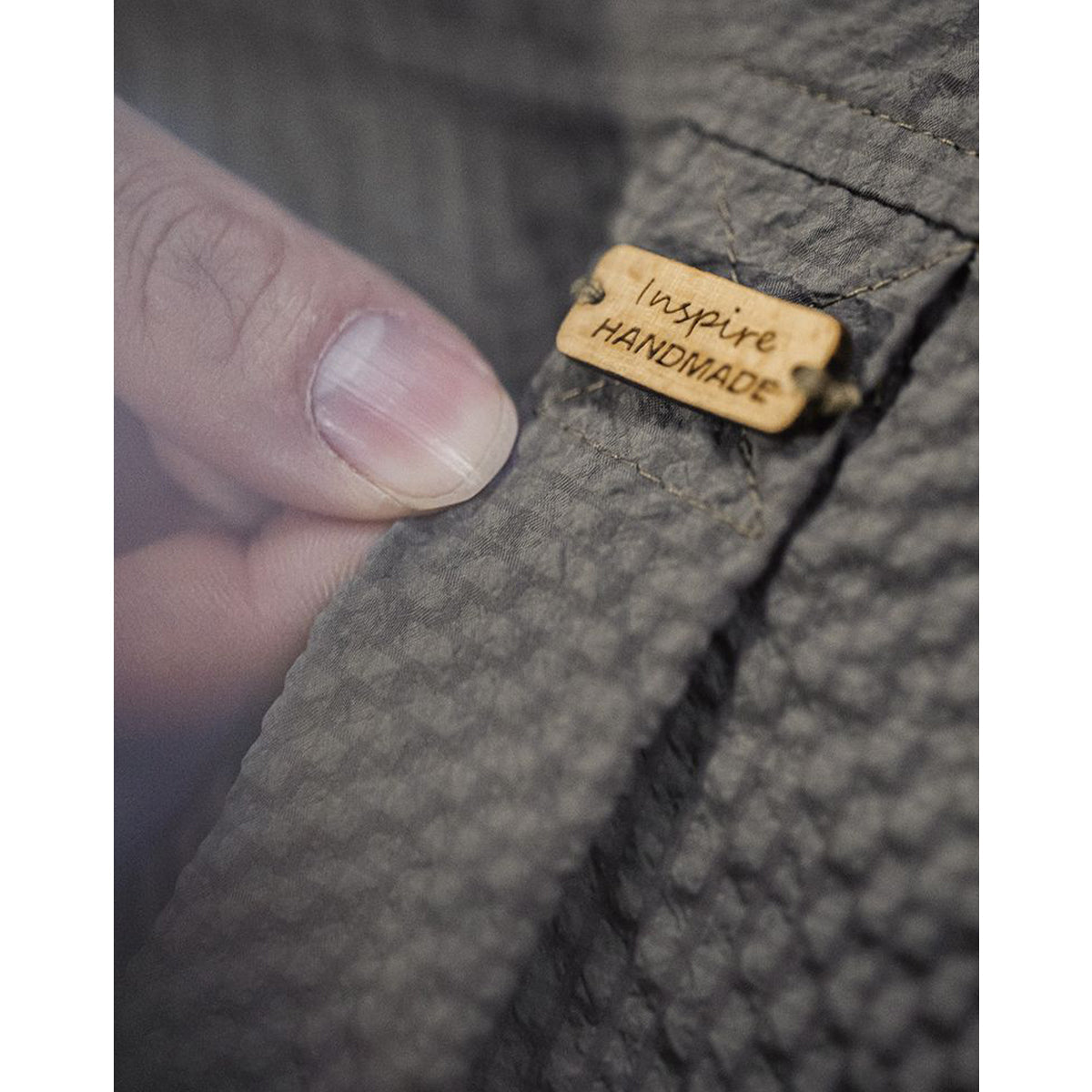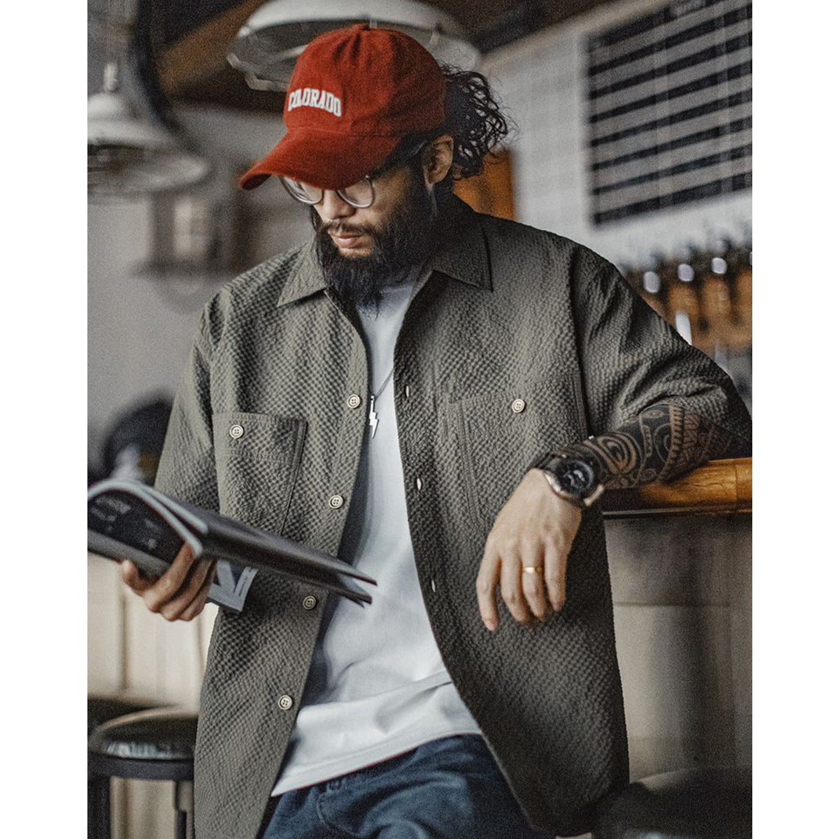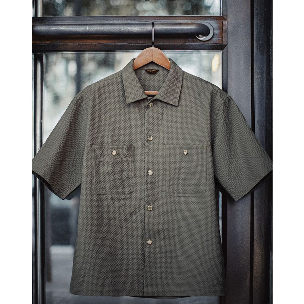 전면에 큰 포켓과 은은한 버튼, 목각 태그·주름 디테일, 맞춤 시어서커 원단, 캐주얼 코디가 특징입니다.