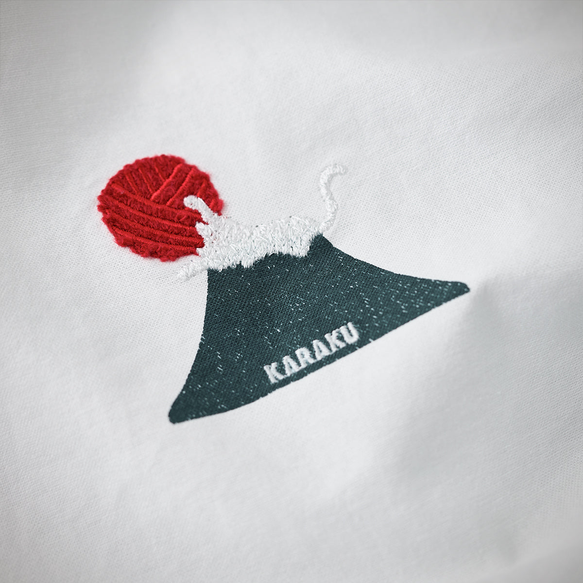 처음 보면 후지산에 떠오르는 아침 풍경처럼 보이지만, 자세히 보면 산꼭대기에 앉은 하얀 고양이가 빨간 털실 뭉치로 노는 모습이 포인트입니다.