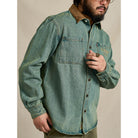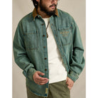 코듀로이 배색 칼라와 레트로 프린트 포켓이 특징인 데님 워크 셔츠로, 클래식과 현대적 감각을 동시에 살린 스타일리시한 아이템입니다.