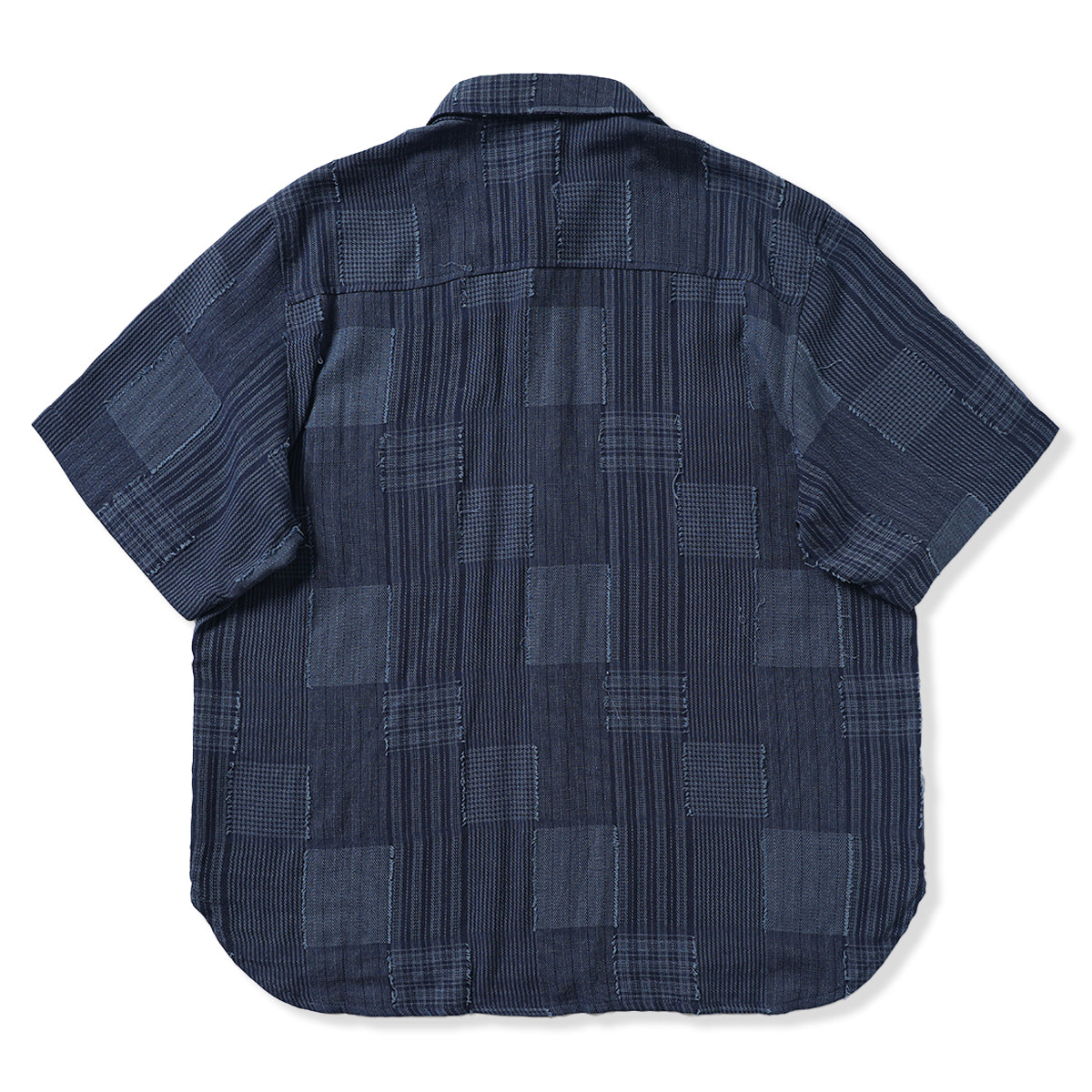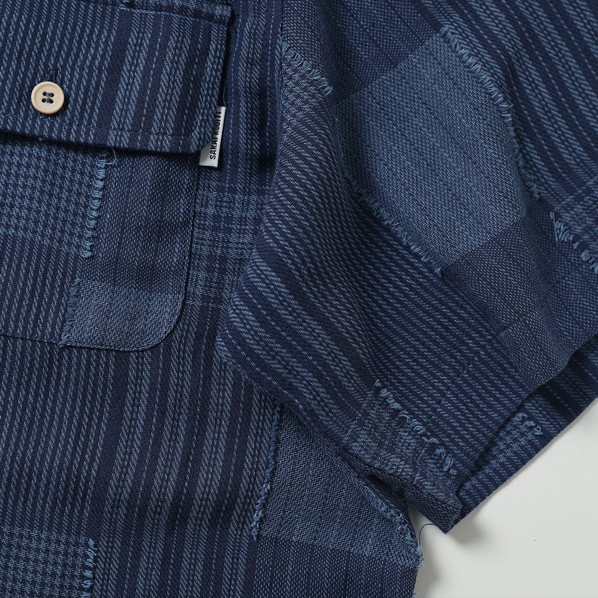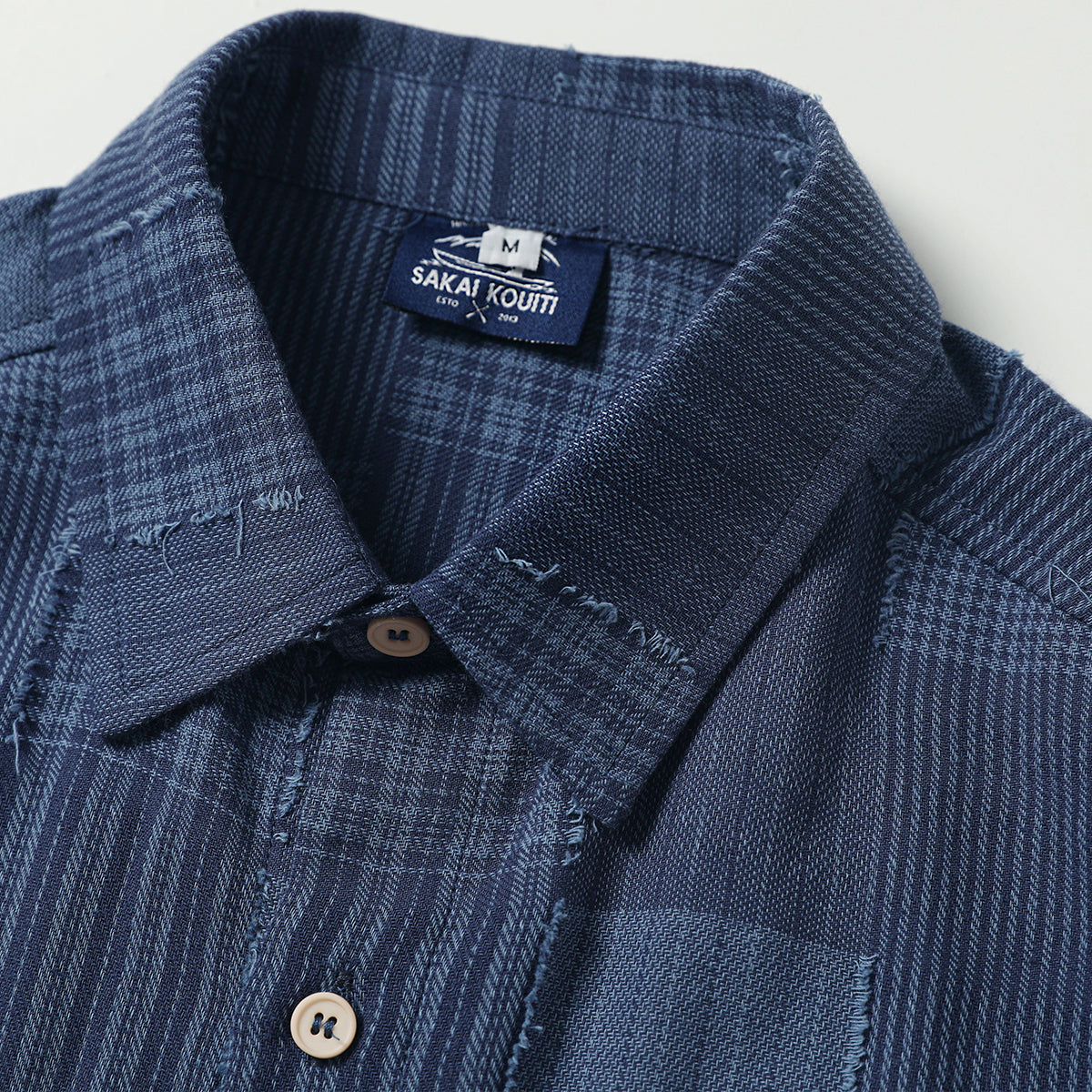 다양한 패턴의 사각 패치와 헤짐 디테일이 돋보이는 셔츠로, 인디고 블루 톤과 우드 버튼이 조화를 이루며 라운드 컷 밑단으로 편안한 착용감을 제공합니다.