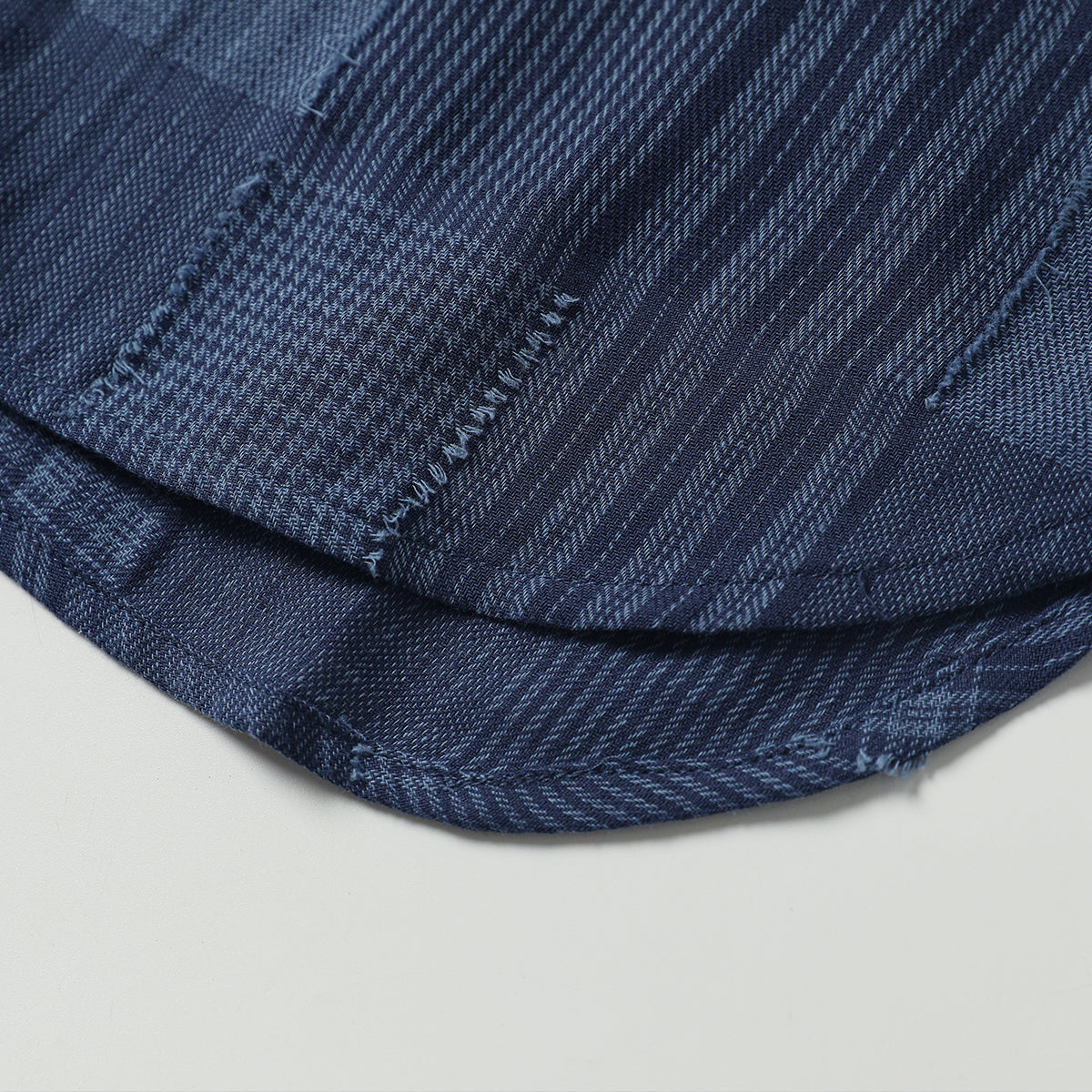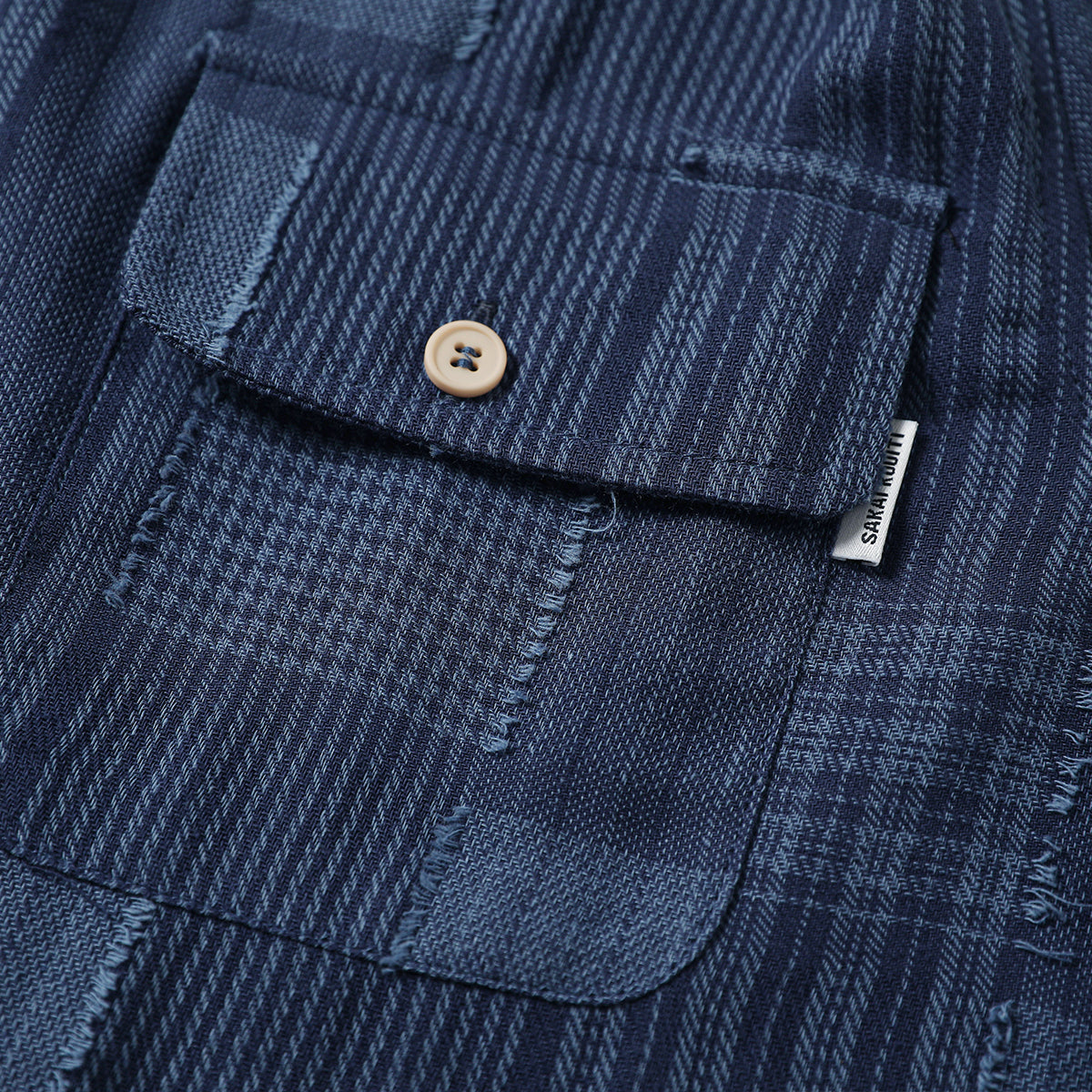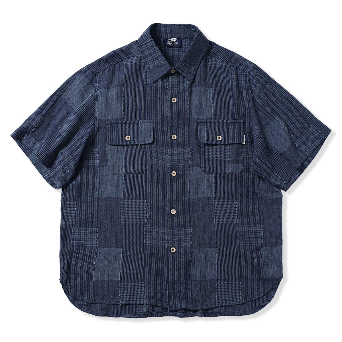 다양한 패턴의 사각 패치와 헤짐 디테일이 돋보이는 셔츠로, 인디고 블루 톤과 우드 버튼이 조화를 이루며 라운드 컷 밑단으로 편안한 착용감을 제공합니다.