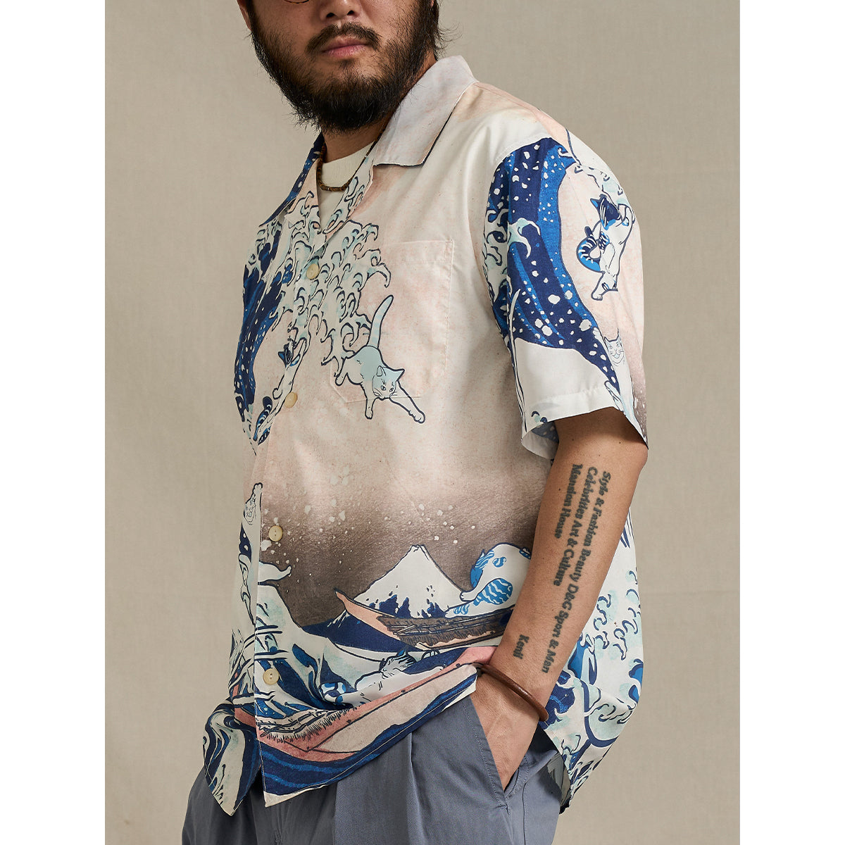 호쿠사이 파도에 고양이를 더한 유쾌한 패러디 셔츠, 시원하고 감각적인 착용감입니다.
