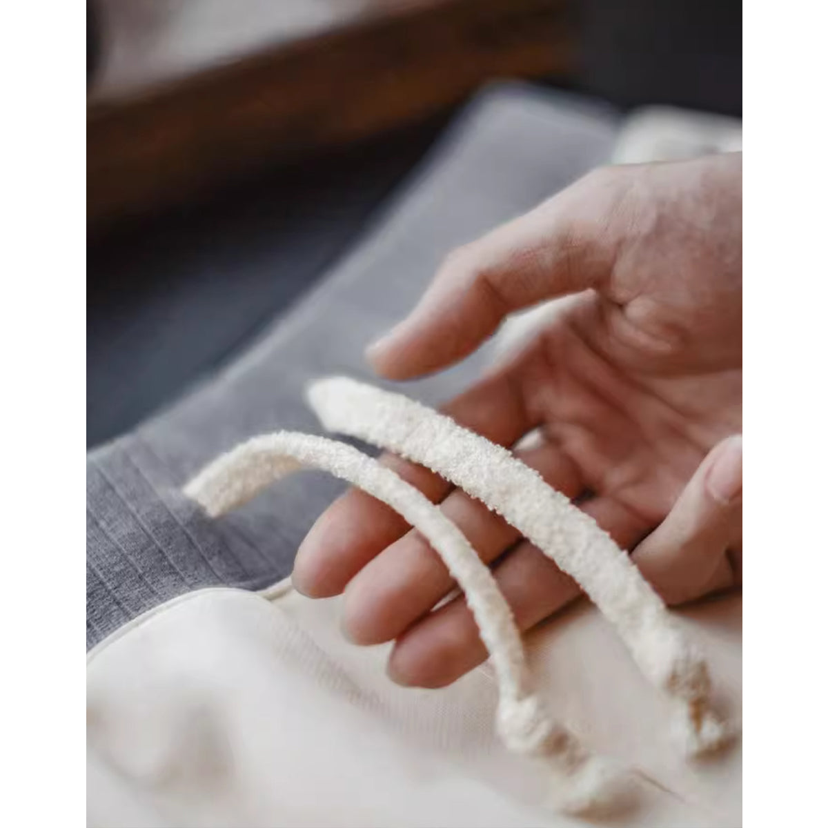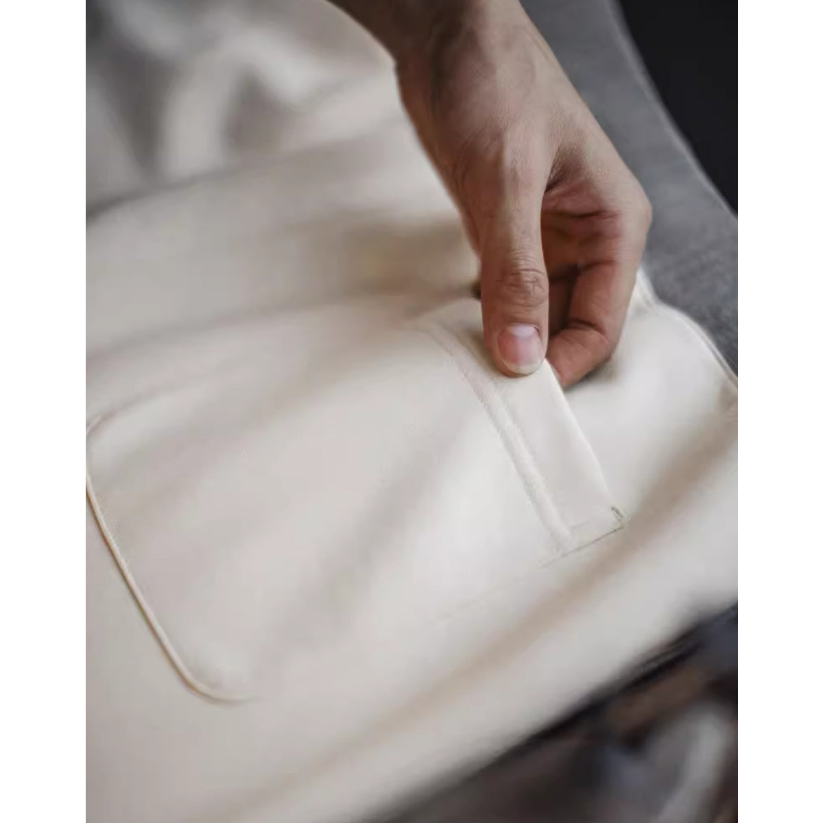 사이드 포켓에도 그레이 파이핑이 더해져 허리 부분의 색상과 통일감을 주며, 포켓의 시각적인 포인트를 돋보이게 합니다.