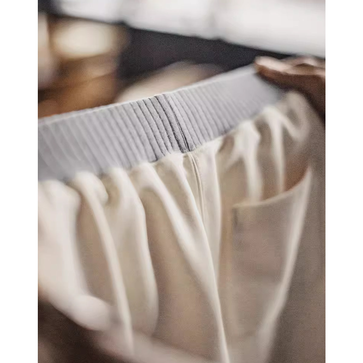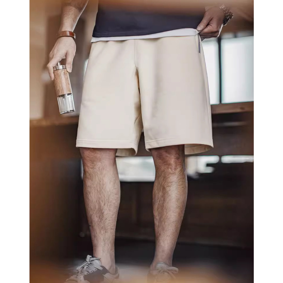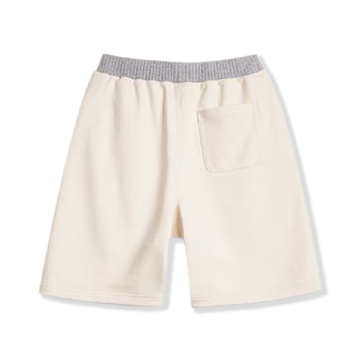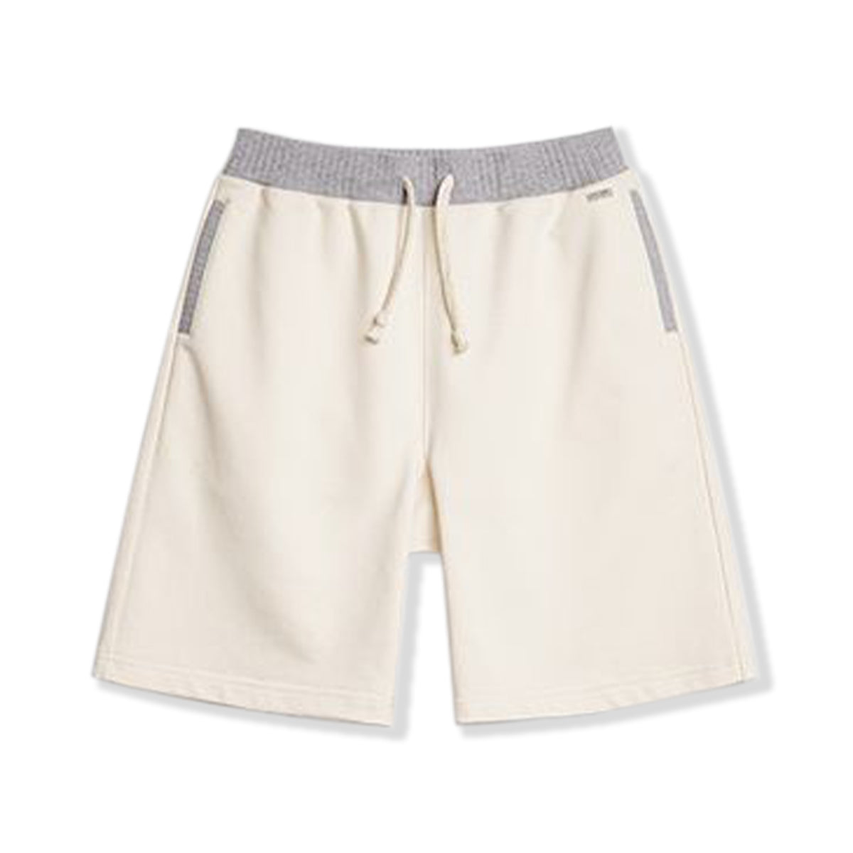허리 부분에 그레이 색상의 리브가 적용되어 팬츠 본체인 베이지와 대비를 이루며 시각적인 포인트를 주는 반바지입니다.