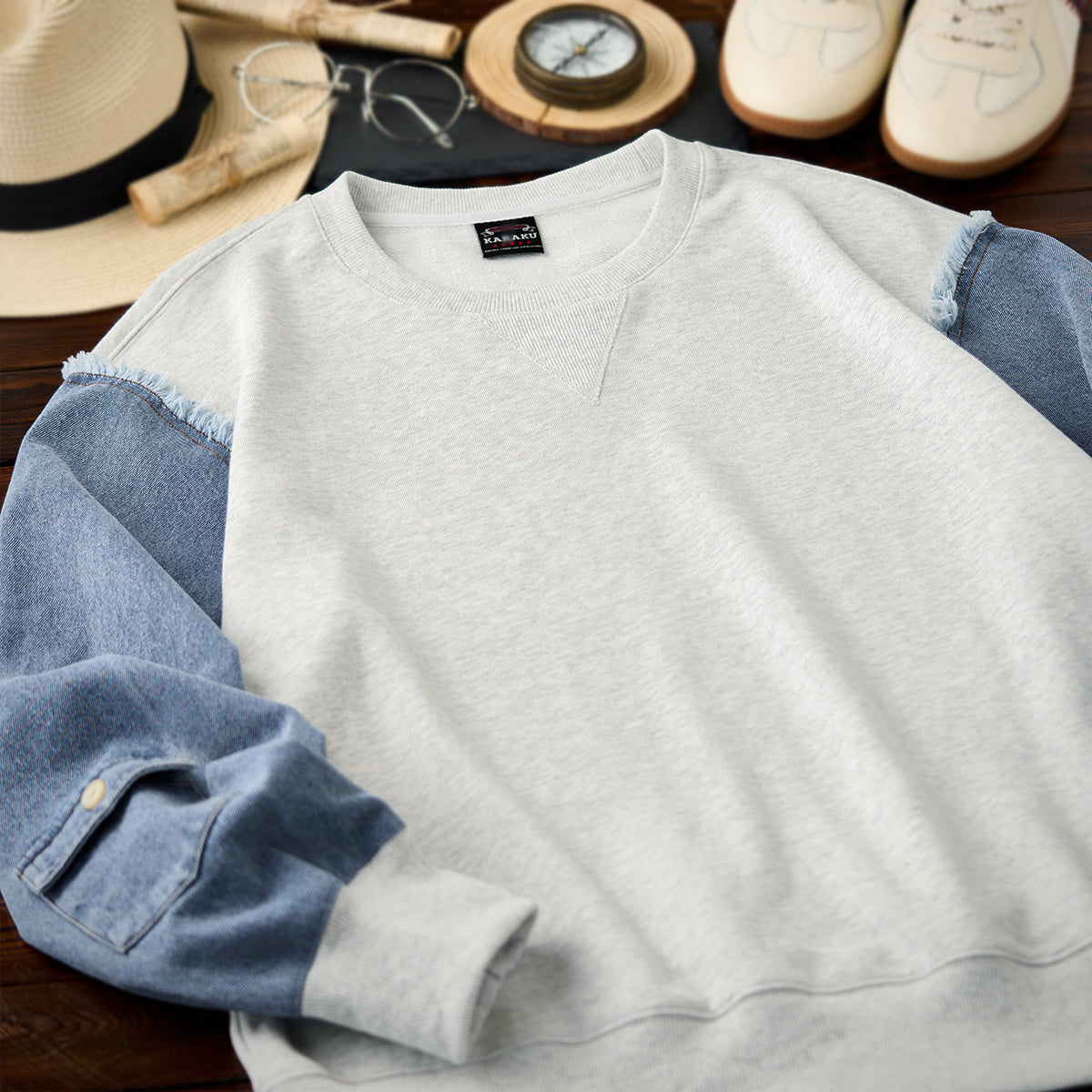 소매 페이즐리 패턴 자카드 데님 배색 워시드 V거셋 스웨트