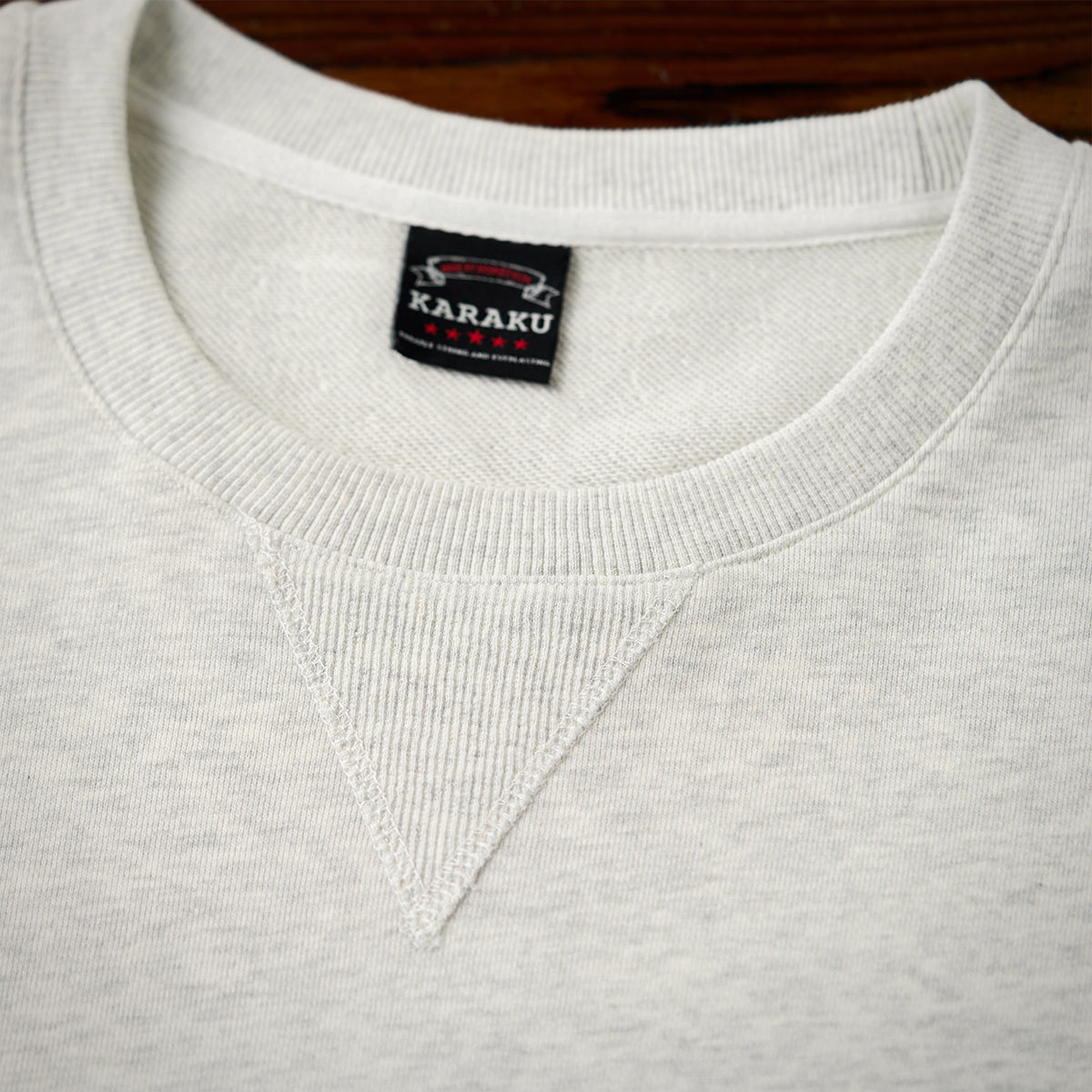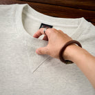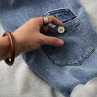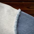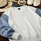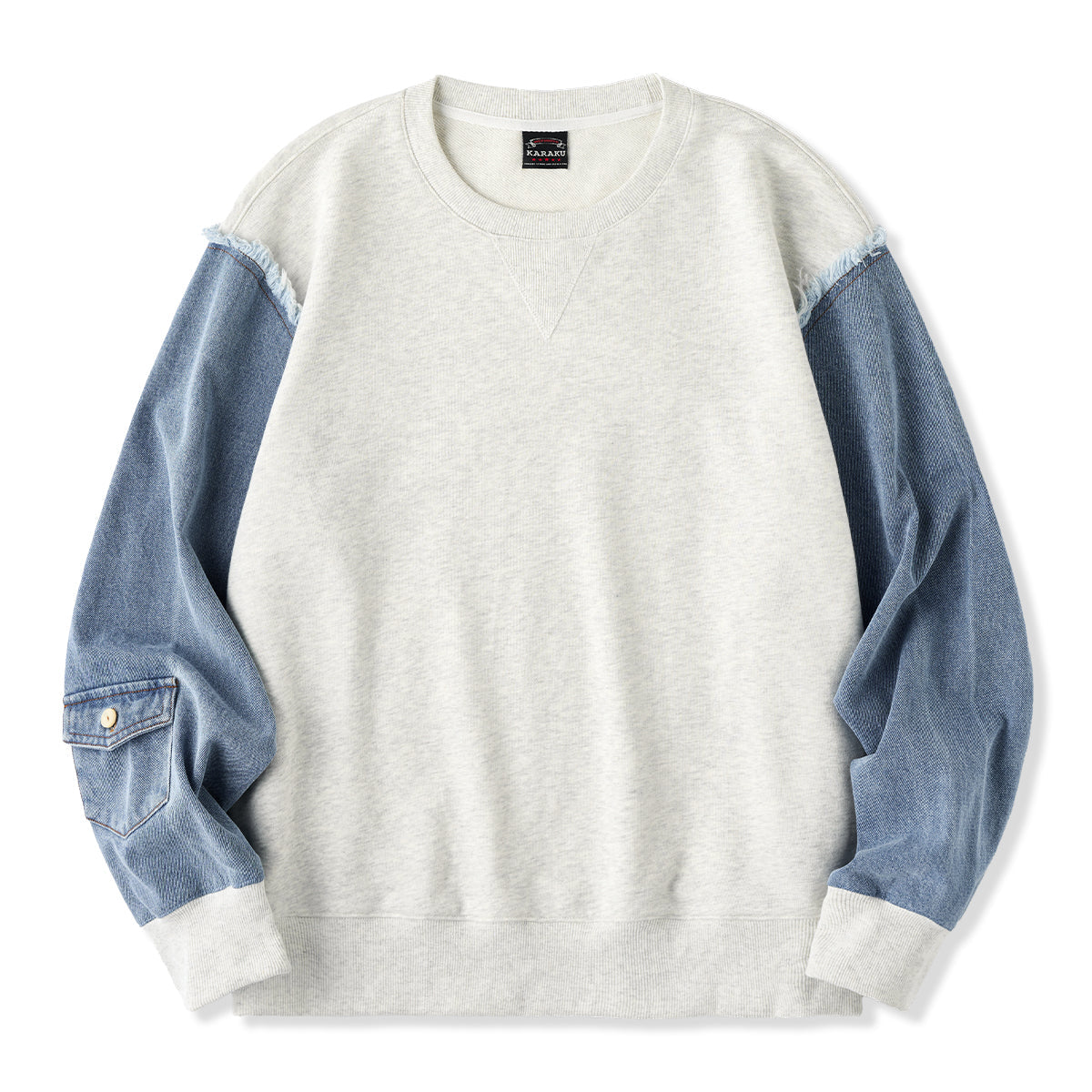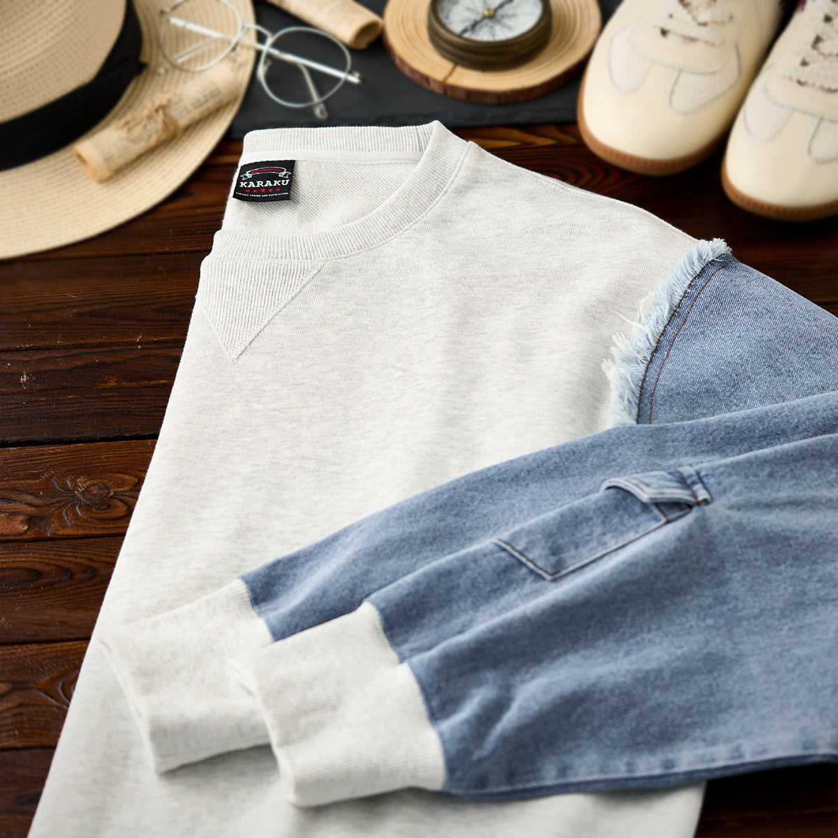 넥 V자 패널과 데님 배색 소매가 돋보이는 빈티지 캐주얼 스웨트셔츠. 소매 버튼 포켓과 어깨 프린지 디테일로 유니크한 매력을 더했습니다.