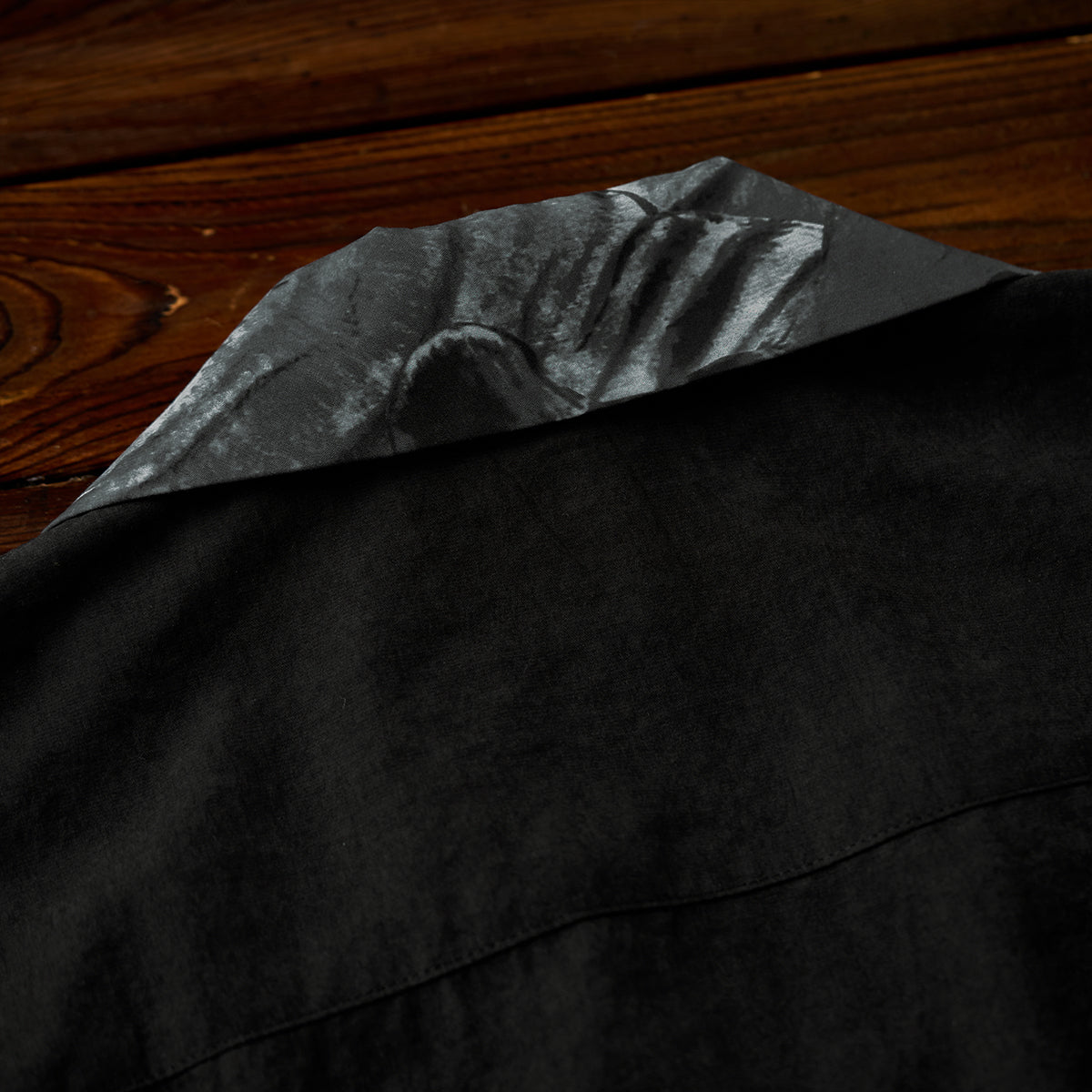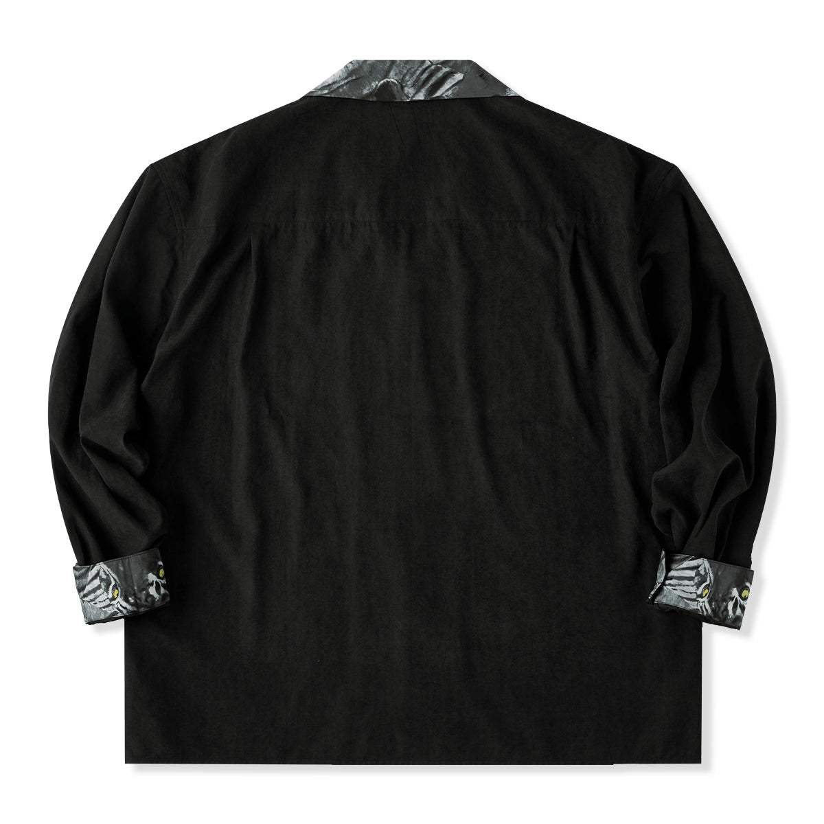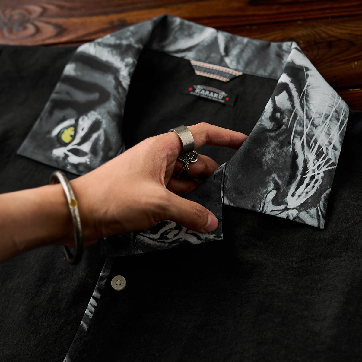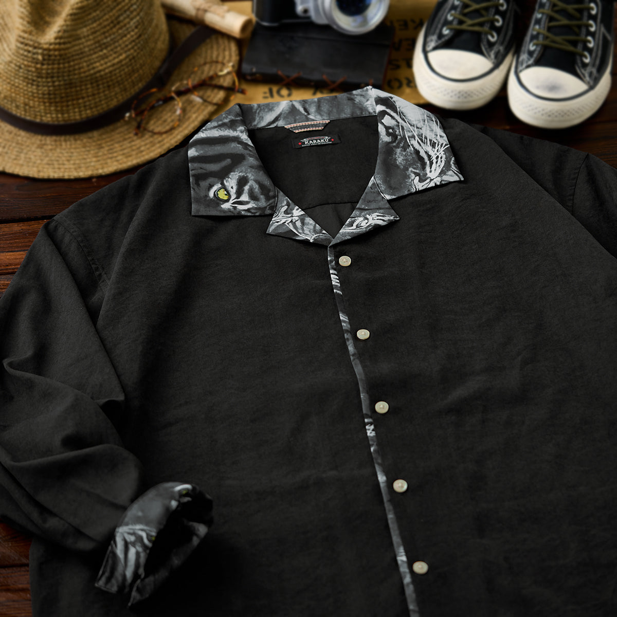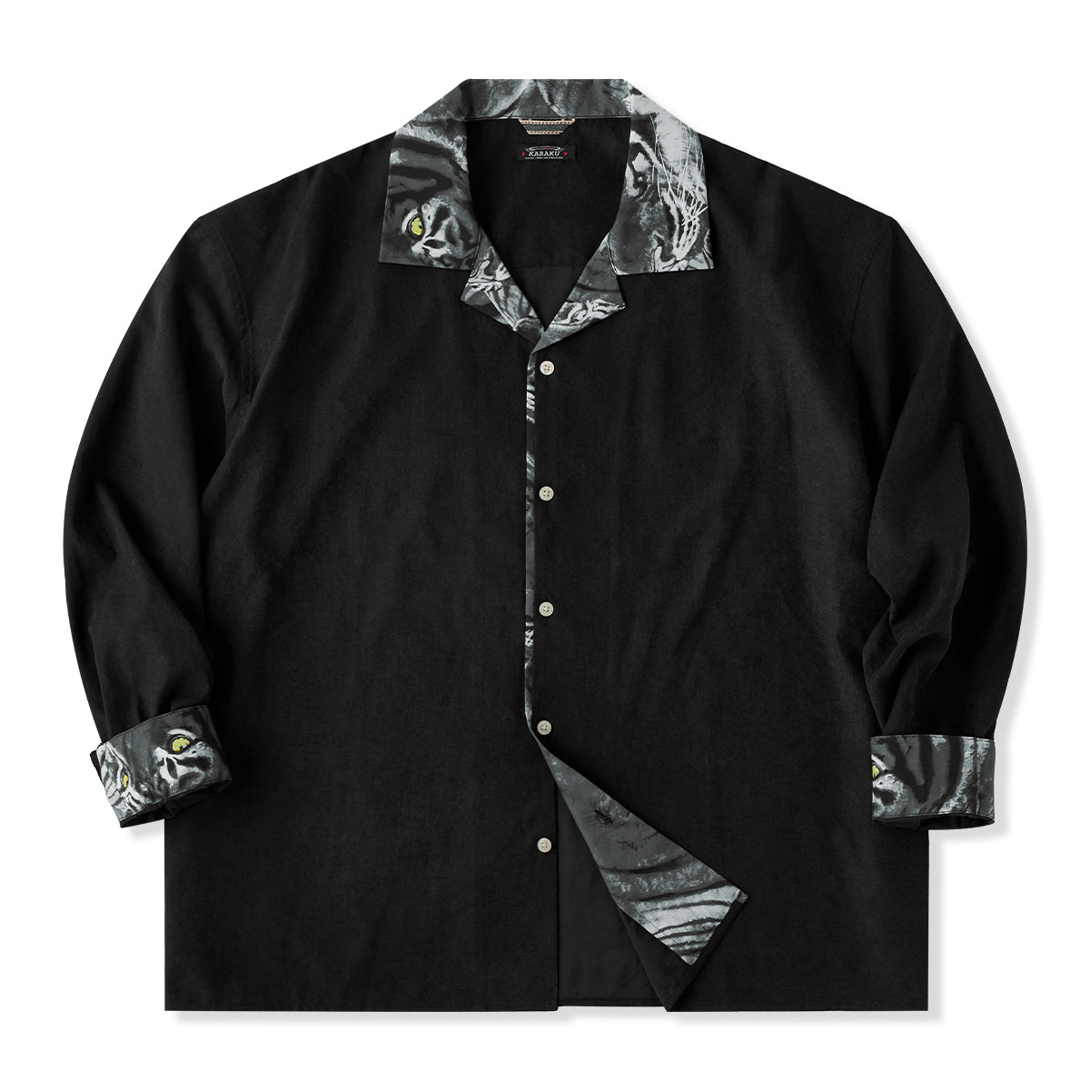 일본화가 카와마타 사토시(川又聡)의 대표작 『호랑이 그림(虎図)』을 모티브로 제작된 특별한 프린트 오픈 칼라 셔츠입니다.